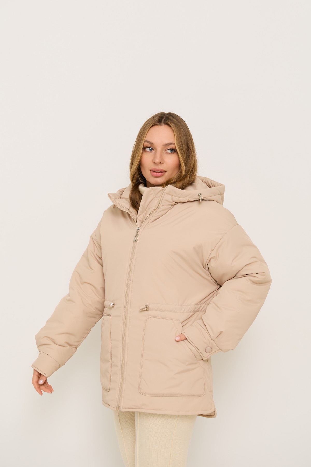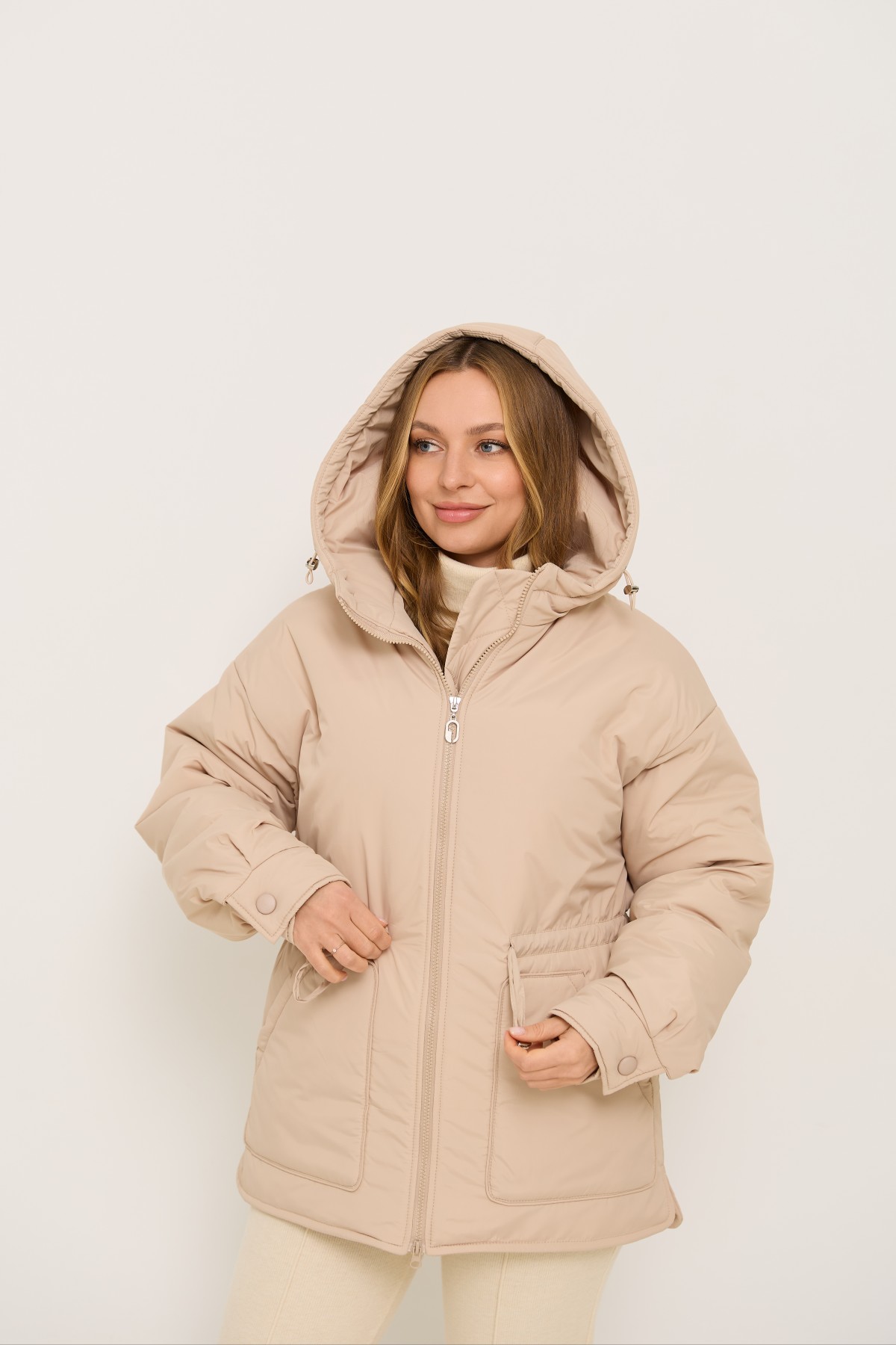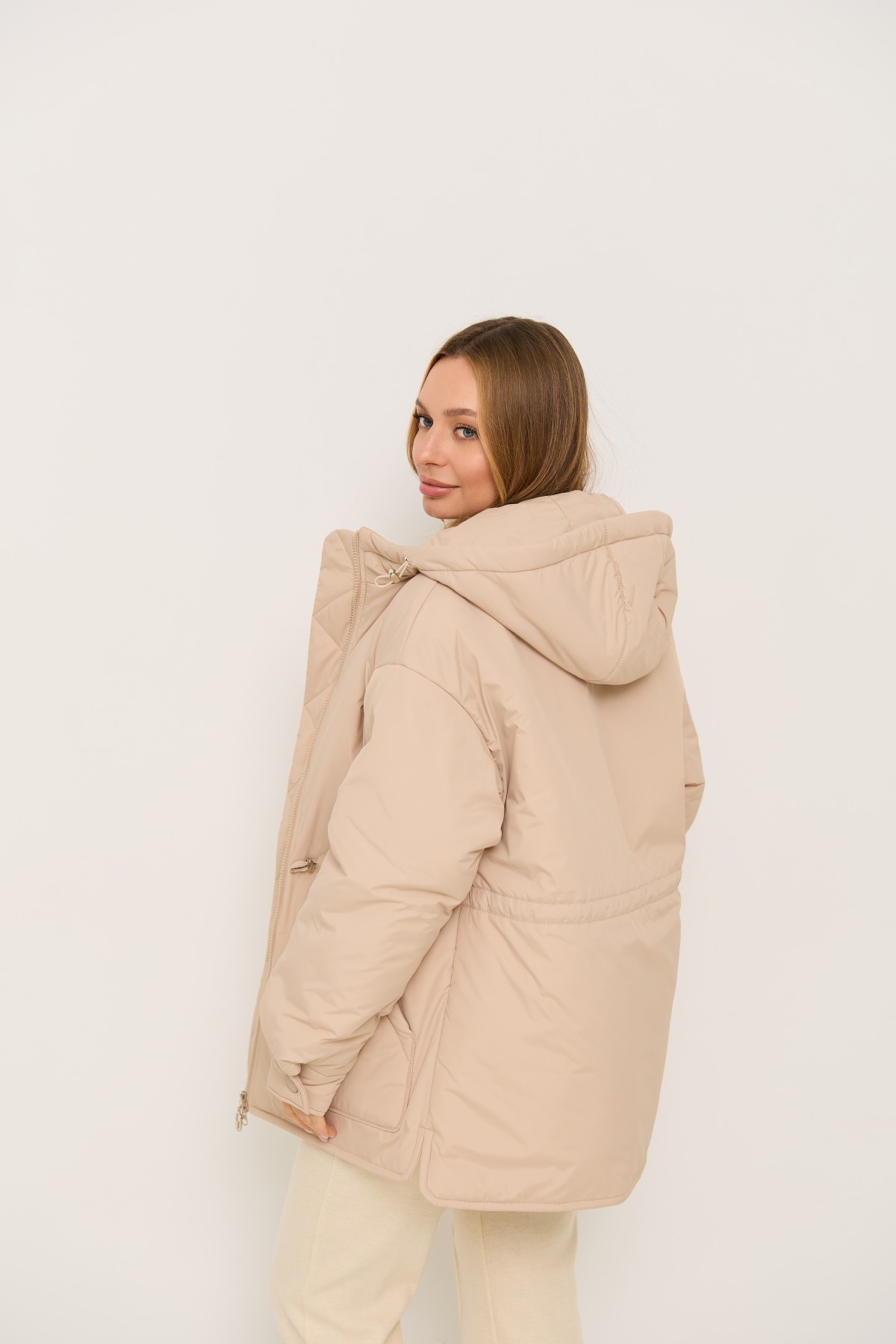 Хіт сезону - куртка крою "oversize" зі спущеним рукавом та капюшоном, прямого силуету у стилі кежуал. Довжина виробу нижче лінії стегна, низ із закругленими бічними розрізами. Центральна застібка - на блискавці. Капюшон, який регулюється по висоті лаштункою з фіксатором. Рукав спущений – вільний, понизу на манжеті, застібається на декоративну кнопку.