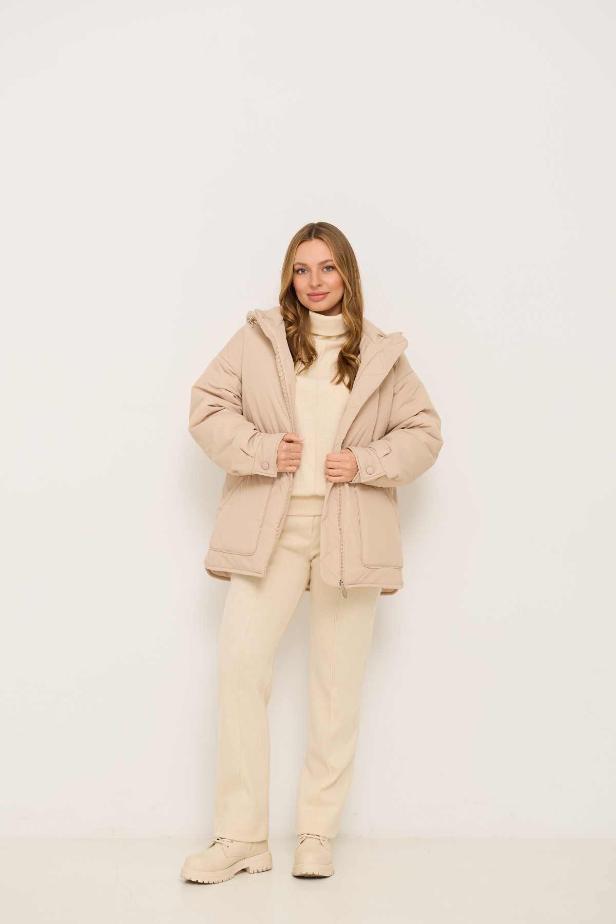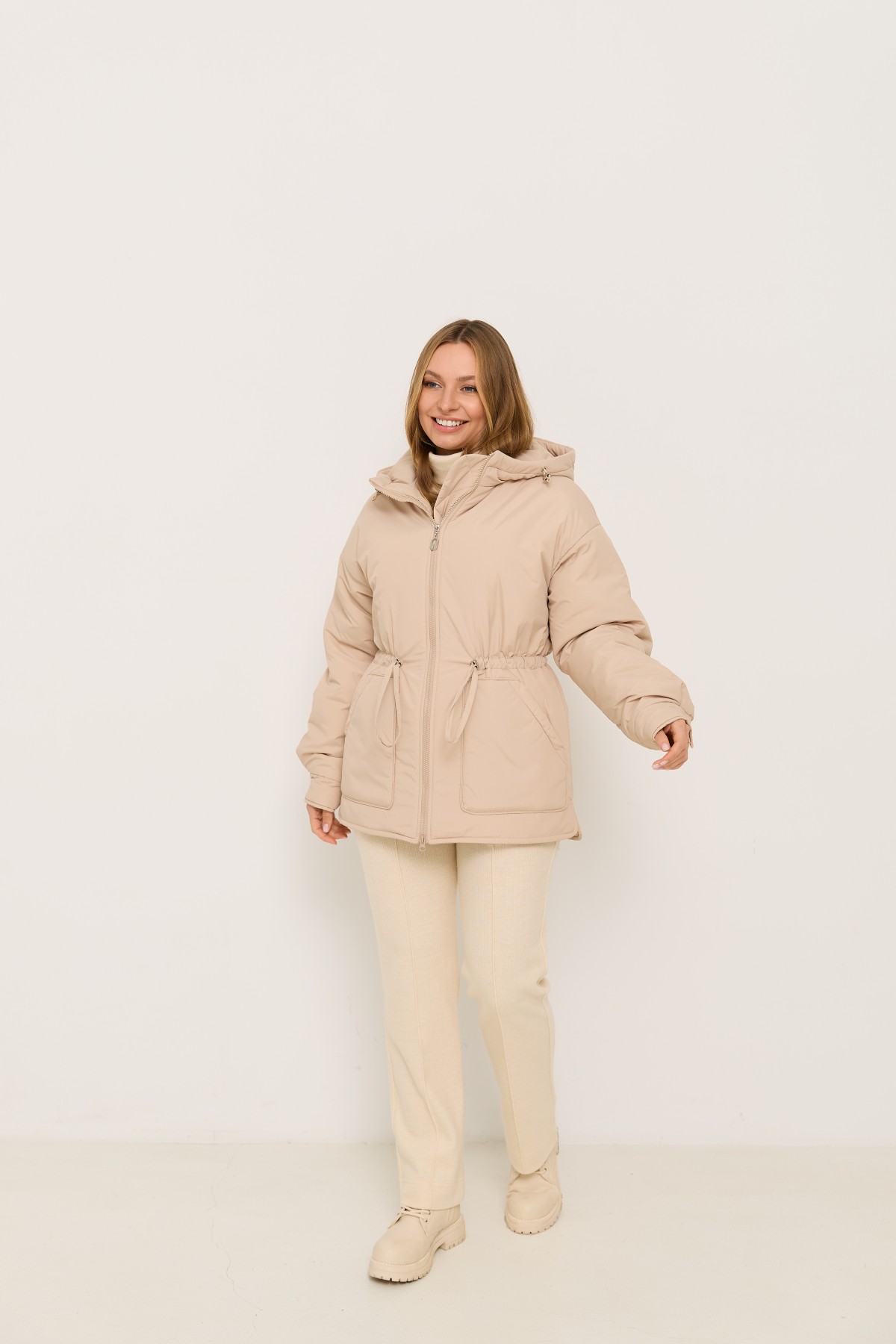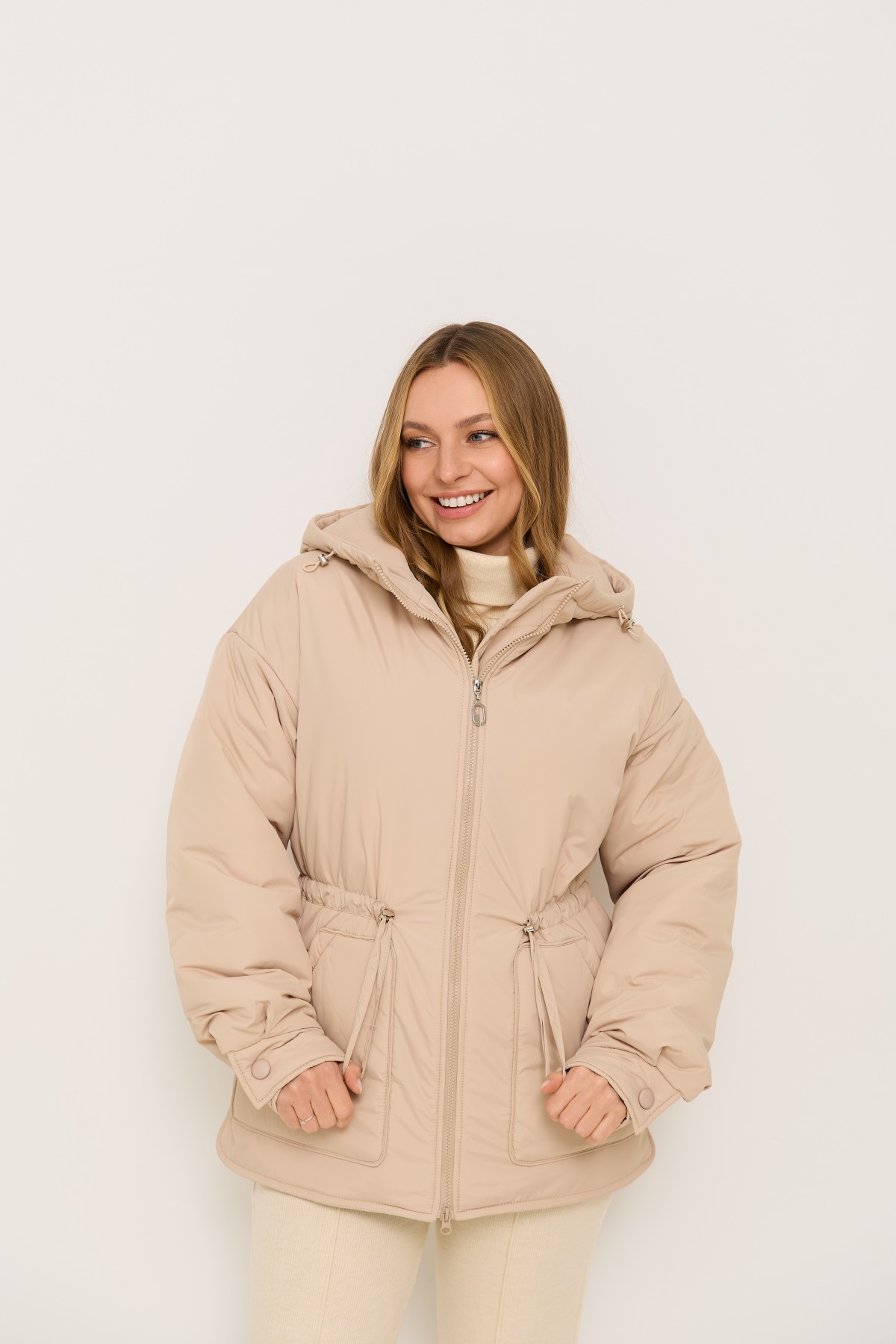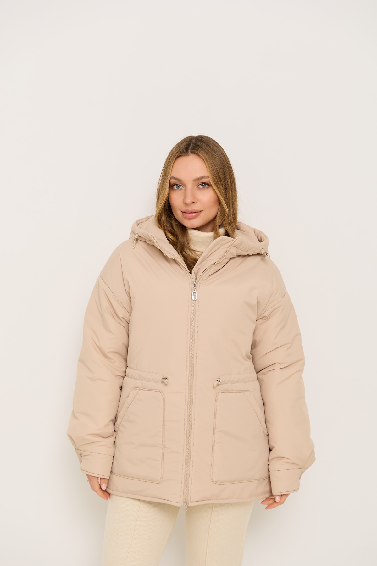 Хіт сезону - куртка крою "oversize" зі спущеним рукавом та капюшоном, прямого силуету у стилі кежуал. Довжина виробу нижче лінії стегна, низ із закругленими бічними розрізами. Центральна застібка - на блискавці. Капюшон, який регулюється по висоті лаштункою з фіксатором. Рукав спущений – вільний, понизу на манжеті, застібається на декоративну кнопку.
