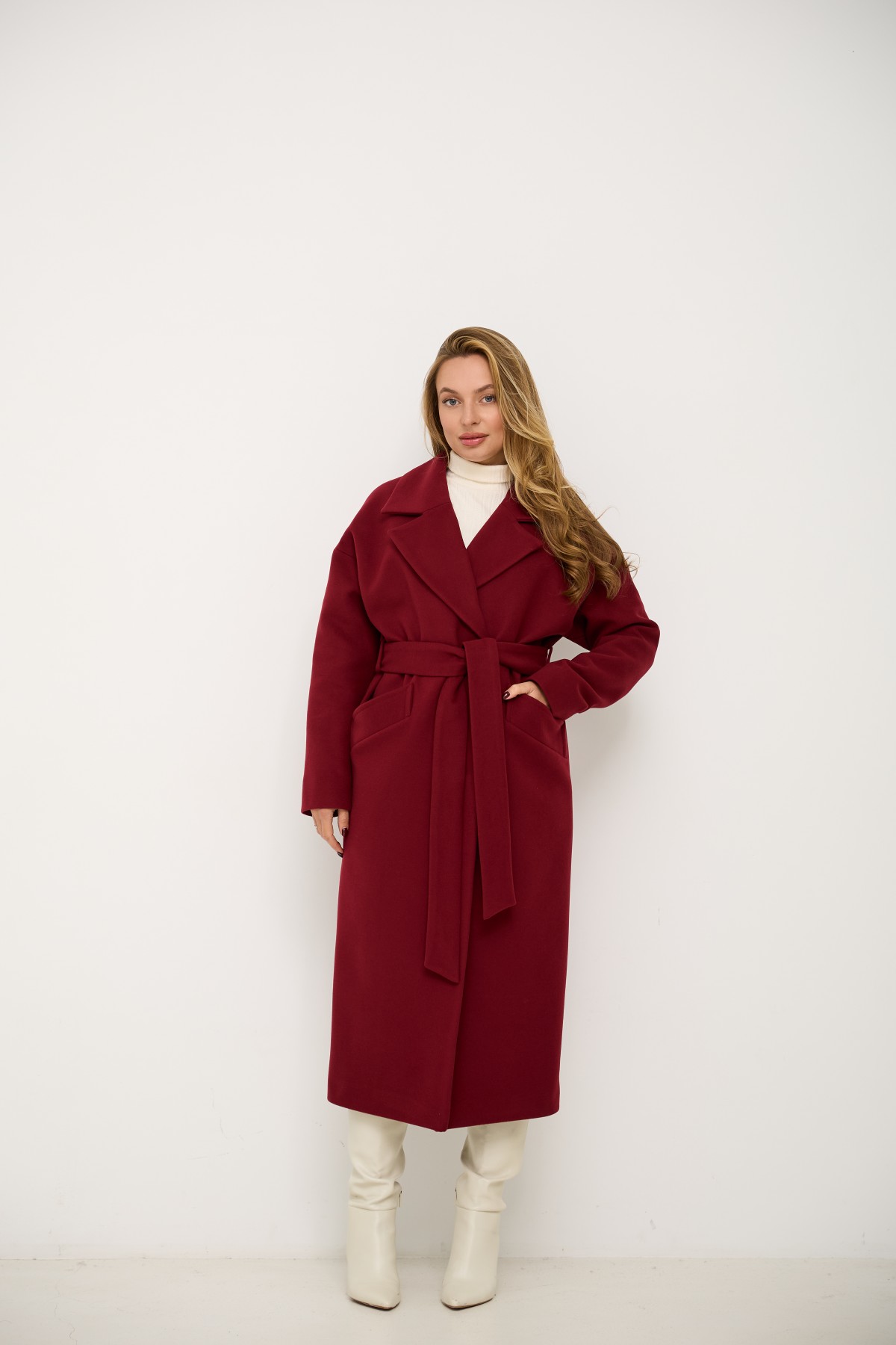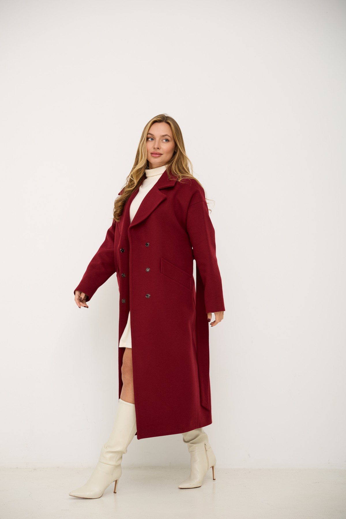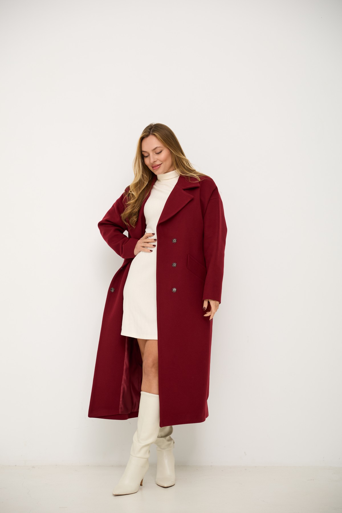 Стильне демісезонне пальто вільного крою "oversaze" зі спущеним плечем. Довжина пальто нижче колін.Двобортна застібка на кнопках. Англійський комір з лацканами та відкладним коміром. Кишеня прорізна з листочкою та клапаном. Пояс знімний з основної тканини.