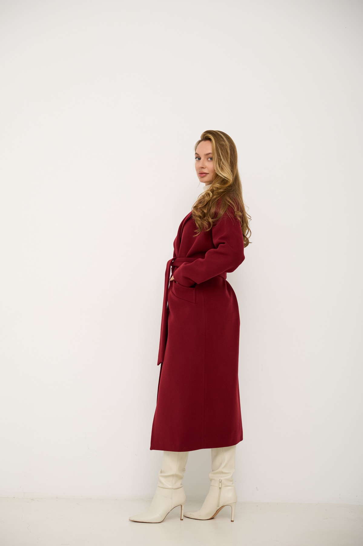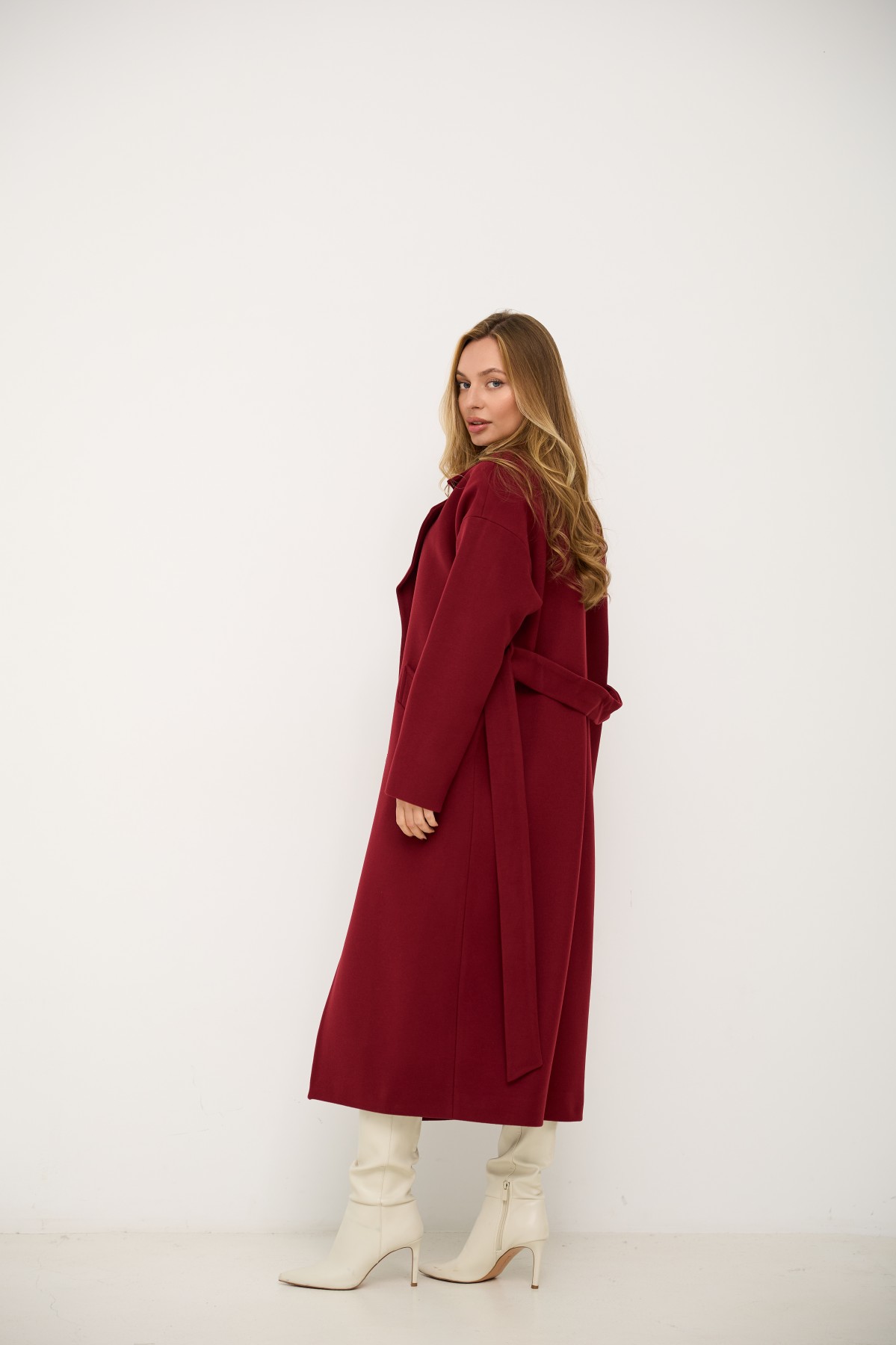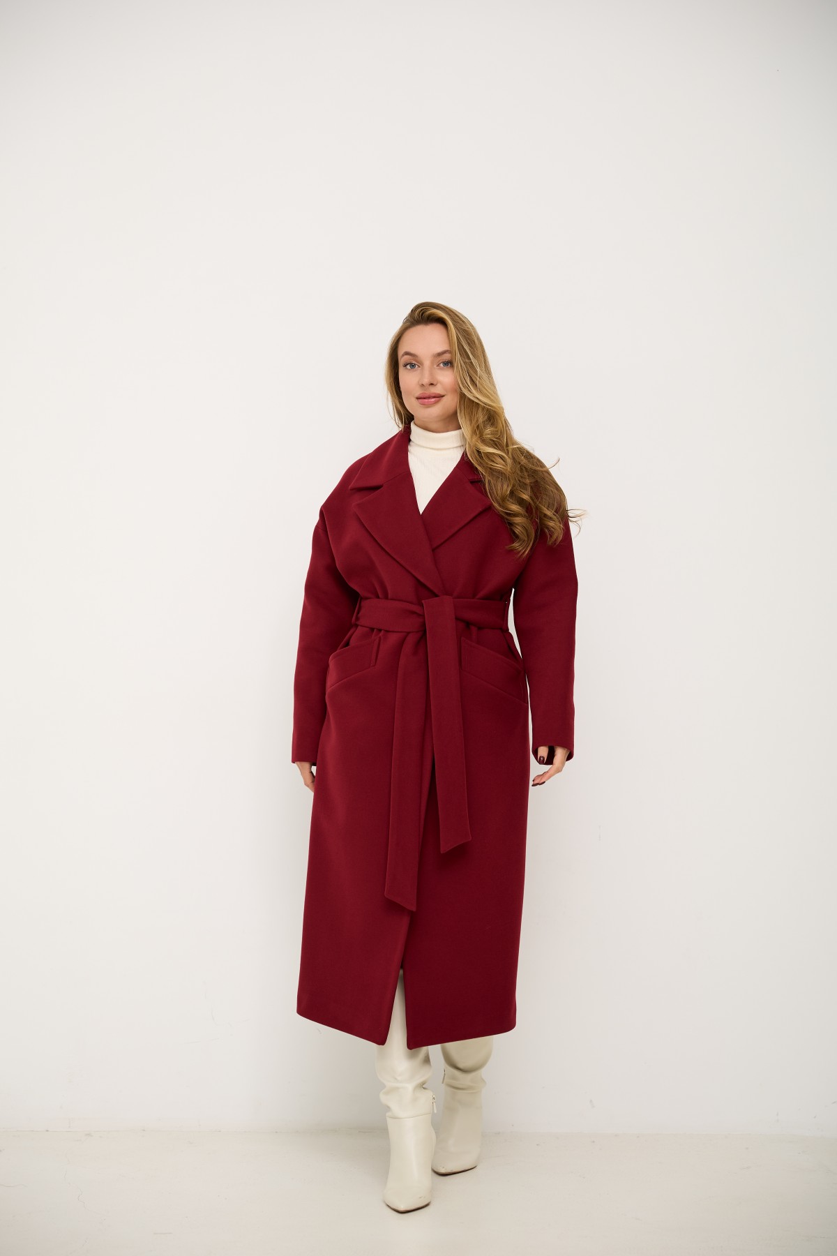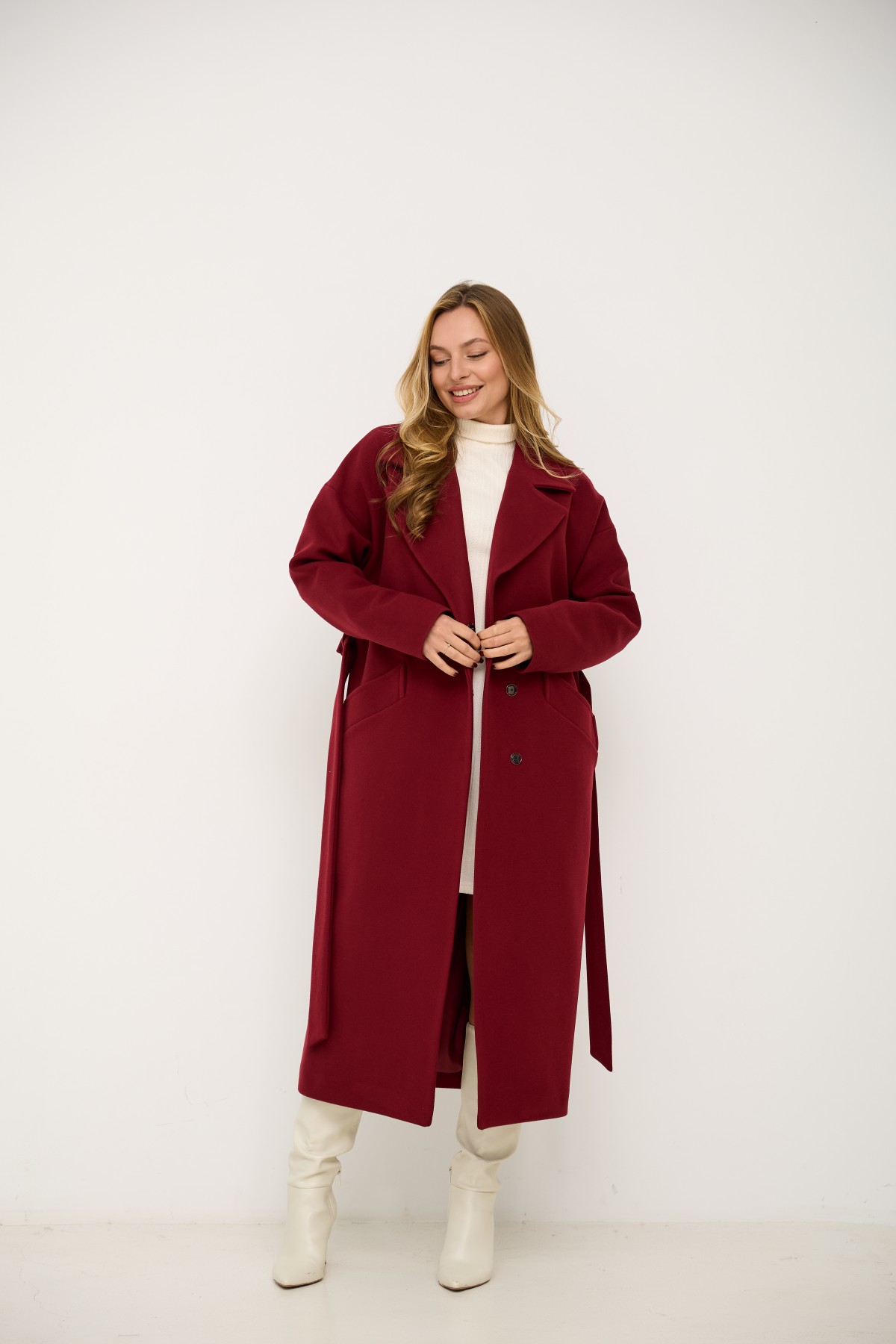 Стильне демісезонне пальто вільного крою "oversaze" зі спущеним плечем. Довжина пальто нижче колін.Двобортна застібка на кнопках. Англійський комір з лацканами та відкладним коміром. Кишеня прорізна з листочкою та клапаном. Пояс знімний з основної тканини.