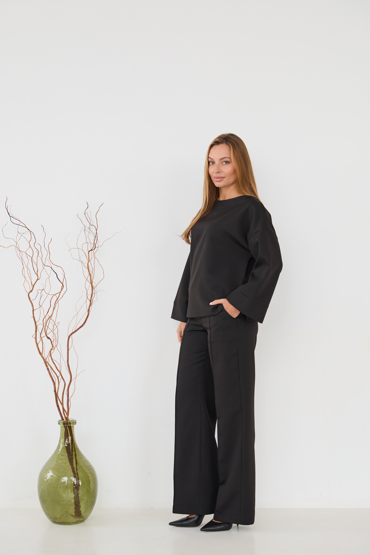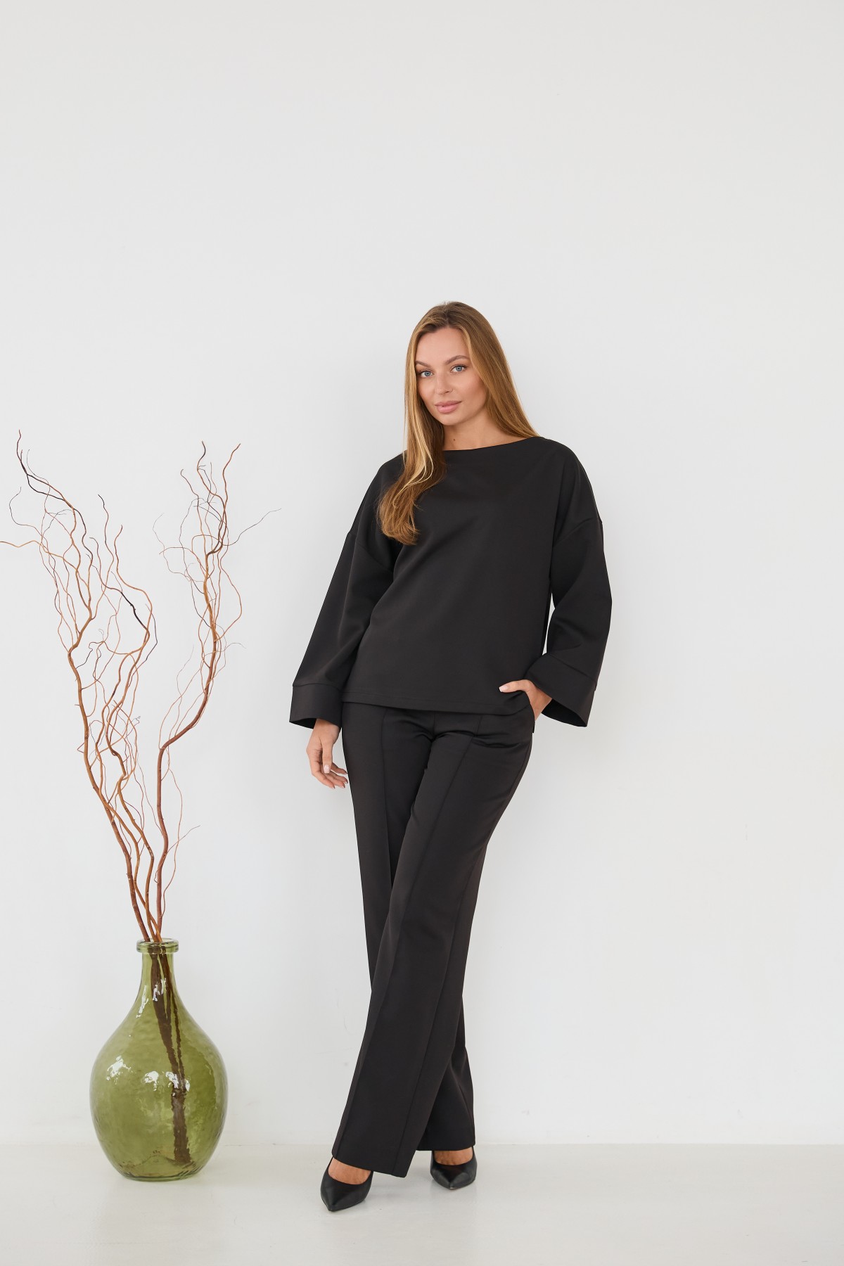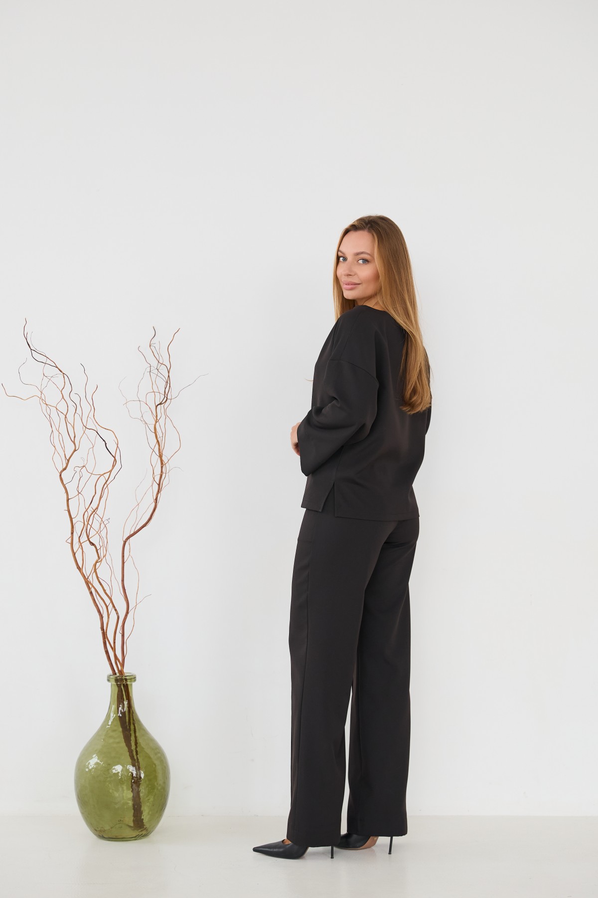 Свободна блуза з костюмної тканини "креп" з довгим рукавом 7/8, рукав по низу має широкий манжет, по боках блузи є розрізи, довжина блузи до бедра. Штани прямого класичного крою із застроченою стрілкою по центру переднього полотнища.Універсальна довжина штанів призначена для носіння під підбори, так і під взуття на низьких підборах.На штанах кишені зручно розташовані у підрізному бочці.На штанах пояс на резинці для кращої посадки брюк по фігурі.Класична вільного сілуету блуза з класичними брюками, підходить як для повсякденного офісного стилю, так і для класичного образу на вихід.