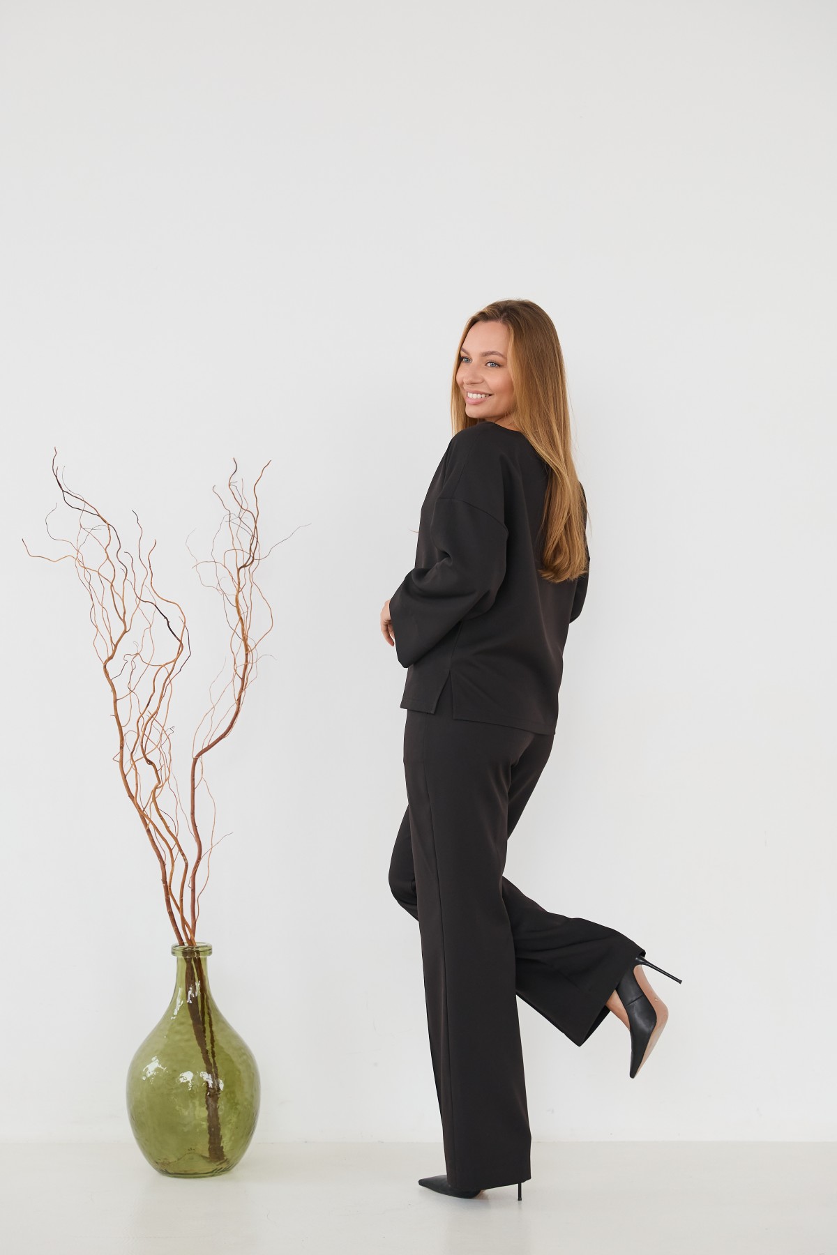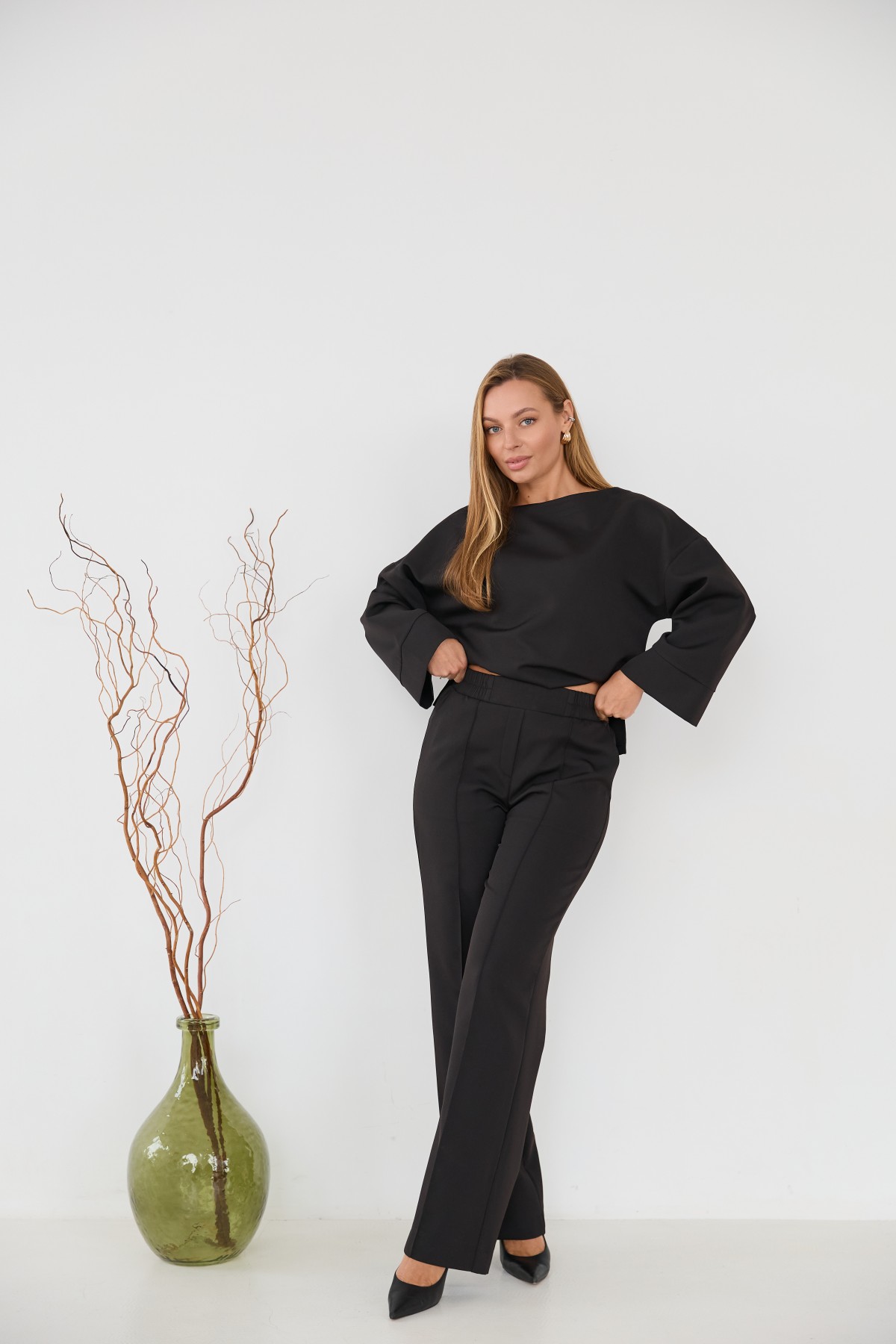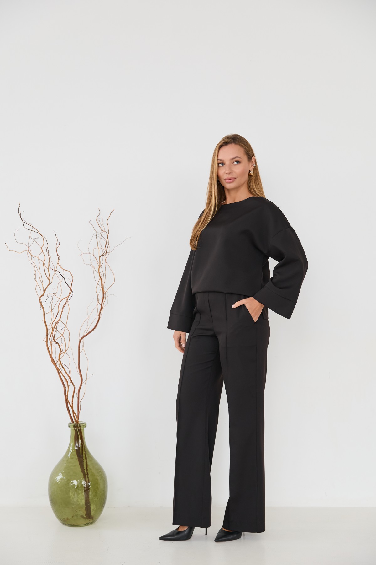 Свободна блуза з костюмної тканини "креп" з довгим рукавом 7/8, рукав по низу має широкий манжет, по боках блузи є розрізи, довжина блузи до бедра. Штани прямого класичного крою із застроченою стрілкою по центру переднього полотнища.Універсальна довжина штанів призначена для носіння під підбори, так і під взуття на низьких підборах.На штанах кишені зручно розташовані у підрізному бочці.На штанах пояс на резинці для кращої посадки брюк по фігурі.Класична вільного сілуету блуза з класичними брюками, підходить як для повсякденного офісного стилю, так і для класичного образу на вихід.
