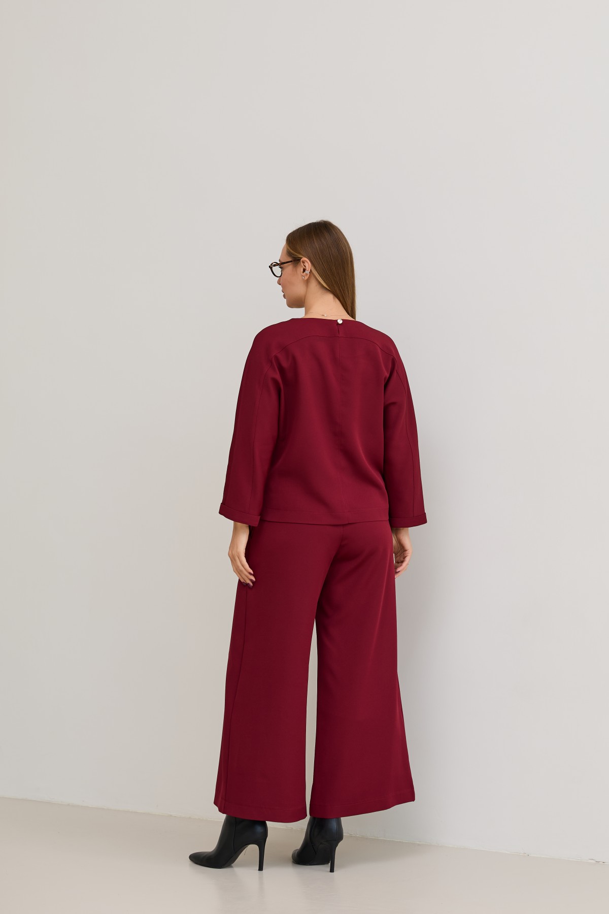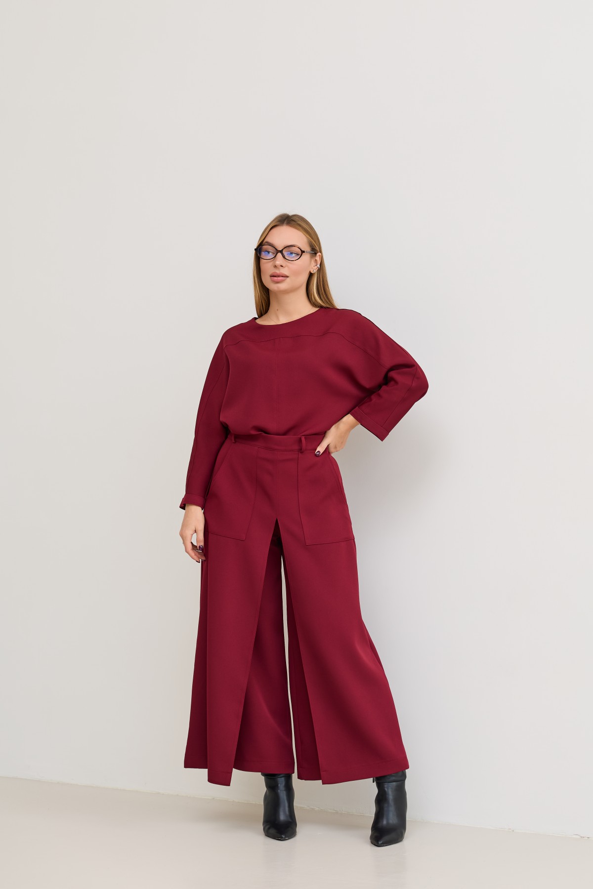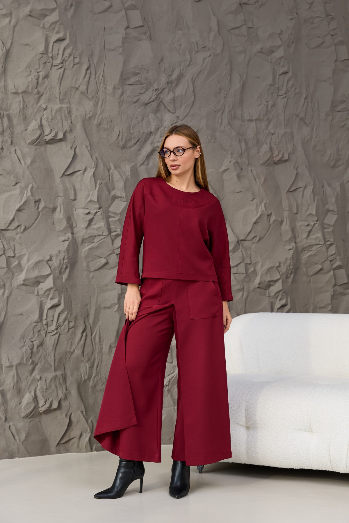 Костюм з костюмної тканини складається з кофти-блузи з цільнокроєними рукавами - по низу є манжети, підрізною кокеткою по переду кофти та спинці з переходом на рукава, сілует вільной, довжина нижче талії, по боках є маленькі розрізи. Та брюки широкого крою - з імітацією спідниці по переду з довгим розрізом по центру. Довжина брюк вище щиколоток.На штанах накладні кишені зручно розташовані.На брюках пояс по спинці на резинці - для зручності підбору розміру в талії.Може використовуватись як діловий костюм, та нарядний костюм на вихід.