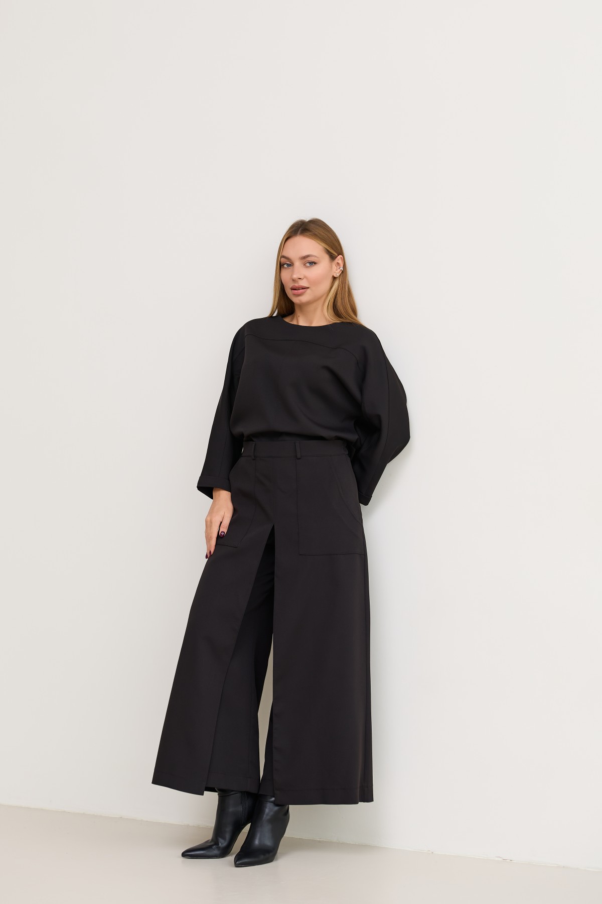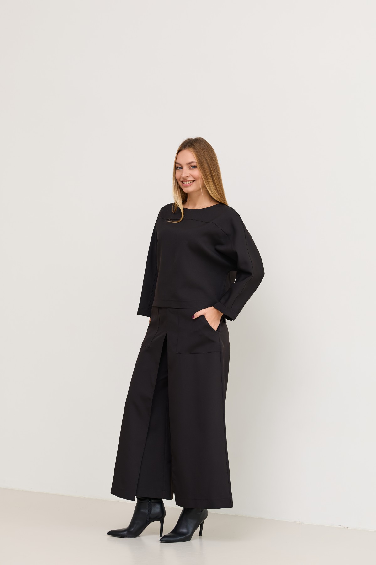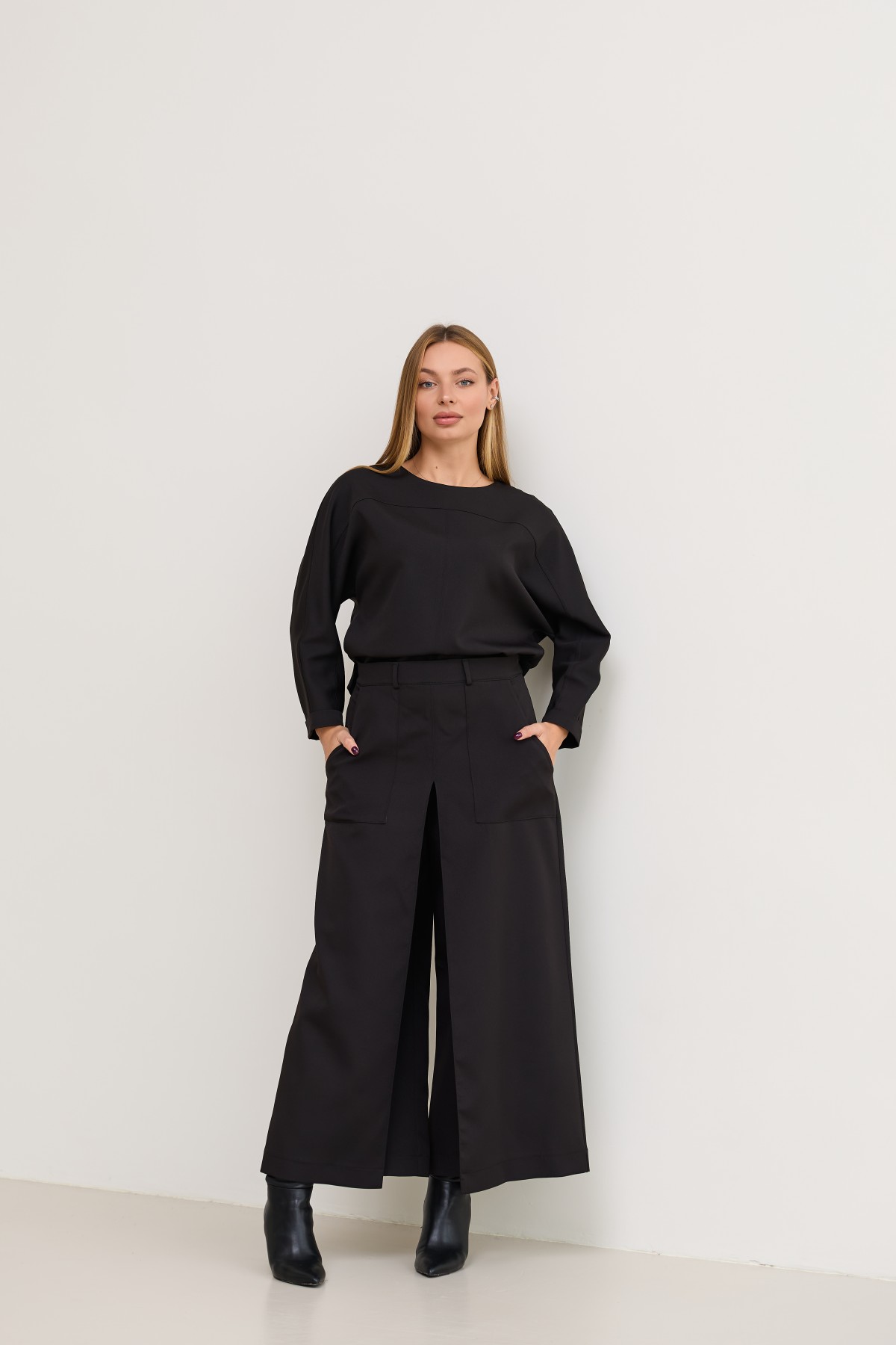 Костюм з костюмної тканини складається з кофти-блузи з цільнокроєними рукавами - по низу є манжети, підрізною кокеткою по переду кофти та спинці з переходом на рукава, сілует вільной, довжина нижче талії, по боках є маленькі розрізи. Та брюки широкого крою - з імітацією спідниці по переду з довгим розрізом по центру. Довжина брюк вище щиколоток.На штанах накладні кишені зручно розташовані.На брюках пояс по спинці на резинці - для зручності підбору розміру в талії.Може використовуватись як діловий костюм, та нарядний костюм на вихід.