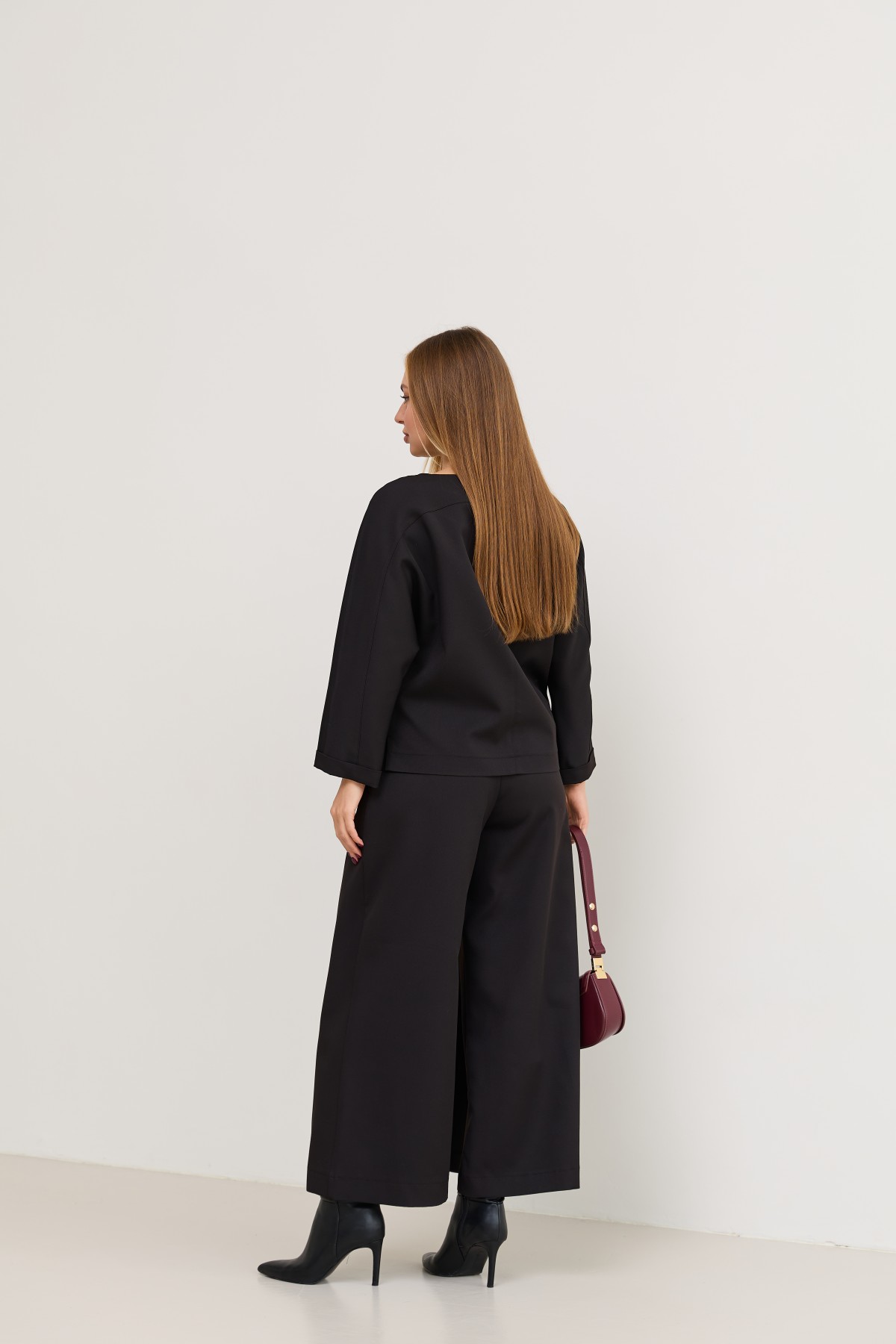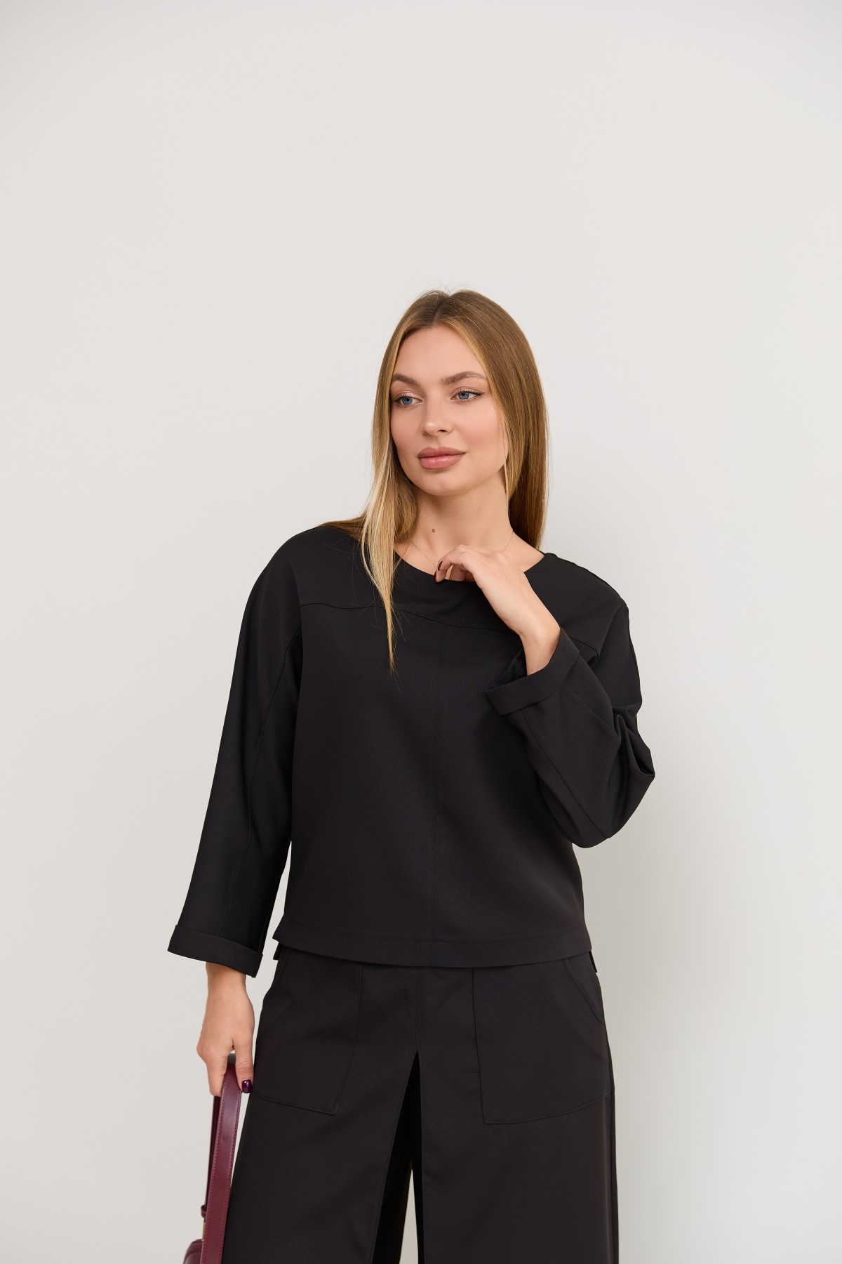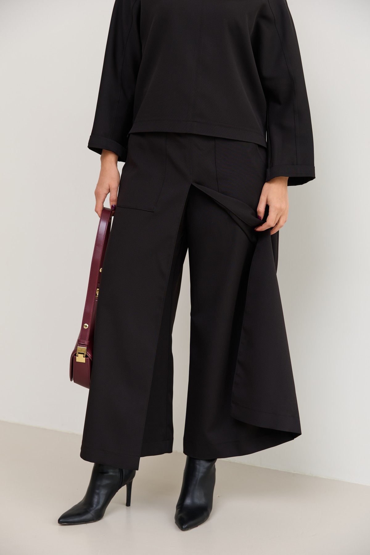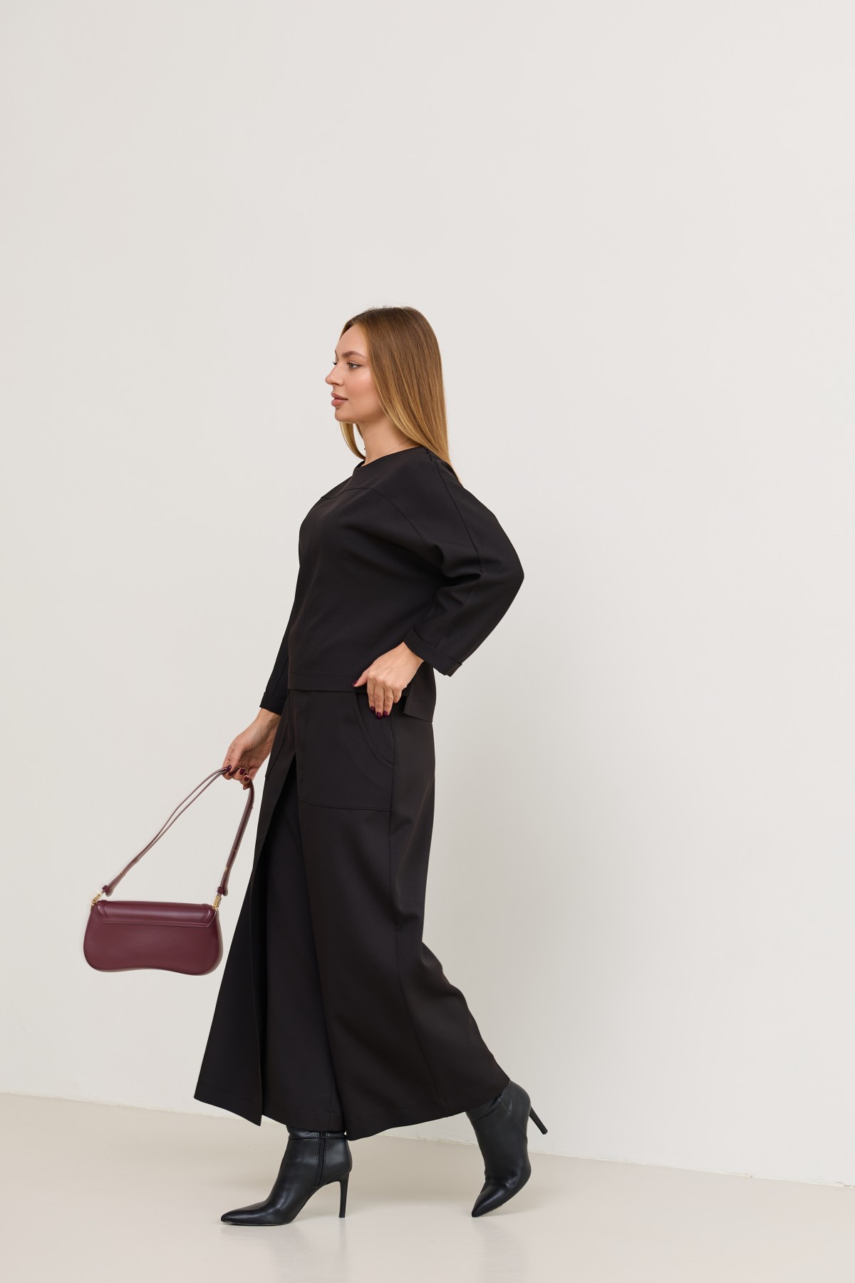 Костюм з костюмної тканини складається з кофти-блузи з цільнокроєними рукавами - по низу є манжети, підрізною кокеткою по переду кофти та спинці з переходом на рукава, сілует вільной, довжина нижче талії, по боках є маленькі розрізи. Та брюки широкого крою - з імітацією спідниці по переду з довгим розрізом по центру. Довжина брюк вище щиколоток.На штанах накладні кишені зручно розташовані.На брюках пояс по спинці на резинці - для зручності підбору розміру в талії.Може використовуватись як діловий костюм, та нарядний костюм на вихід.