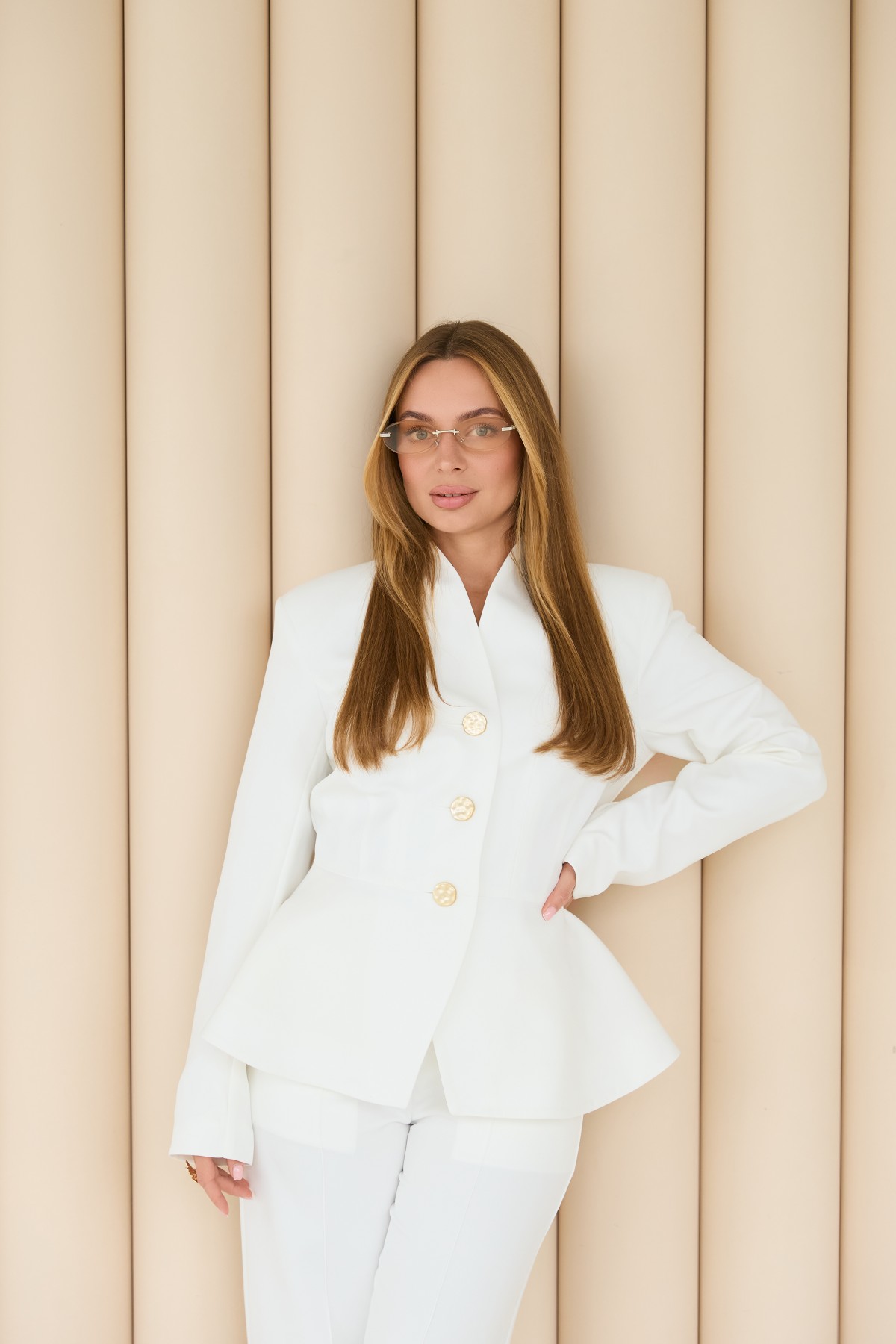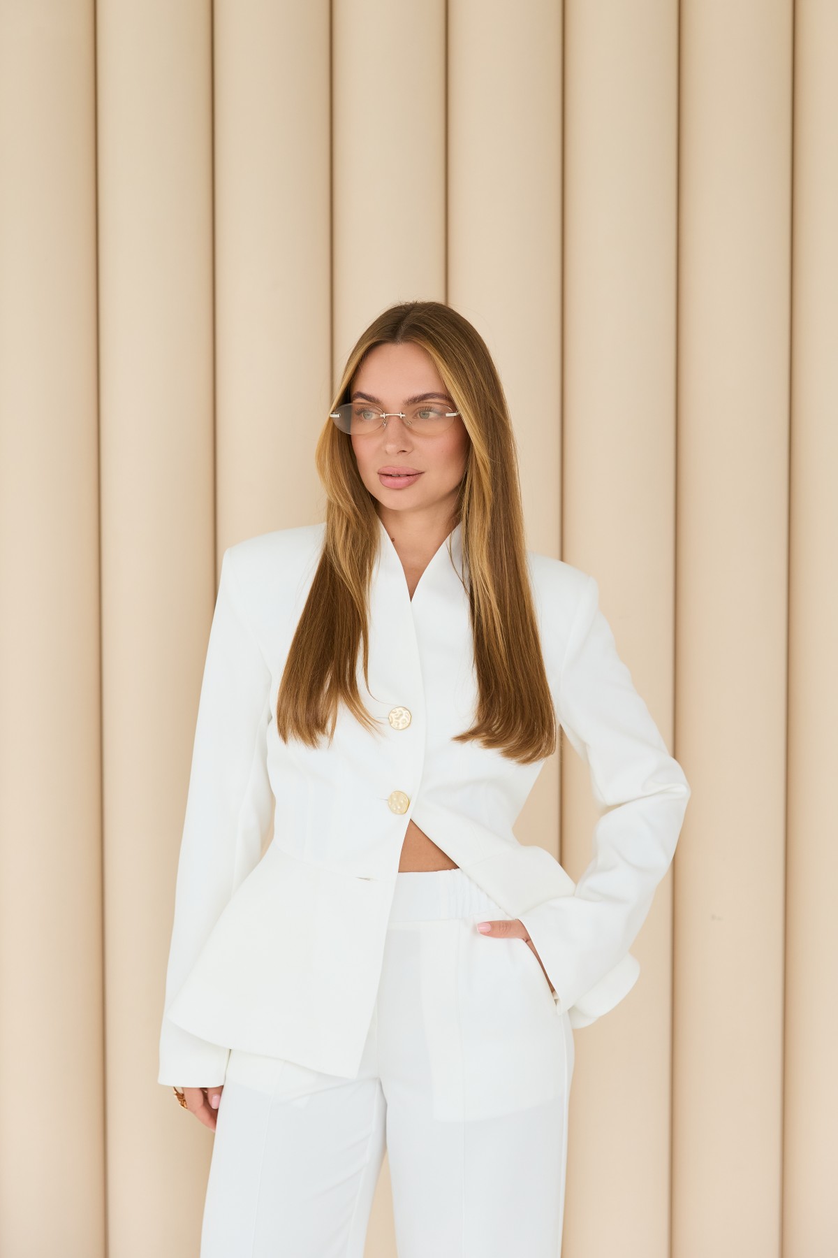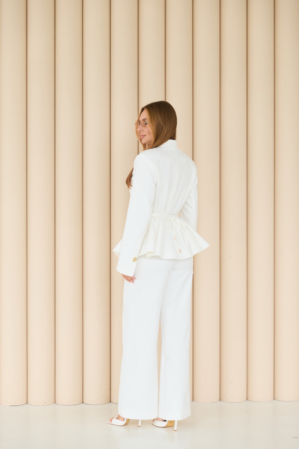 Костюм виконаний у офісному стилі. Жакет довжиною до стегна. Жакет на однобортній застібці на петлі та гудзики. На жакеті знімний пояс-куліса. Костюм для урочистих випадків.