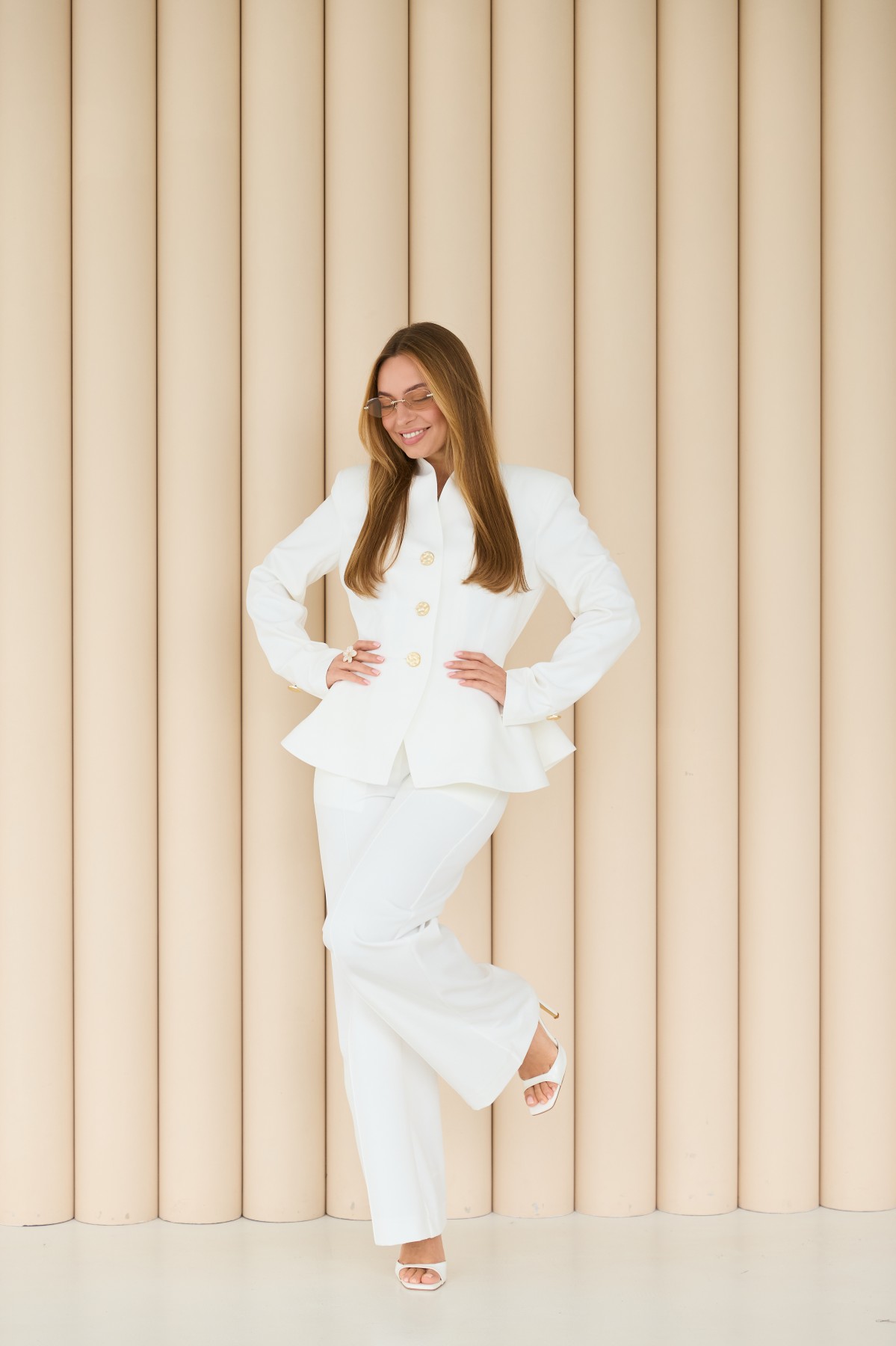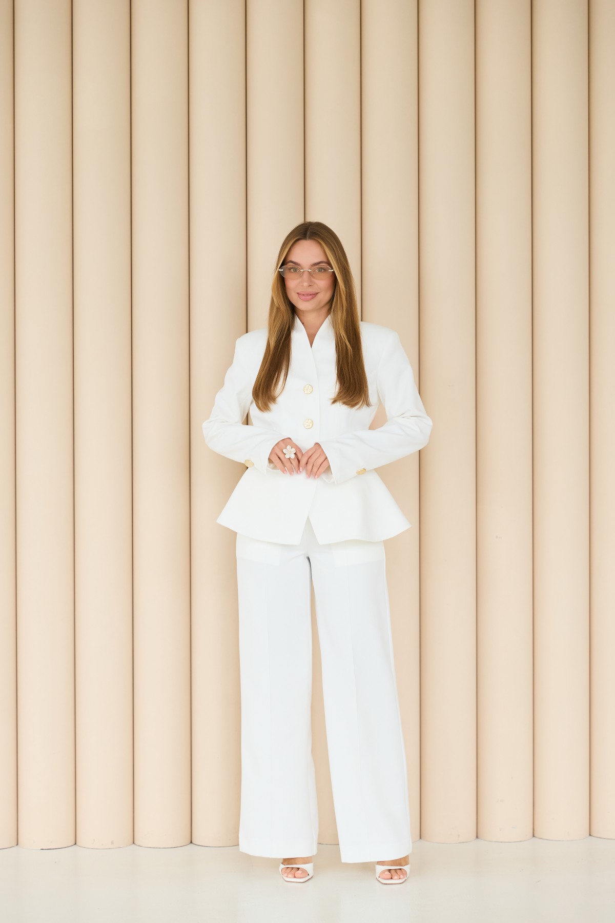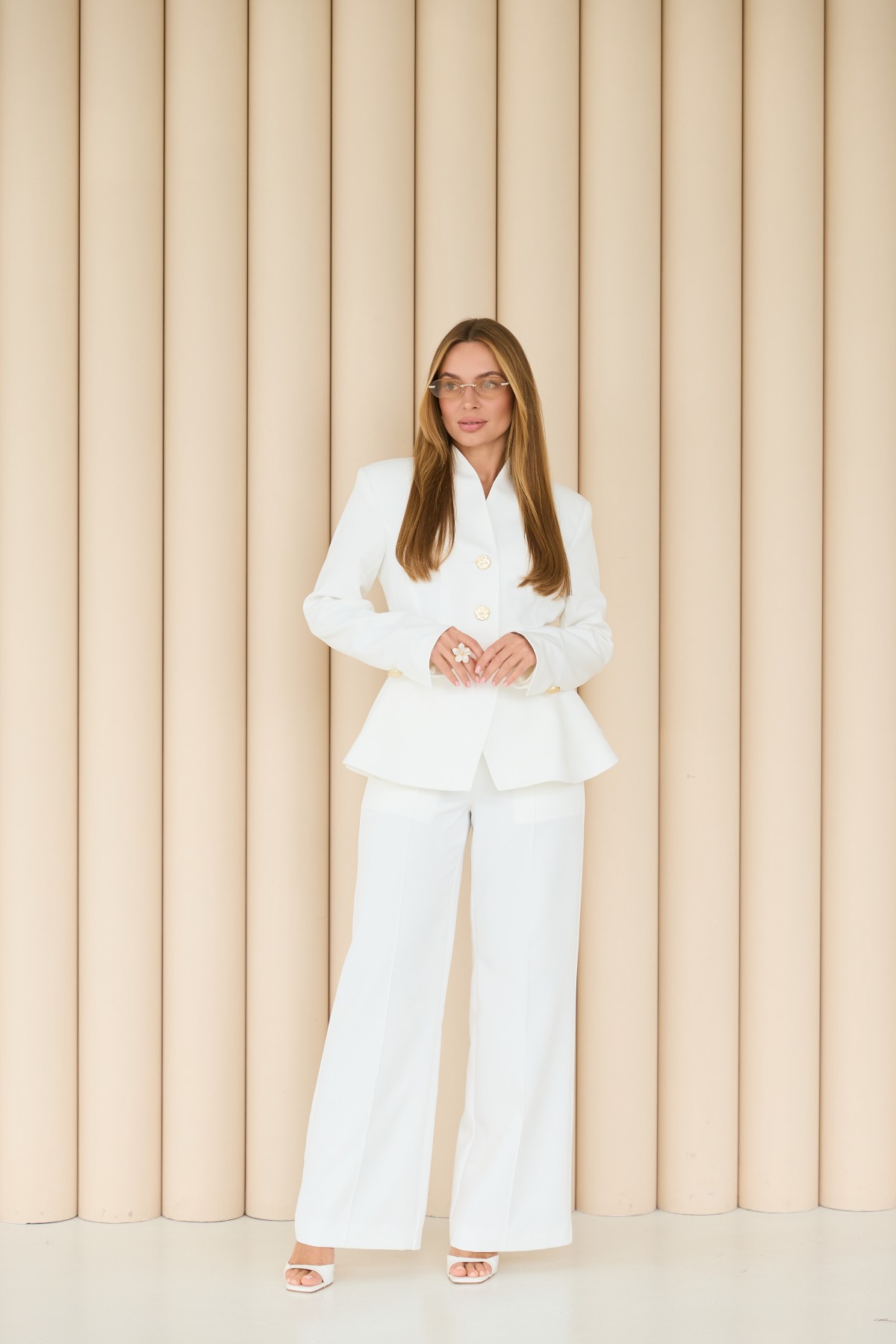 Костюм виконаний у офісному стилі. Жакет довжиною до стегна. Жакет на однобортній застібці на петлі та гудзики. На жакеті знімний пояс-куліса. Костюм для урочистих випадків.