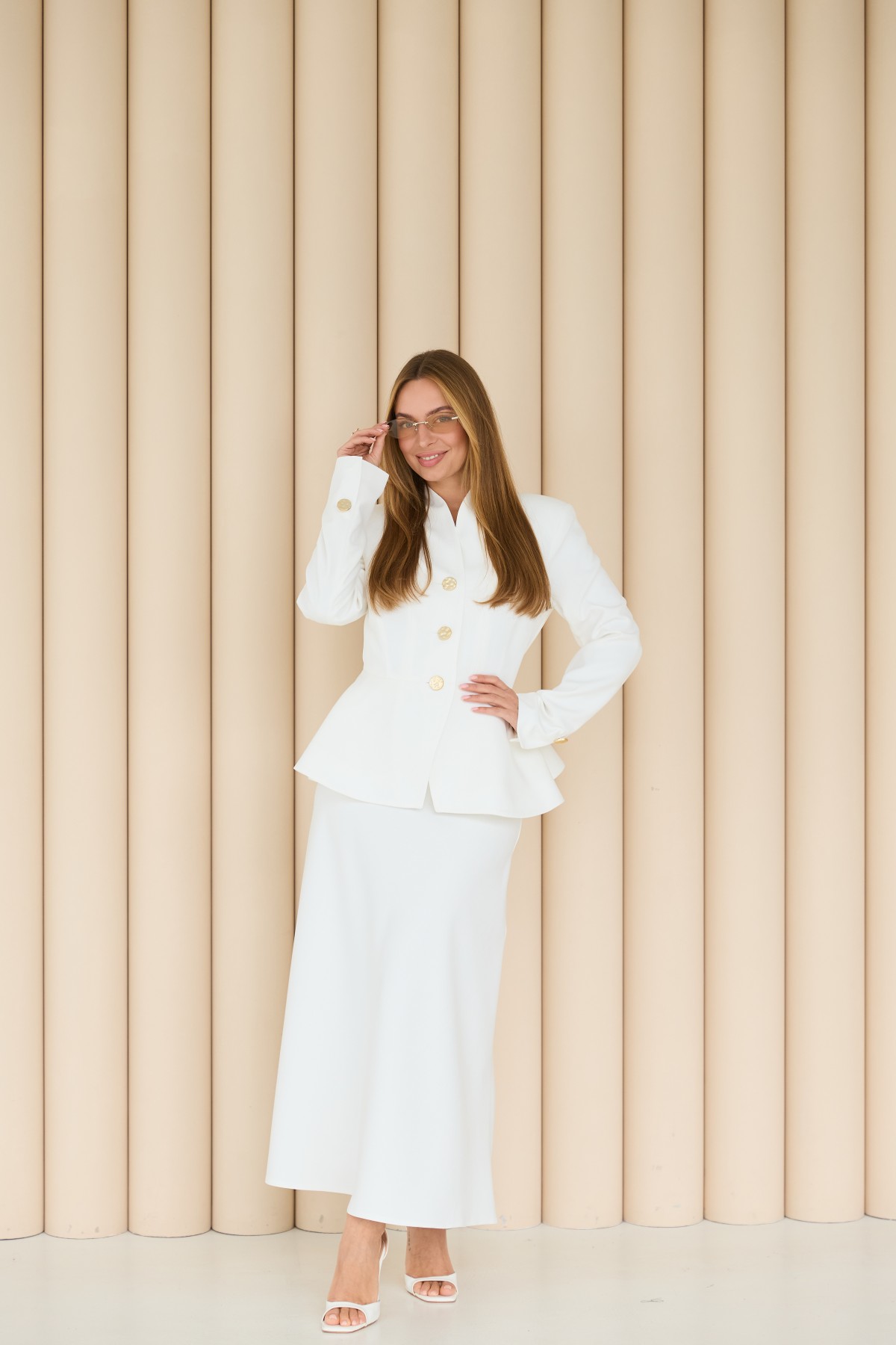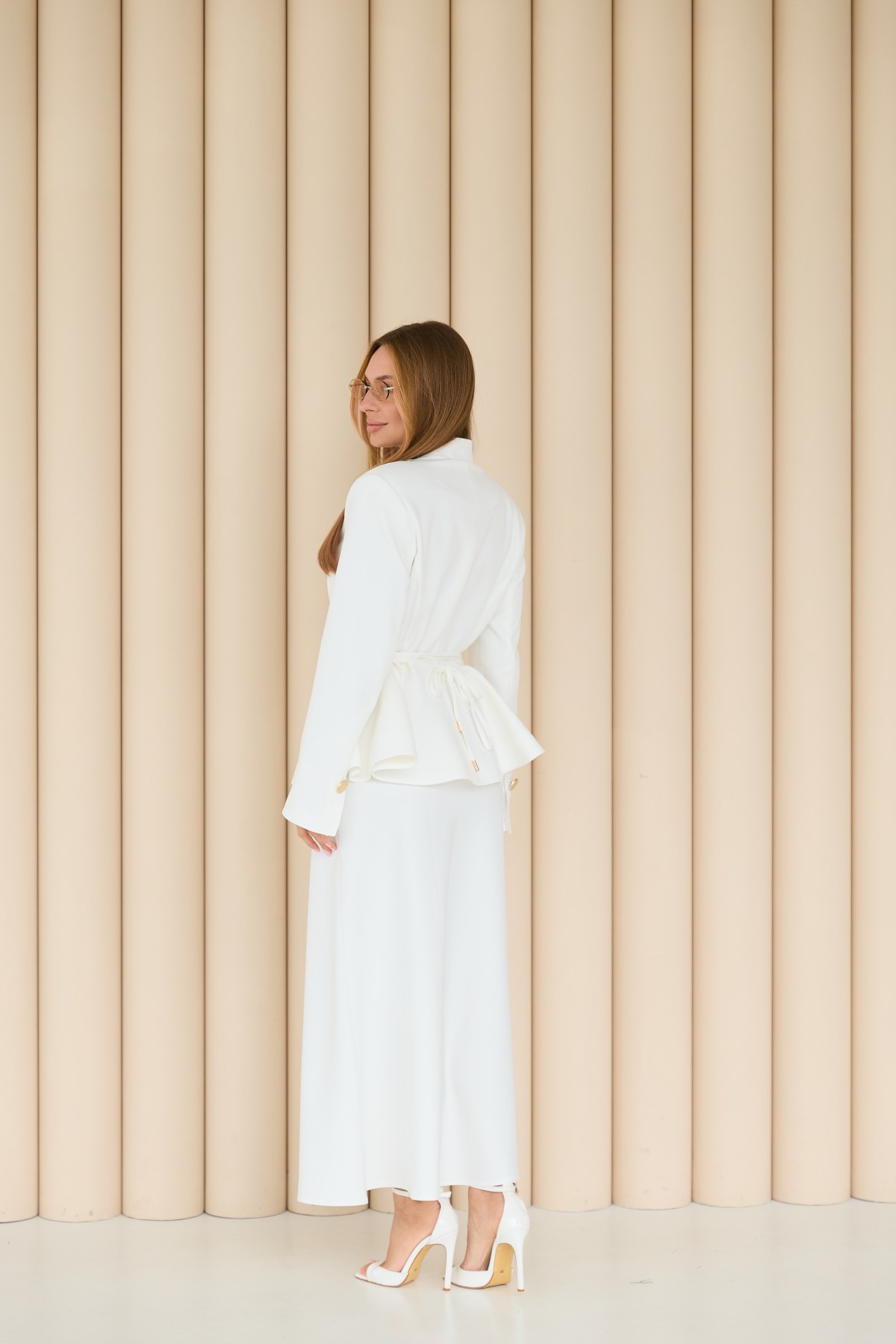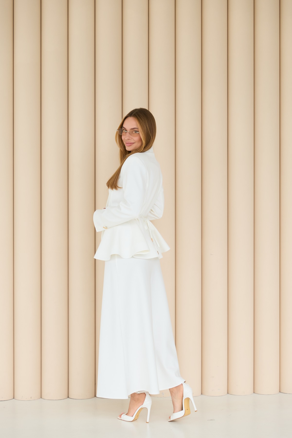 Костюм виконаний у офісному стилі. Спідниця клеш приталена по талії і облягає по стегнах. Жакет довжиною до стегна. Довжина спідниці до щиколотки. Жакет на однобортній застібці на петлі та гудзики. На жакеті знімний пояс-куліса. Спідниця з суцільнокроєним поясом, по талії об єм регулюється резинкою. Костюм для урочистих випадків.