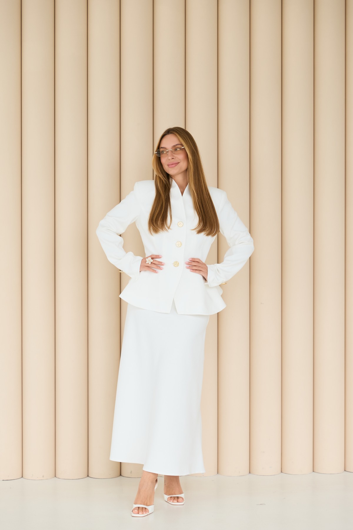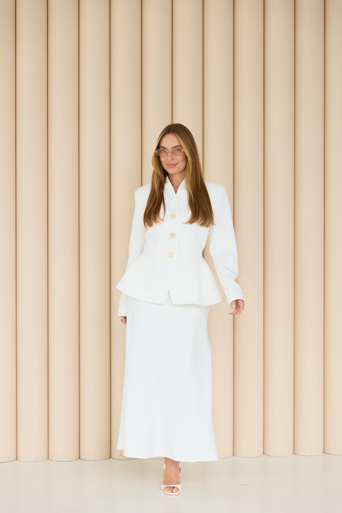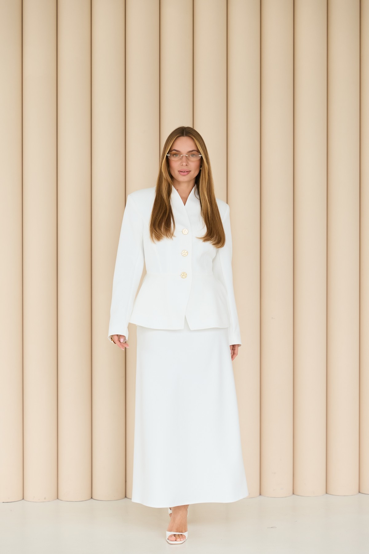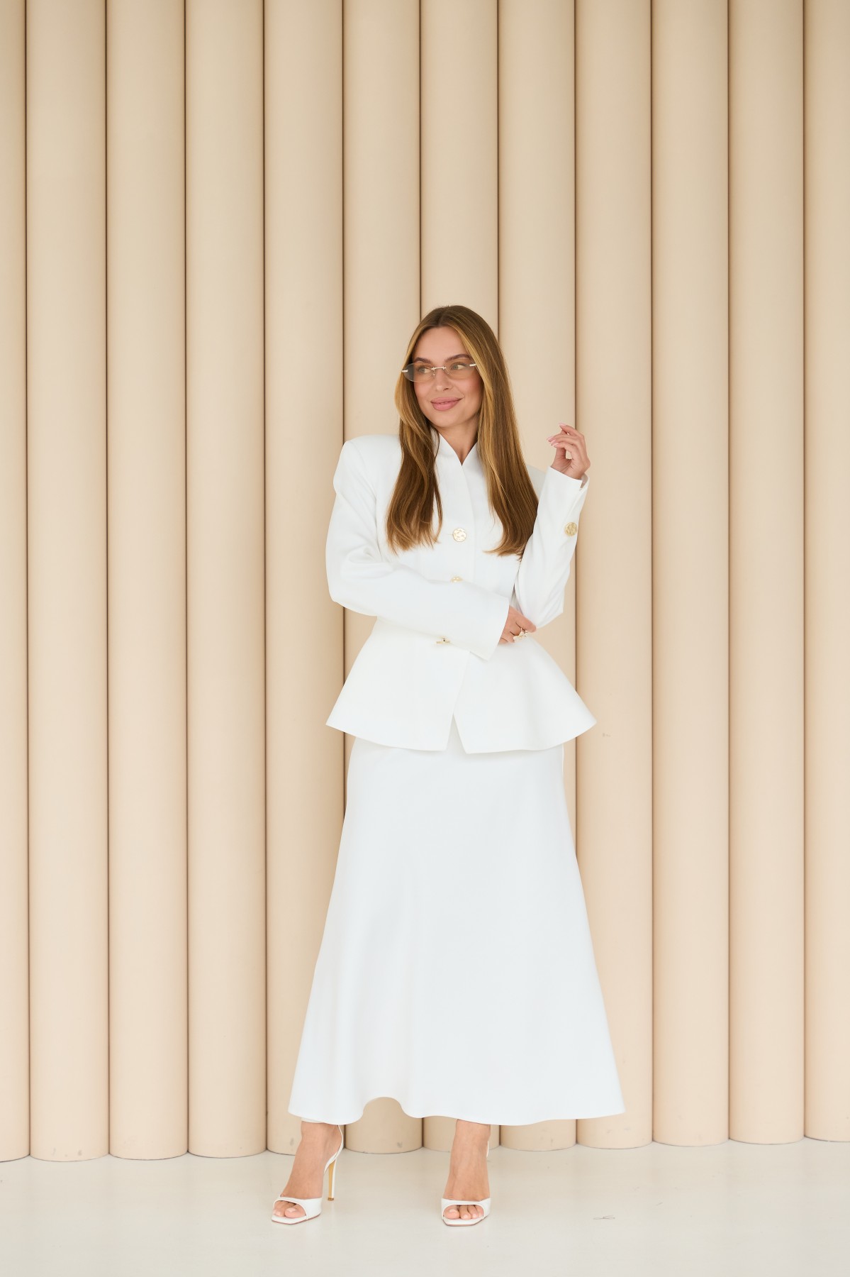 Костюм виконаний у офісному стилі. Спідниця клеш приталена по талії і облягає по стегнах. Жакет довжиною до стегна. Довжина спідниці до щиколотки. Жакет на однобортній застібці на петлі та гудзики. На жакеті знімний пояс-куліса. Спідниця з суцільнокроєним поясом, по талії об єм регулюється резинкою. Костюм для урочистих випадків.