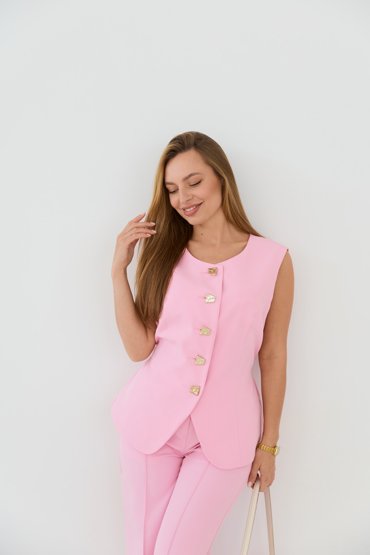 Костюм виконаний у офісному стилі. Жилет приталеного силуету. Штани класичного крою із застроченою стрілкою по центру переднього полотнища. Жилет довжиною до стегна. Універсальна довжина штанів призначена для носіння під підбори, так і під взуття на низьких підборах. Жилет на однобортній застібці на петлі та гудзики. На жилеті знімний пояс-куліса. Костюм чудово поєднує в собі зручність і елегантність. Не зважаючи на строгість ділового костюма, його можна носити як під туфлі на високих підборах, збираючись на ділову зустріч, так і під кеди на прогулянці у міському парку. Доповнивши образ туфлями на високих підборах, можна відвідати урочистий захід або вирушити на романтичне побачення.