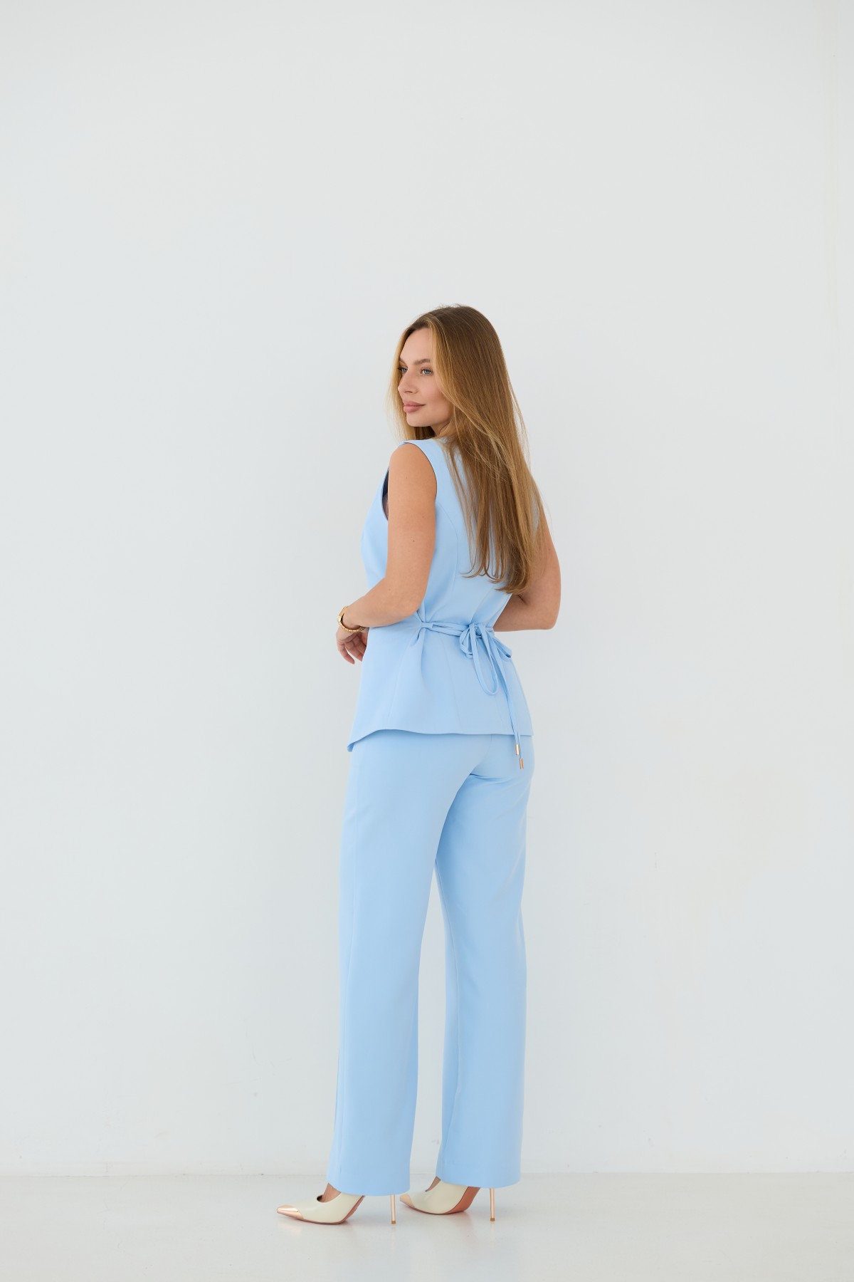 Костюм виконаний у офісному стилі. Жилет приталеного силуету. Штани класичного крою із застроченою стрілкою по центру переднього полотнища. Жилет довжиною до стегна. Універсальна довжина штанів призначена для носіння під підбори, так і під взуття на низьких підборах. Жилет на однобортній застібці на петлі та гудзики. На жилеті знімний пояс-куліса. Костюм чудово поєднує в собі зручність і елегантність. Не зважаючи на строгість ділового костюма, його можна носити як під туфлі на високих підборах, збираючись на ділову зустріч, так і під кеди на прогулянці у міському парку. Доповнивши образ туфлями на високих підборах, можна відвідати урочистий захід або вирушити на романтичне побачення.