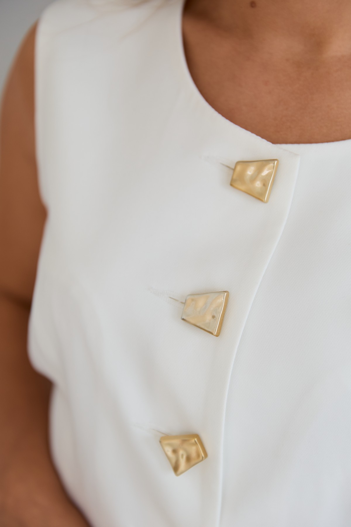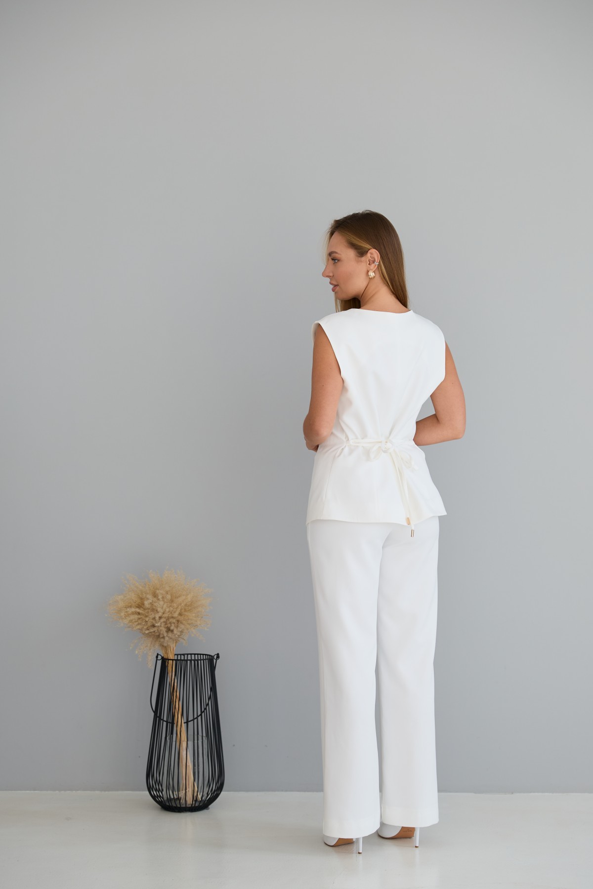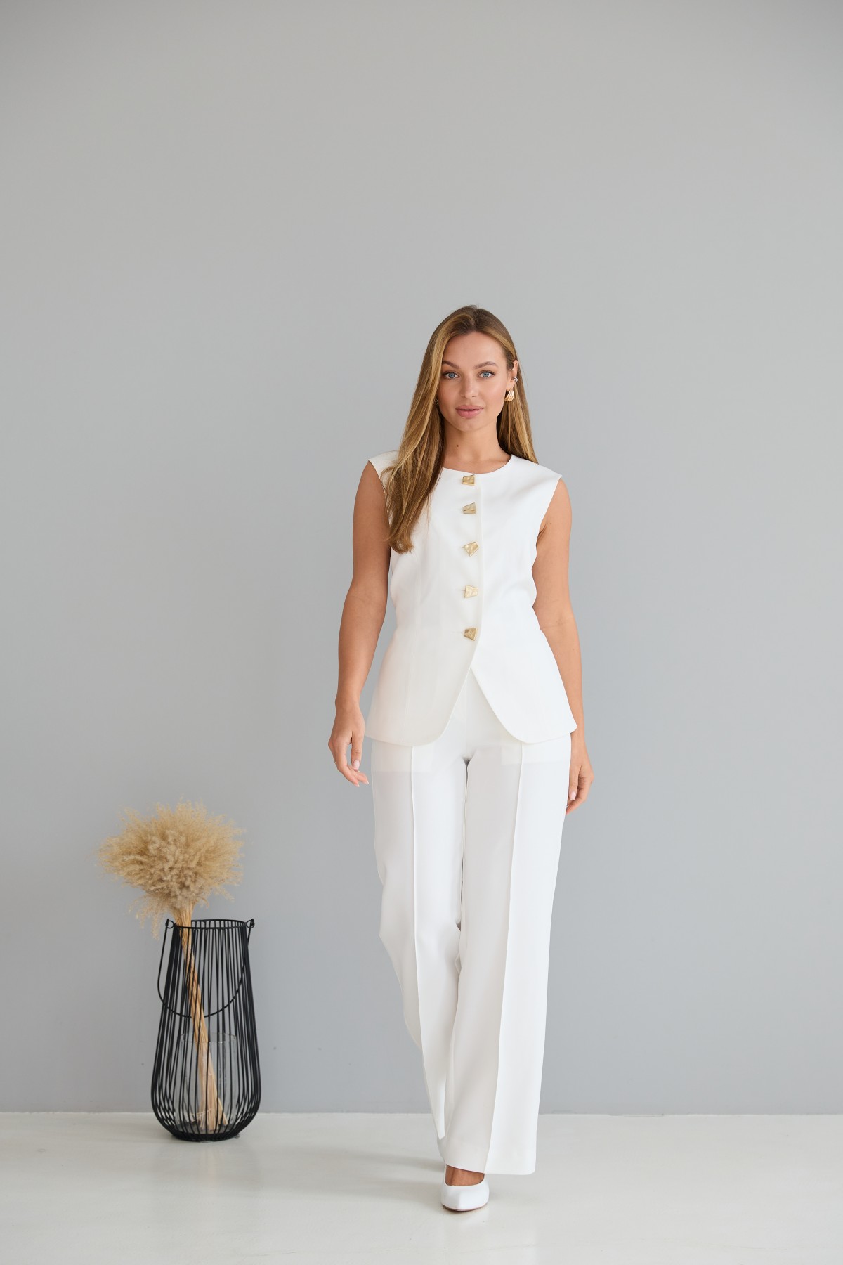 Костюм виконаний у офісному стилі. Жилет приталеного силуету. Штани класичного крою із застроченою стрілкою по центру переднього полотнища. Жилет довжиною до стегна. Універсальна довжина штанів призначена для носіння під підбори, так і під взуття на низьких підборах. Жилет на однобортній застібці на петлі та гудзики.На жилеті знімний пояс-куліса. Костюм чудово поєднує в собі зручність і елегантність. Не зважаючи на строгість ділового костюма, його можна носити як під туфлі на високих підборах, збираючись на ділову зустріч, так і під кеди на прогулянці у міському парку.Доповнивши образ туфлями на високих підборах, можна відвідати урочистий захід або вирушити на романтичне побачення.