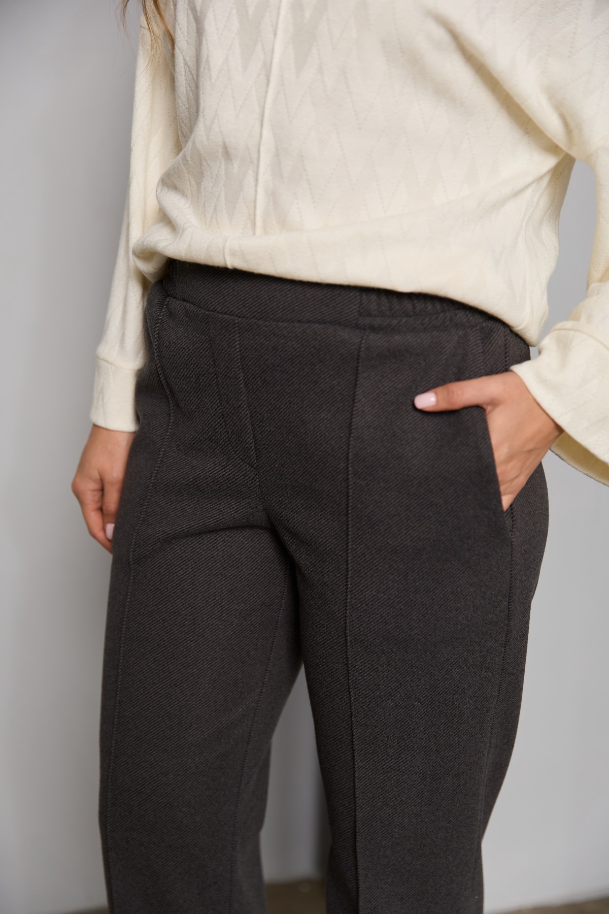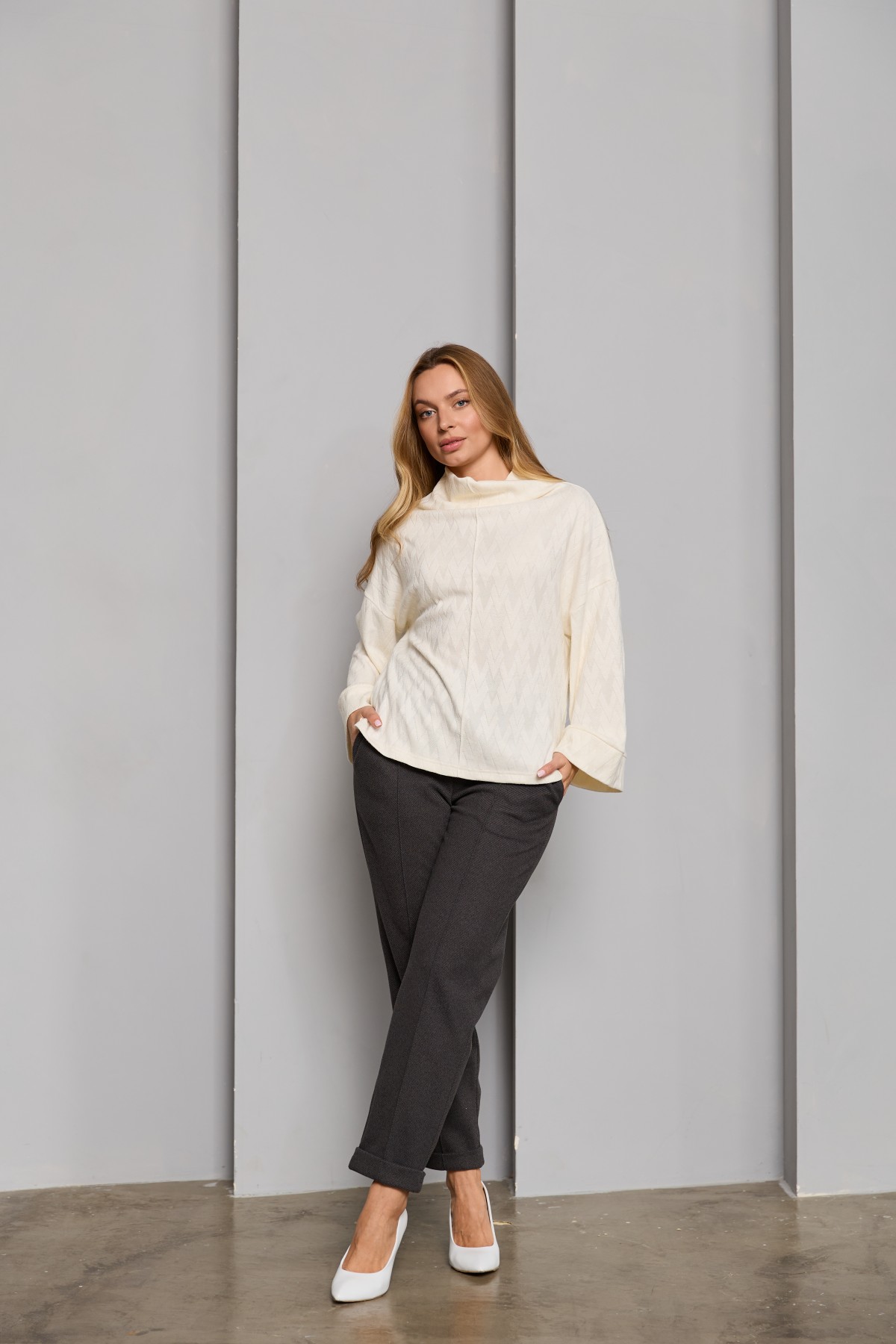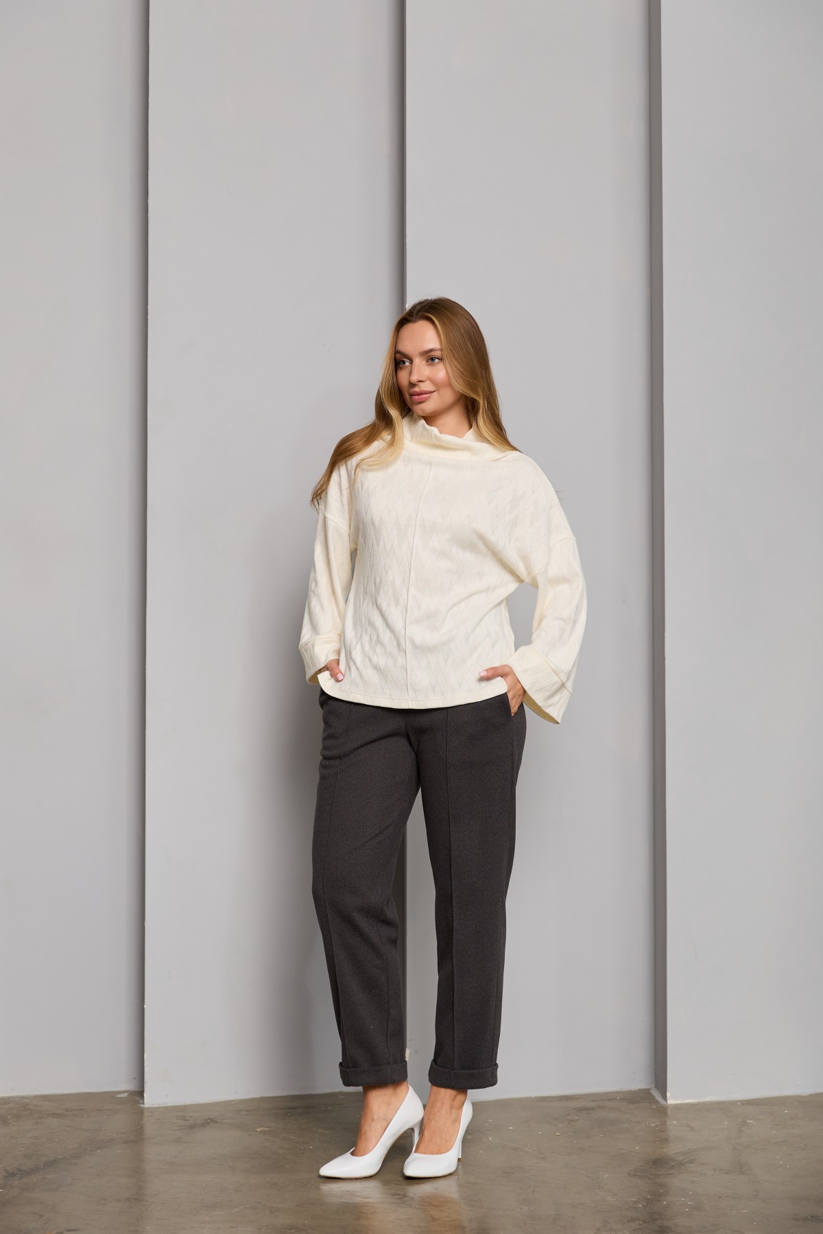 Класичні звужені до низу штани, вгорі по талії пояс на резинці, а внизу закінчуються манжетом. По передньому полотнищу застрочена стрілка, а по задньому стрілка запрасована. Штани вкорочені завдовжки 8/9. При необхідності подовжити штани по довжині, можна відвернути манжет, попередньо відсічи закріпку фіксуючу низ штанів.