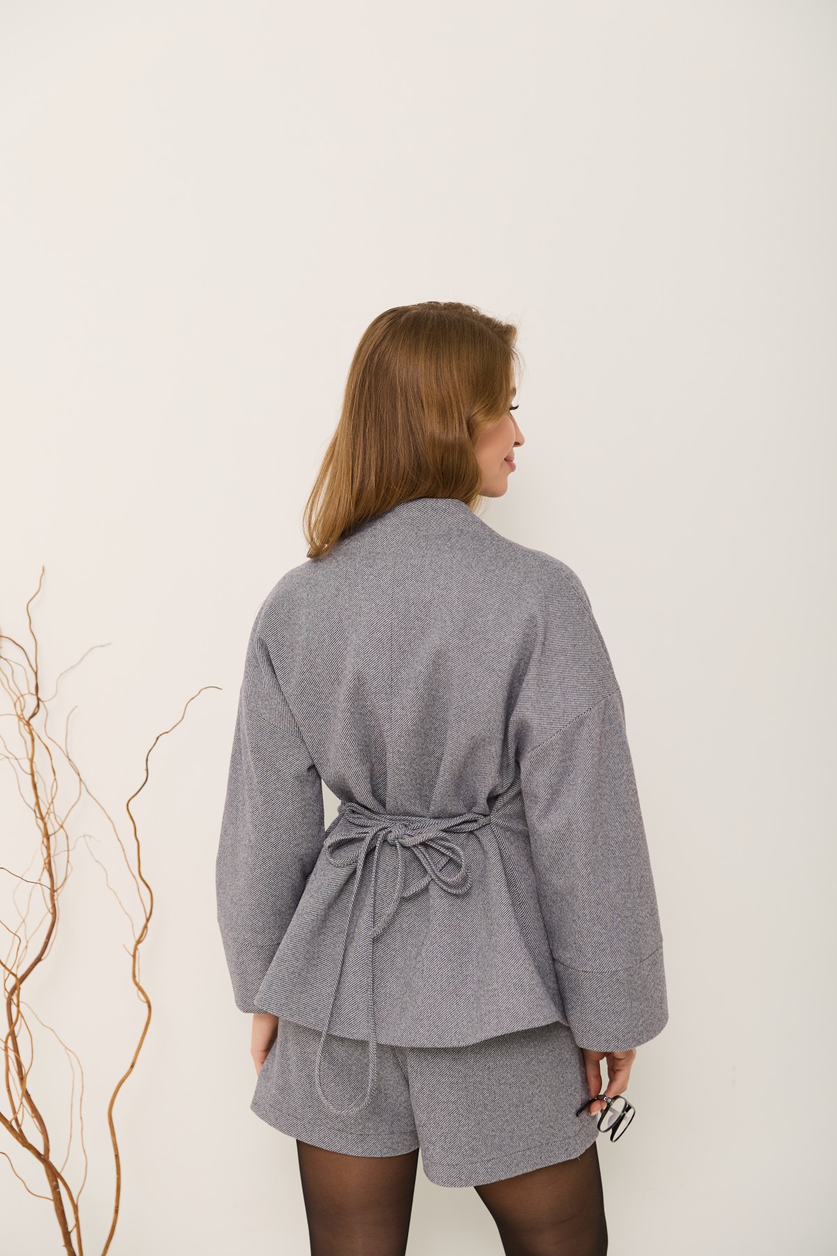 Довжина жакету до середини стегон, вільного сілуету з цільнокроєнною стійкою, спущене плече, рукав довжиною 7/8.На жакеті маємо тоненький пасок з основної тканини. Можно використовуватись як діловий образ, та просто на кожен день.