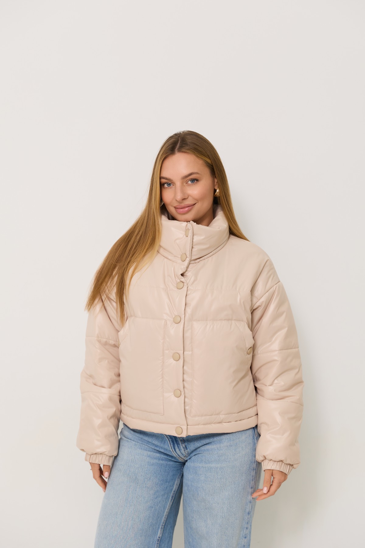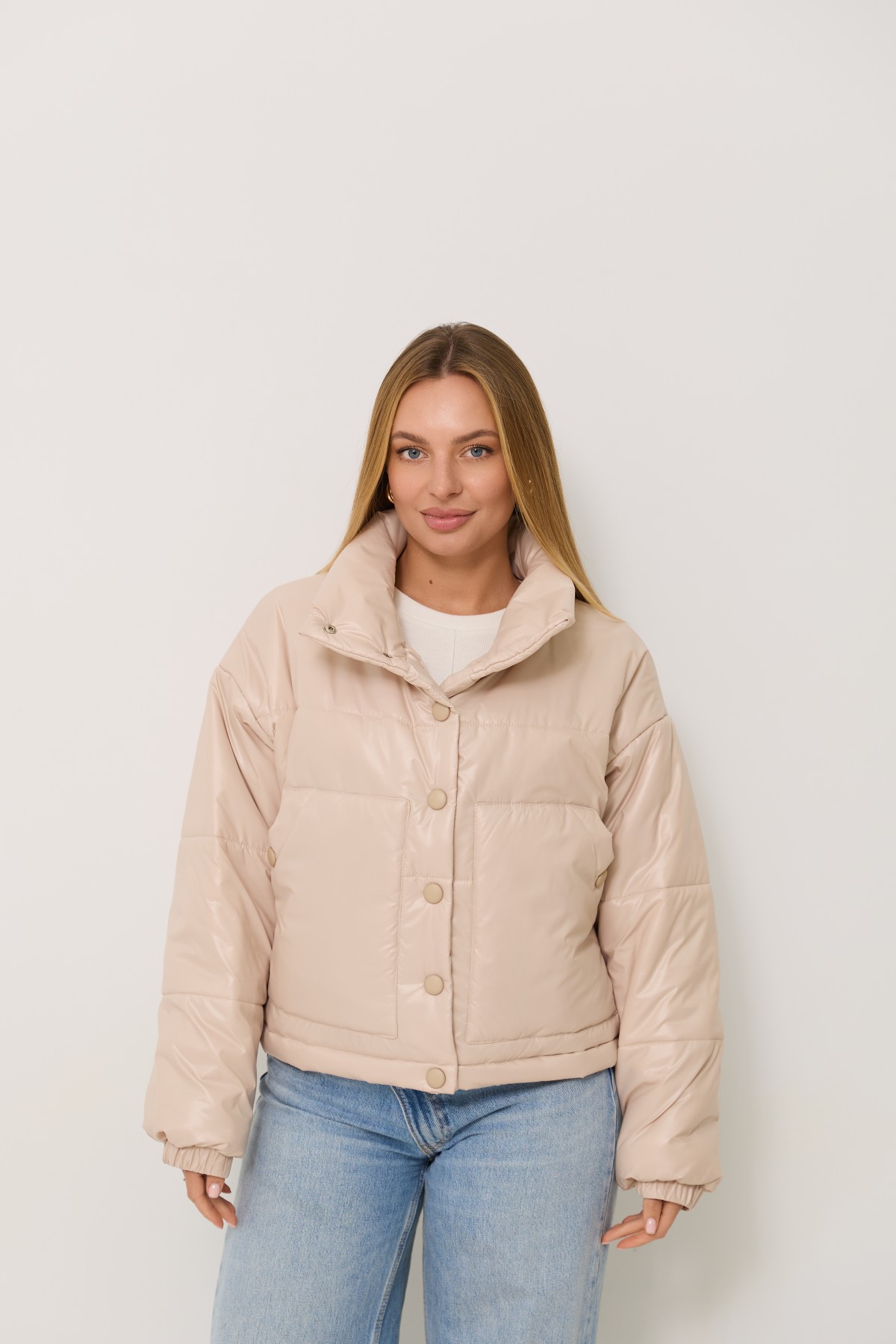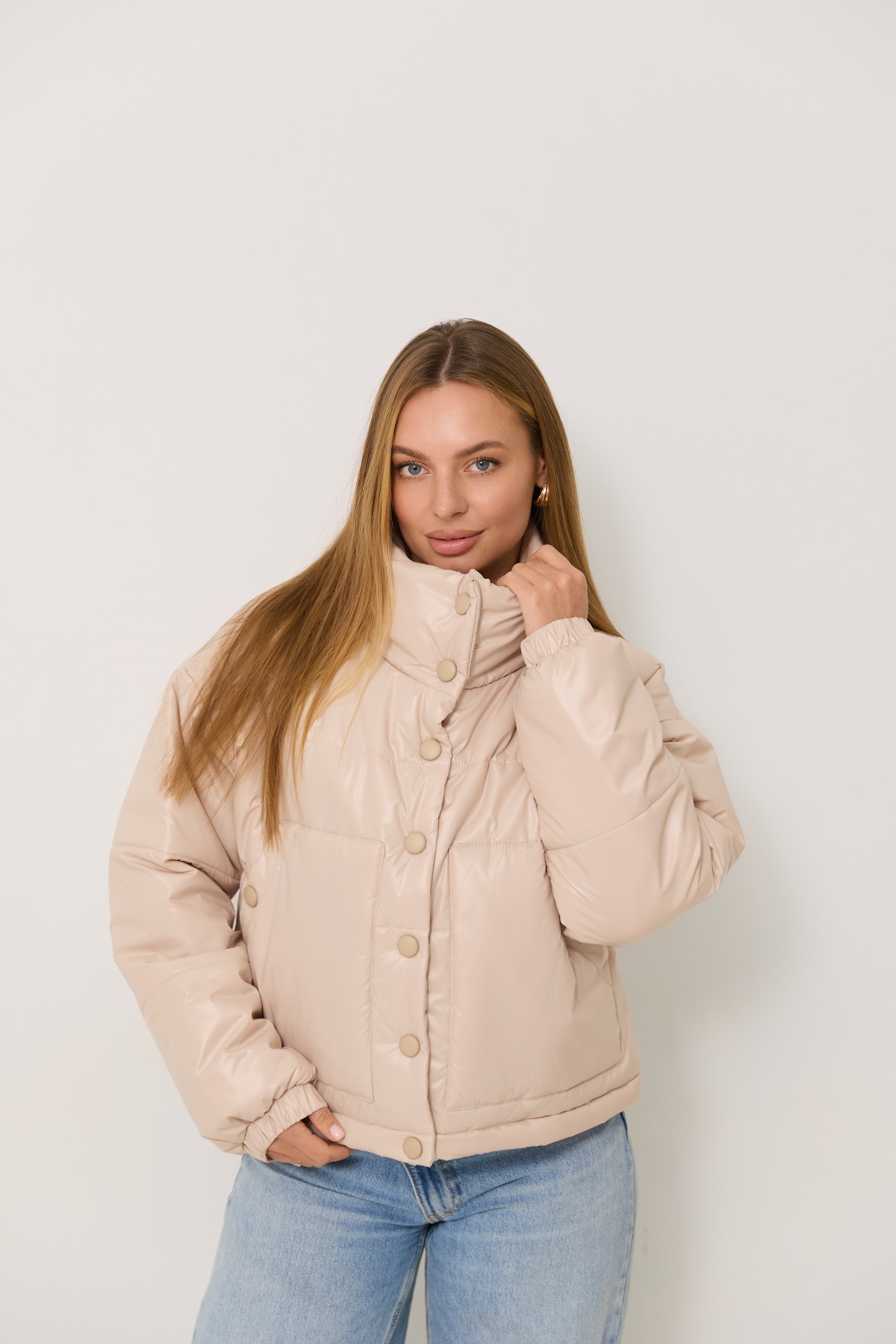 Універсальна куртка прямого силуету в класичному стилі. Довжина куртки нижче за рівень талії на 10см. Застібка по борту полички кнопки. Відкладний комір-стійка із застібкою на кнопках Втачний одношовний рукав, низ рукоя зібраний на гумку. Накладна кишеня, вхід до кишені фіксується кнопкою. Куліса по лінії низу на фіксаторах для забезпечення регулювання обєму по низу виробу.