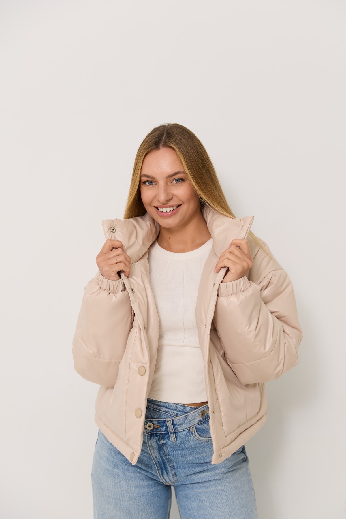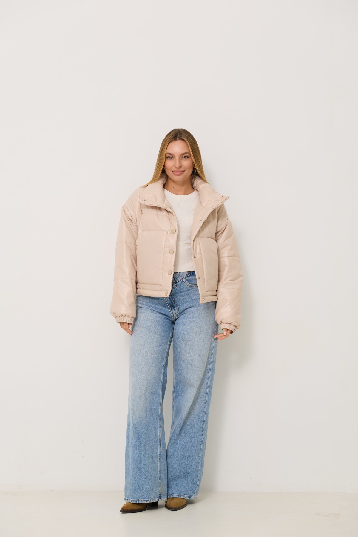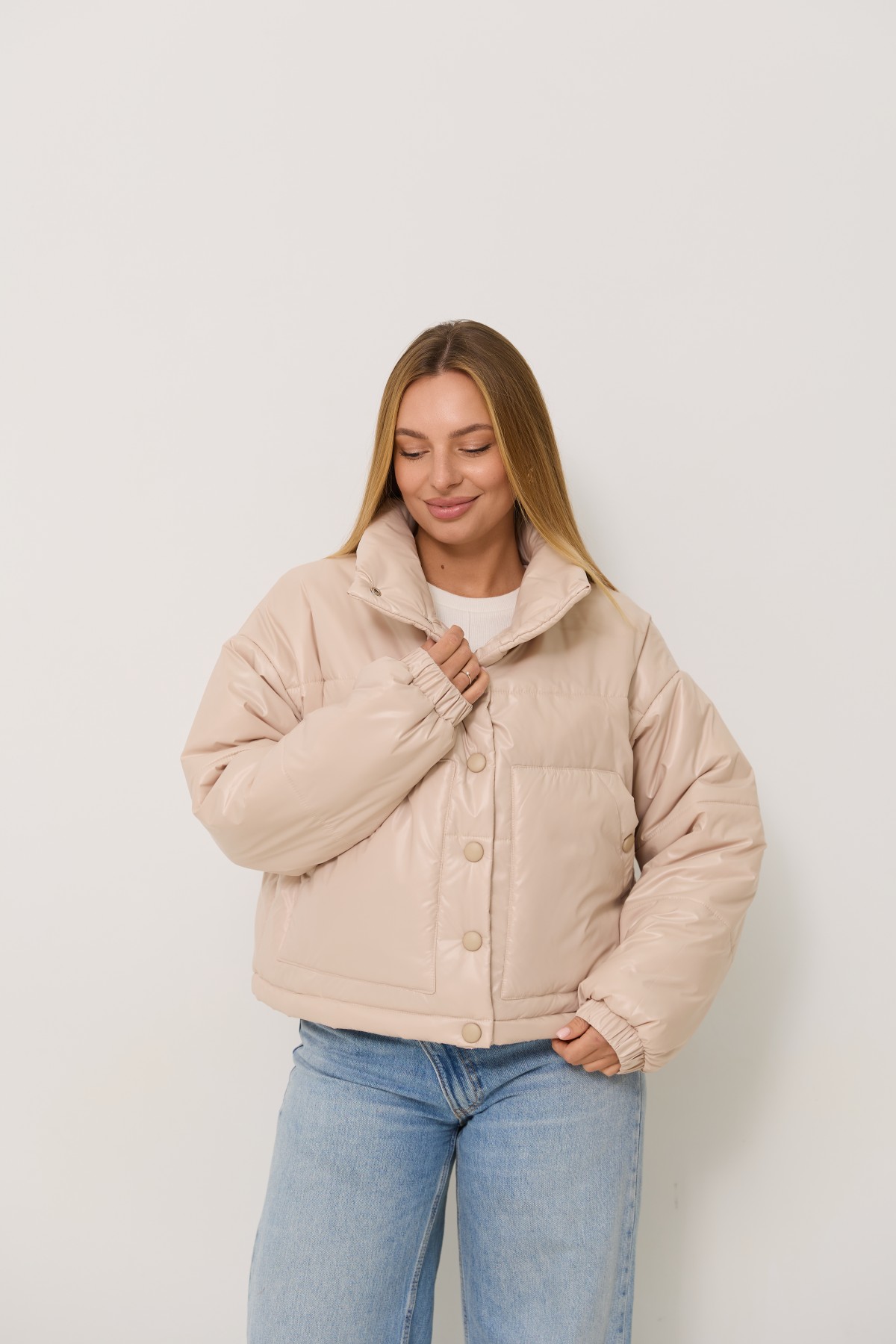 Універсальна куртка прямого силуету в класичному стилі. Довжина куртки нижче за рівень талії на 10см. Застібка по борту полички кнопки. Відкладний комір-стійка із застібкою на кнопках Втачний одношовний рукав, низ рукоя зібраний на гумку. Накладна кишеня, вхід до кишені фіксується кнопкою. Куліса по лінії низу на фіксаторах для забезпечення регулювання обєму по низу виробу.