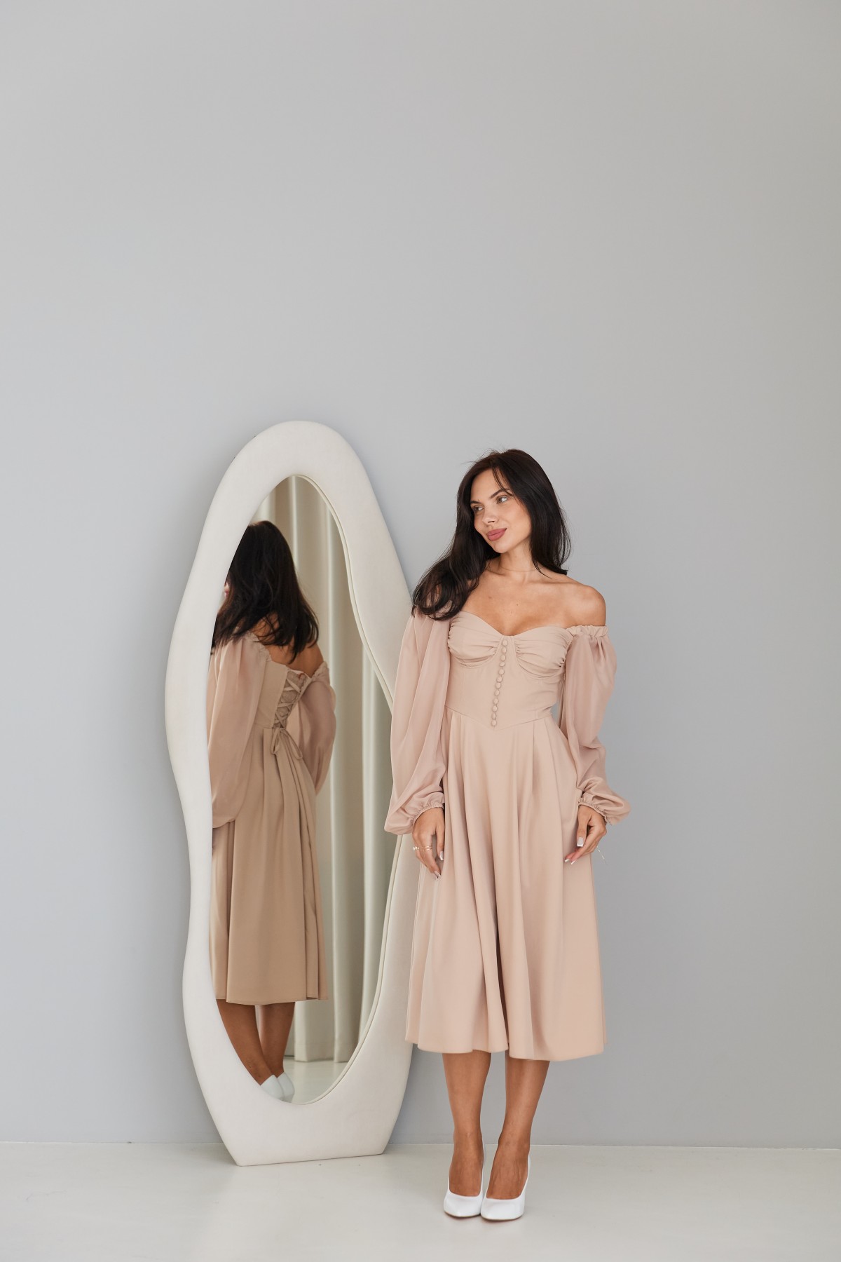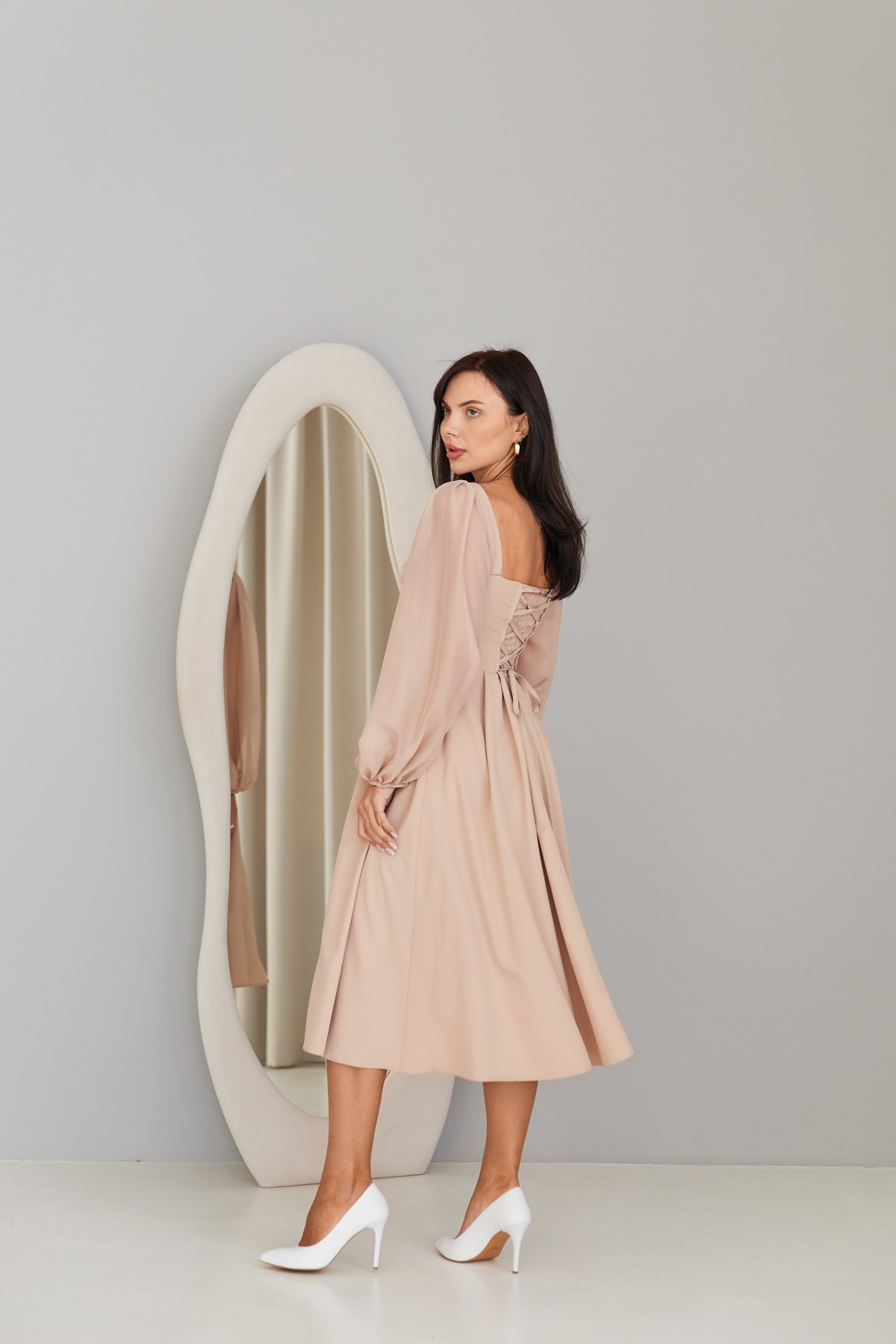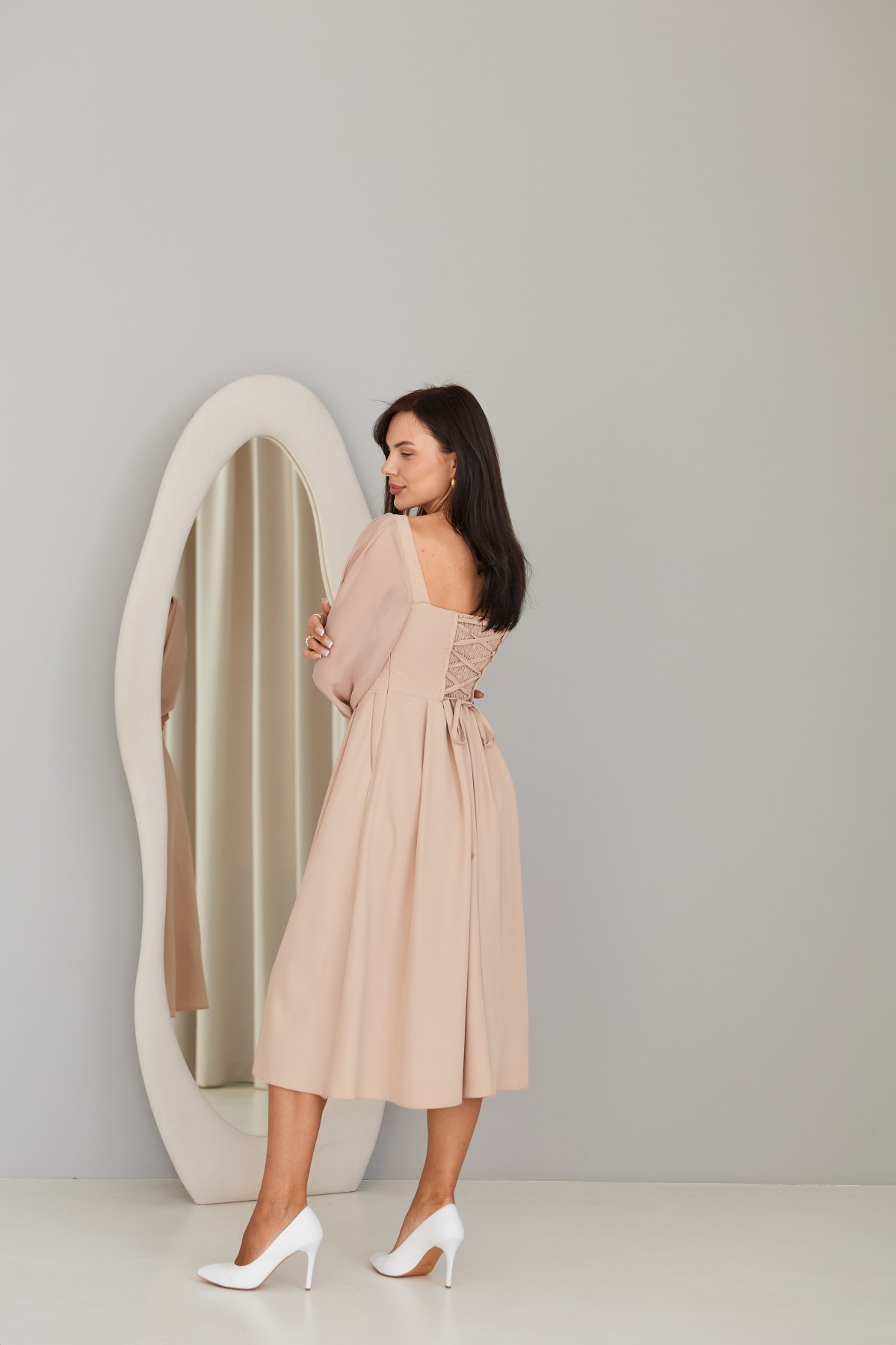 Сукня приталеного силуету з відкритим декольте в романтичному стилі. Ліф сукні - корсет із чашками, що дозволяє максимально підкреслити фігуру, спідниця клеш зі складами. По спинці виконано рядок ниткою гумкою і додаткове шнурування лаштунками, це забезпечує бездоганну посадку по вашій фігурі. Довжина сукні нижче коліна. Застібка з бокового шва на блискавці. Пишний рукав довжиною вище лінії ліктя, ширина рукава по низу регулюється гумкою. Кишені у підрізному бочці спідниці.