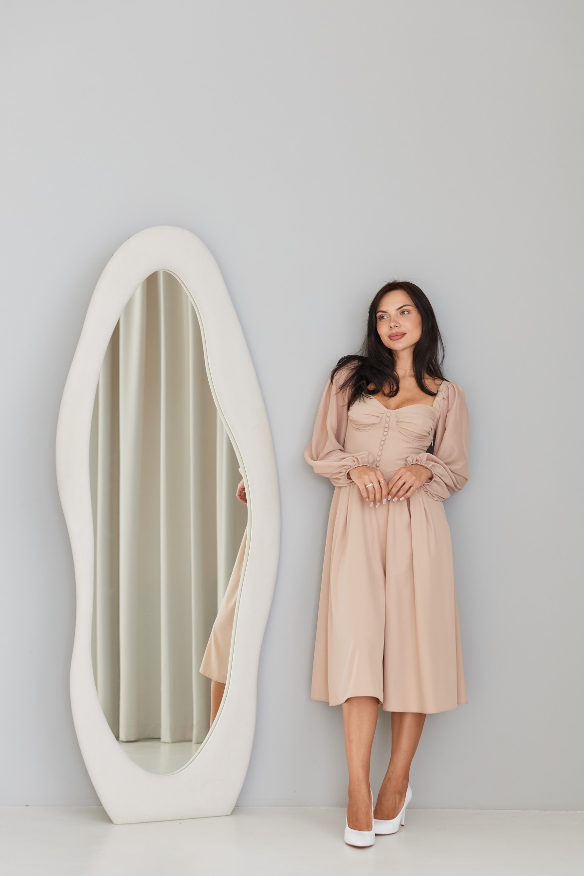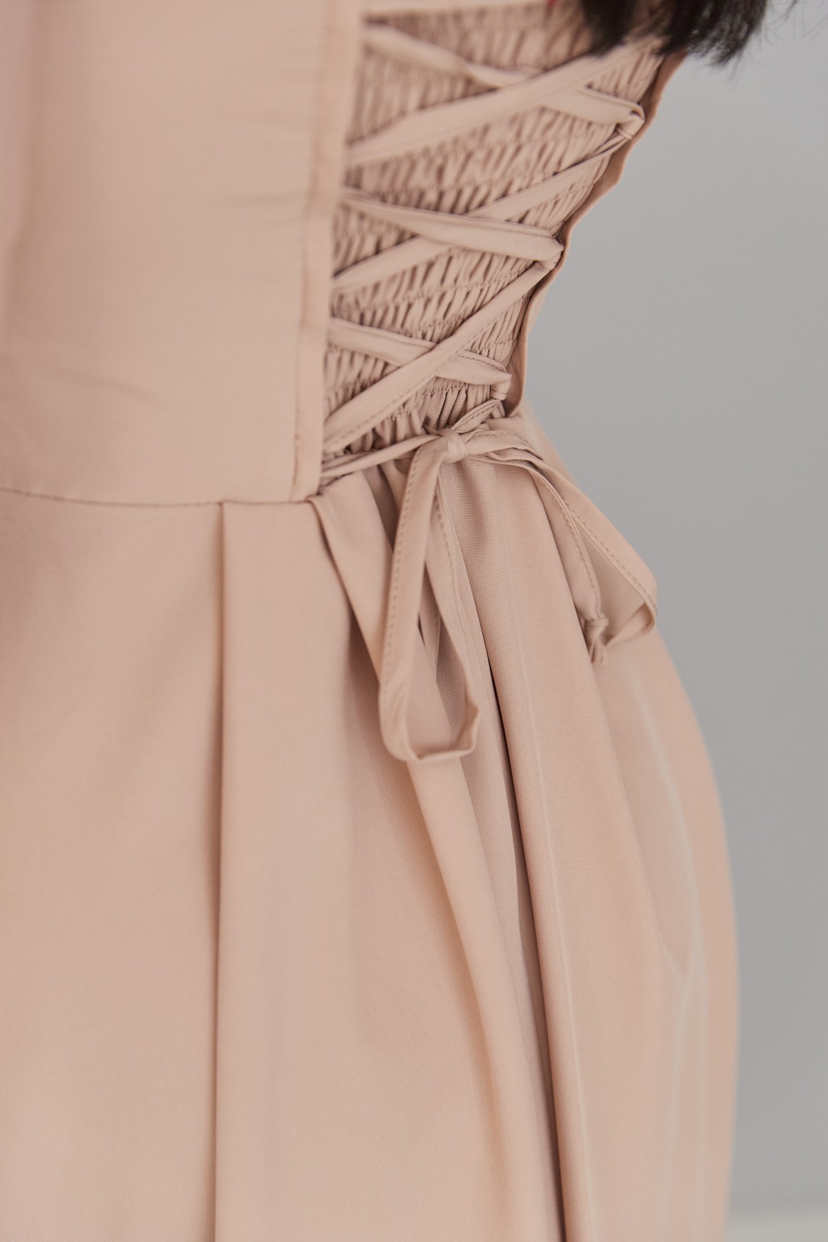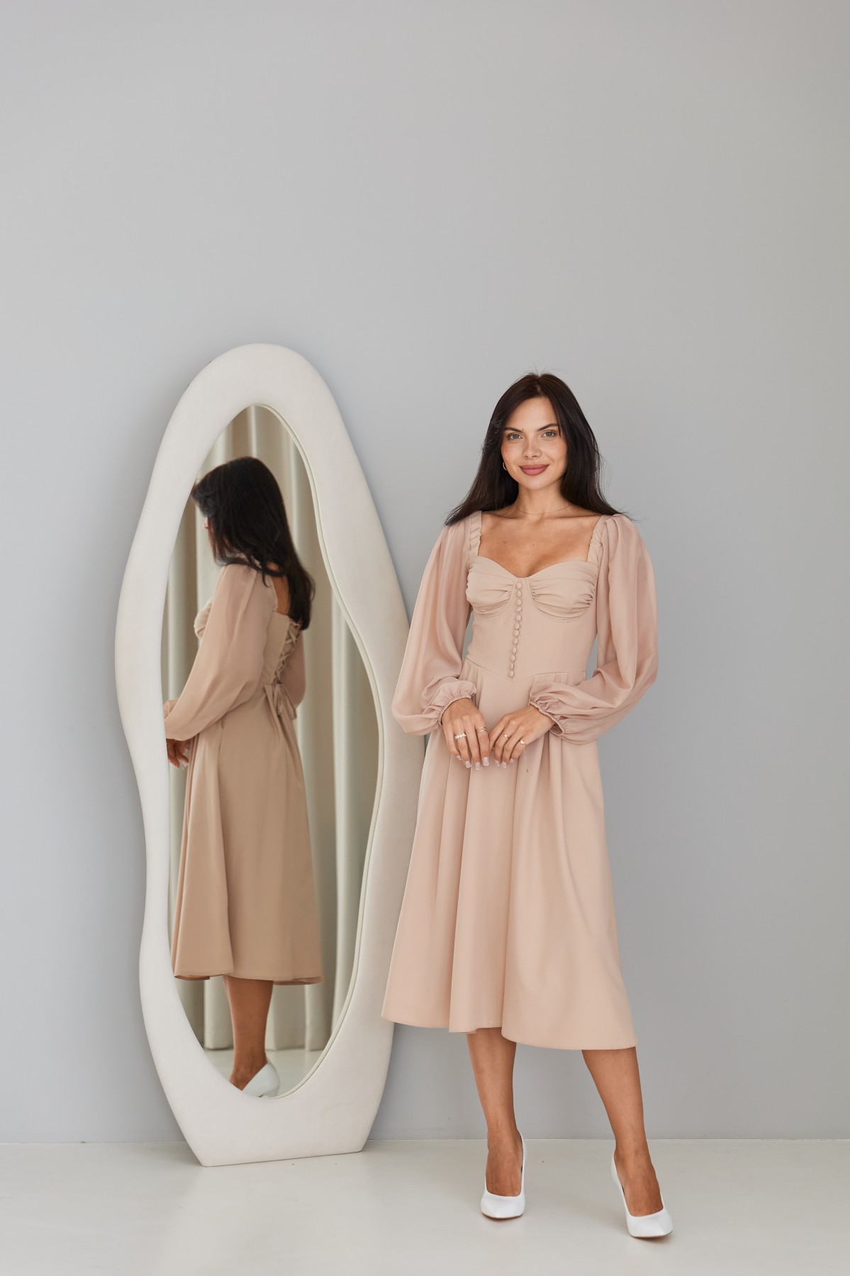 Сукня приталеного силуету з відкритим декольте в романтичному стилі. Ліф сукні - корсет із чашками, що дозволяє максимально підкреслити фігуру, спідниця клеш зі складами. По спинці виконано рядок ниткою гумкою і додаткове шнурування лаштунками, це забезпечує бездоганну посадку по вашій фігурі. Довжина сукні нижче коліна. Застібка з бокового шва на блискавці. Пишний рукав довжиною вище лінії ліктя, ширина рукава по низу регулюється гумкою. Кишені у підрізному бочці спідниці.