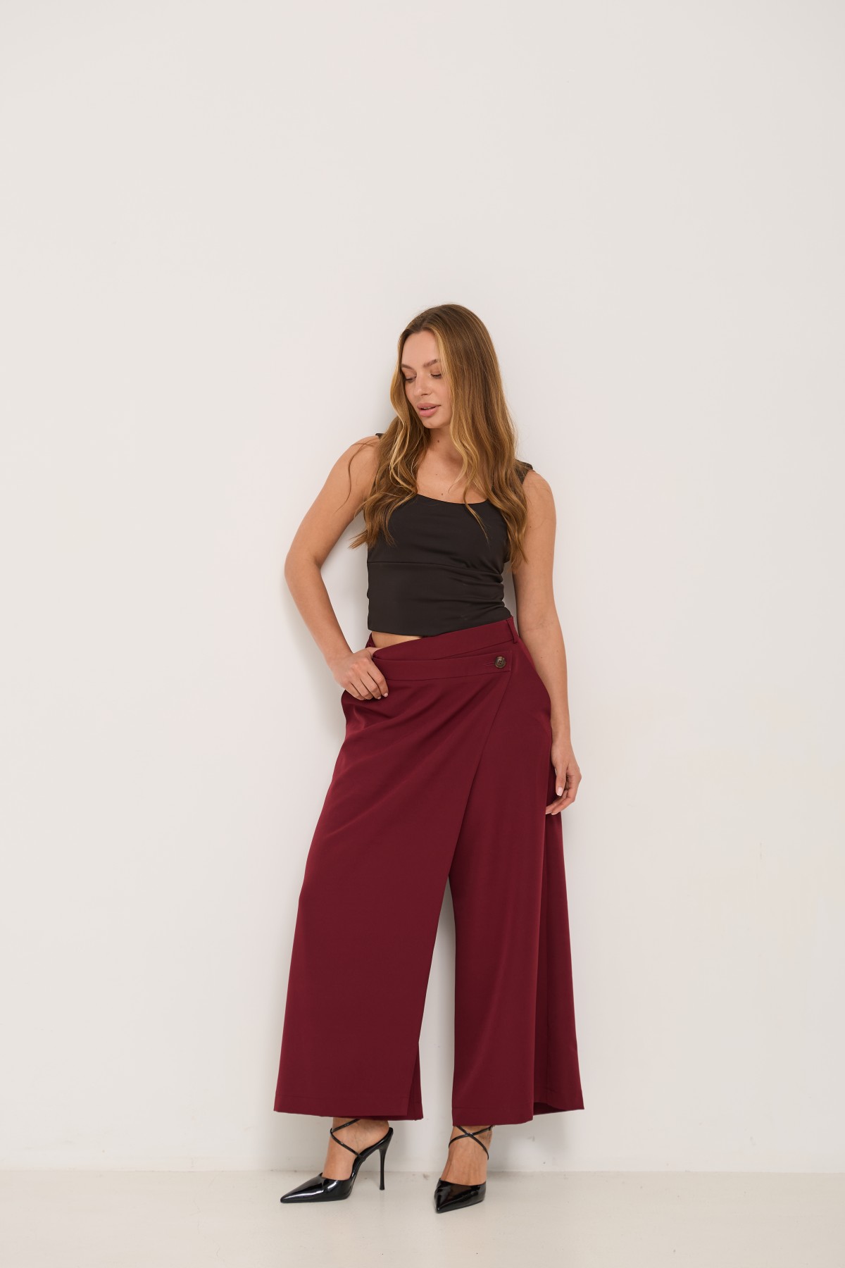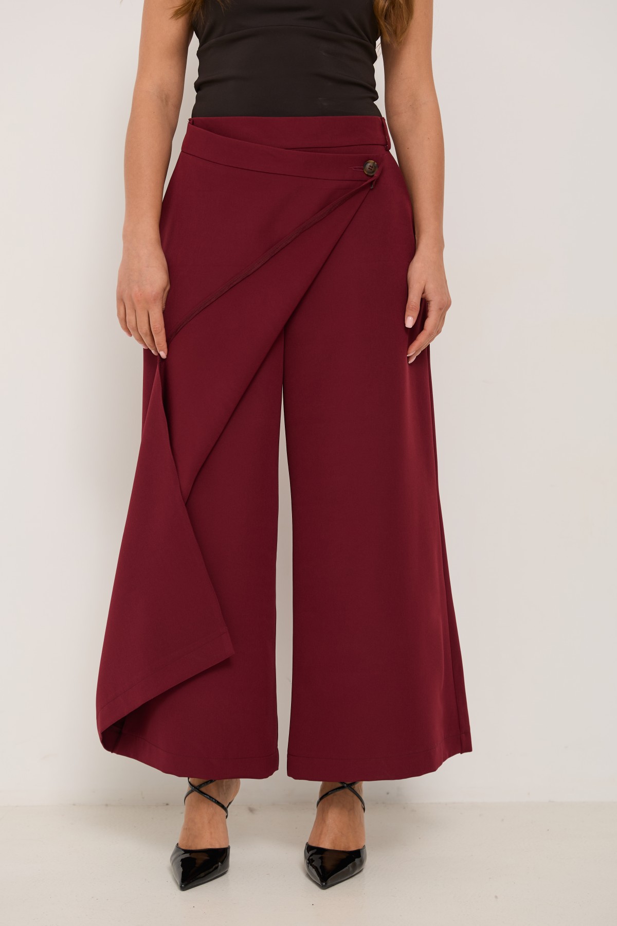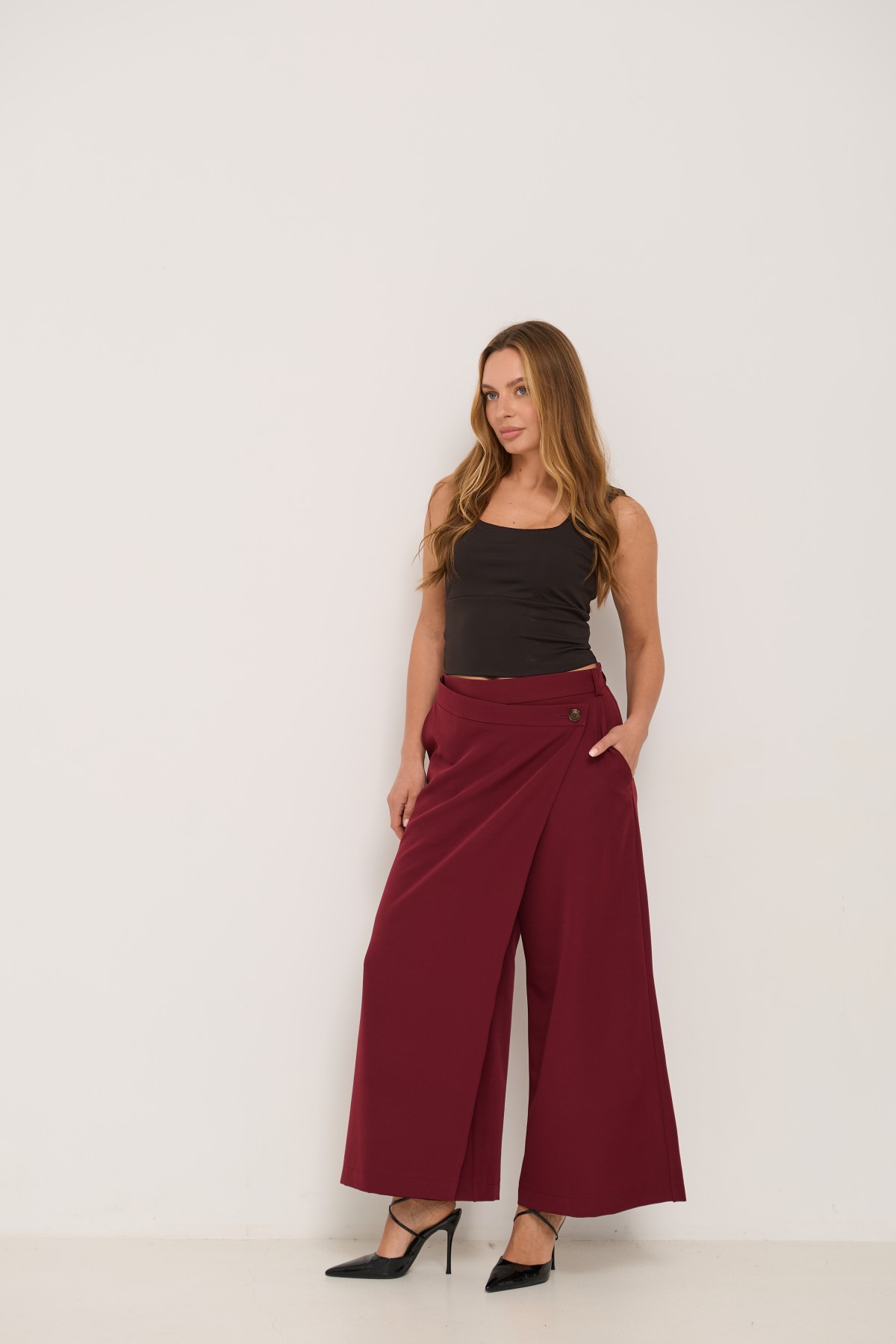 Брюки-спідниця широкого крою з костюмної тканини креп - з імітацією спідниці "на запах" по переду. Довжина брюк вище щиколоток. Маэмо кишені зручно розташовані. На брюках пояс по спинці на резинці - для зручності підбору розміру в талії. По переду спідниця закріплена гудзиком по діагоналі. Може використовуватись як ділові брюки-спідниця під будь які комбінації верху.
