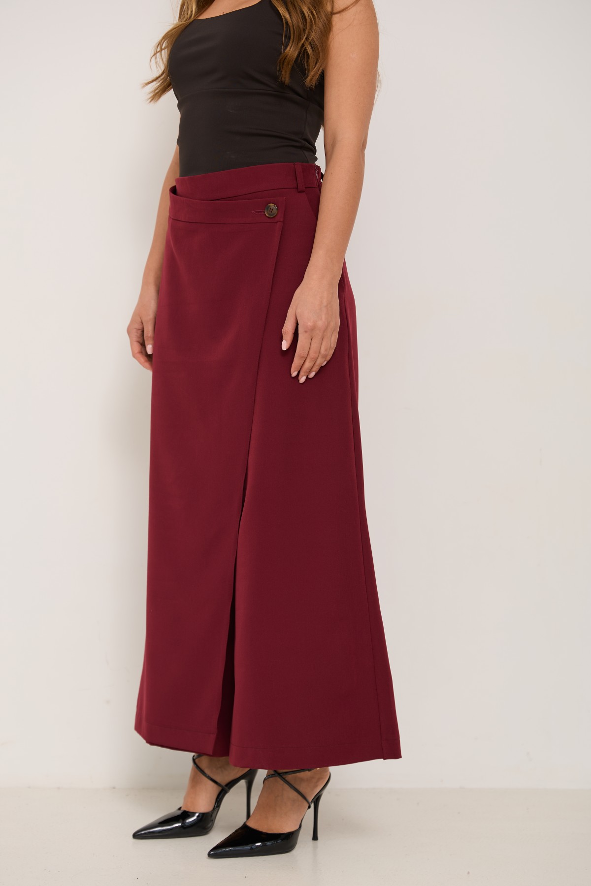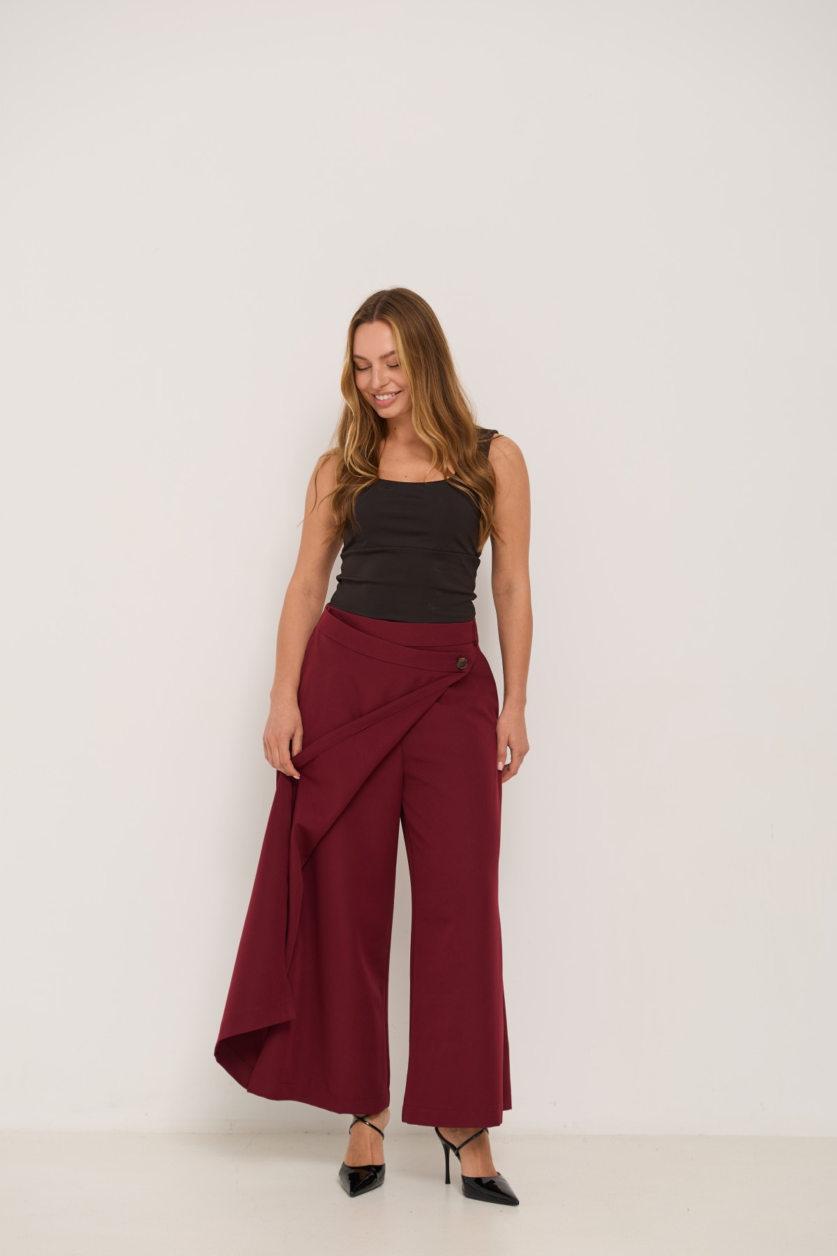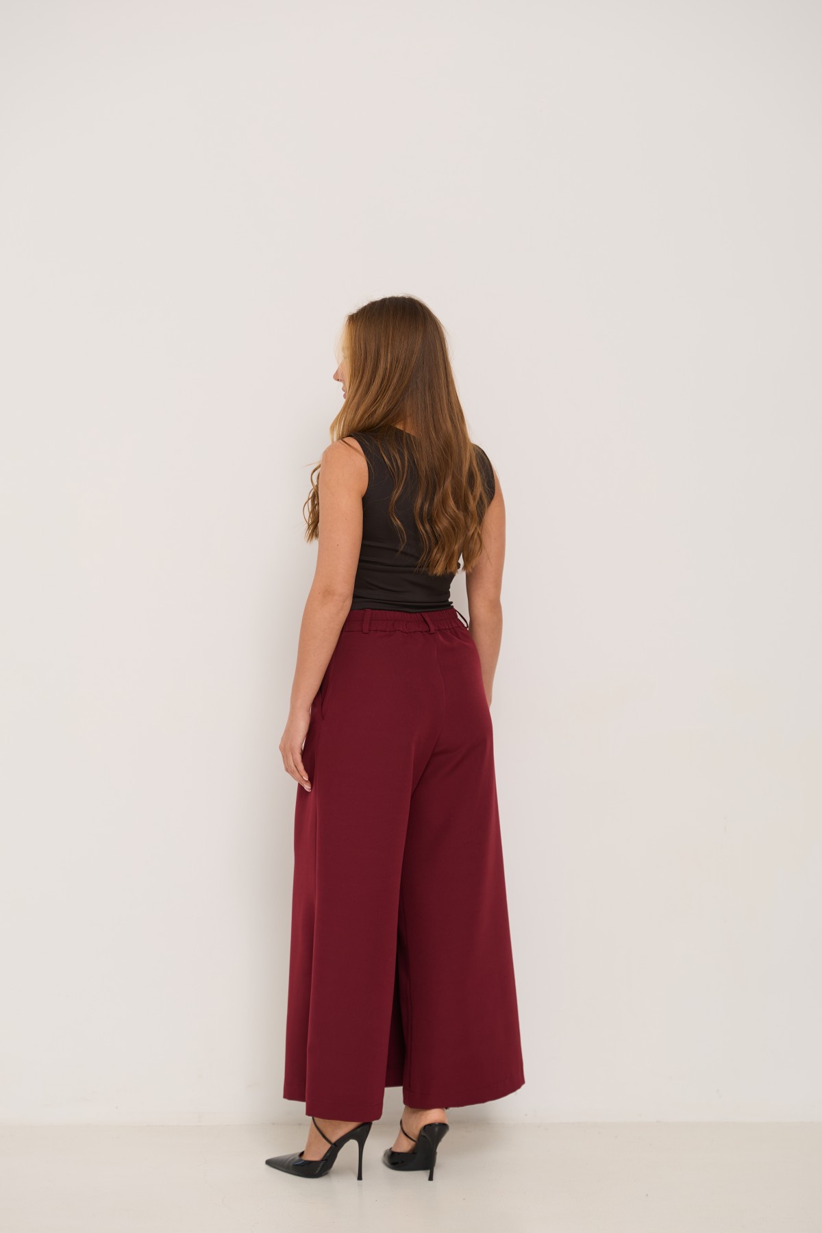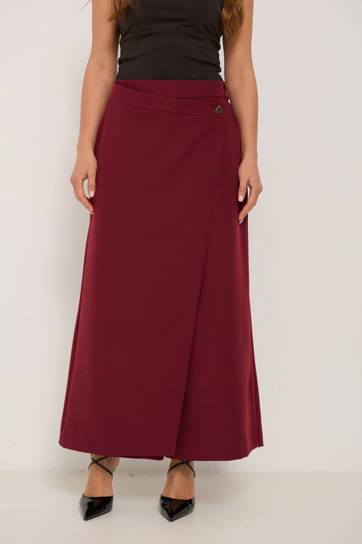 Брюки-спідниця широкого крою з костюмної тканини креп - з імітацією спідниці "на запах" по переду. Довжина брюк вище щиколоток. Маэмо кишені зручно розташовані. На брюках пояс по спинці на резинці - для зручності підбору розміру в талії. По переду спідниця закріплена гудзиком по діагоналі. Може використовуватись як ділові брюки-спідниця під будь які комбінації верху.