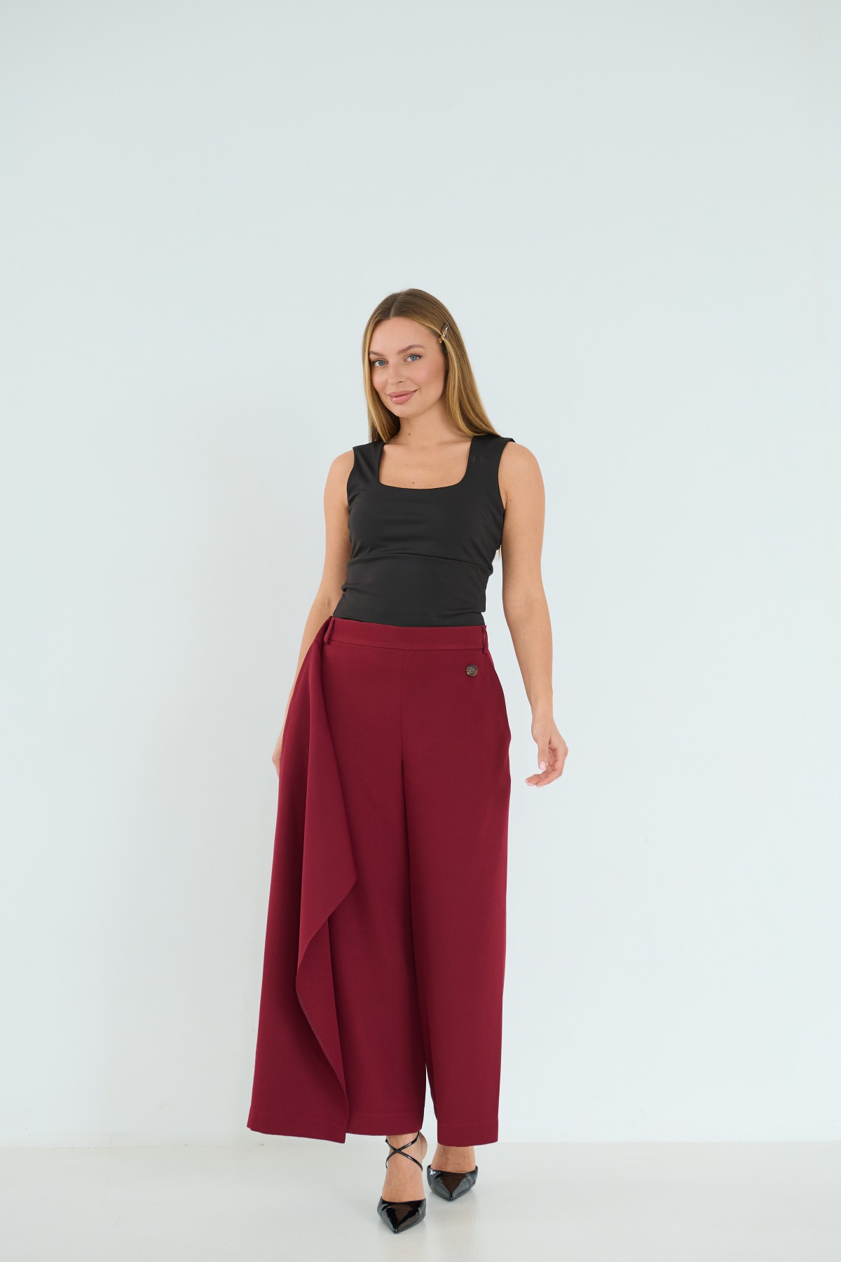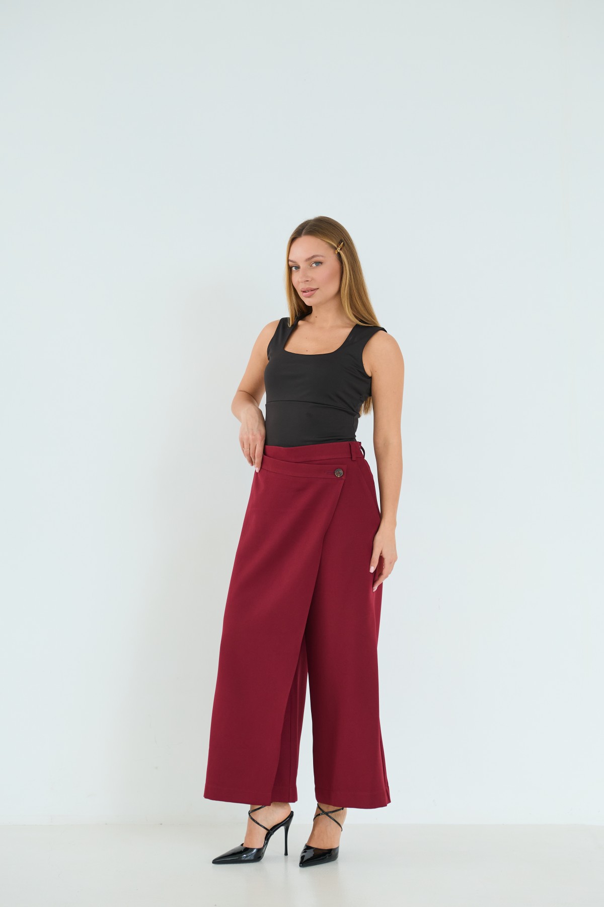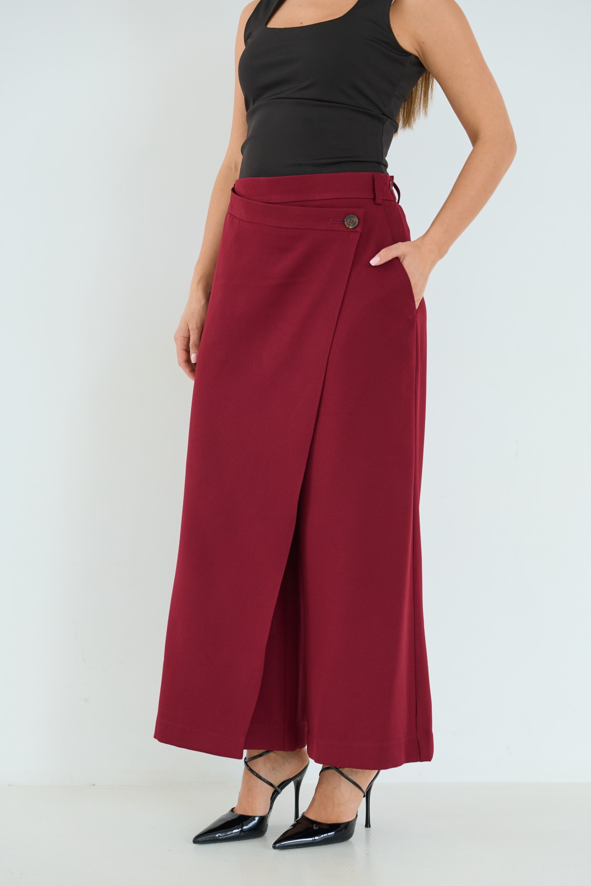 Брюки-спідниця широкого крою з костюмної тканини креп - з імітацією спідниці "на запах" по переду. Довжина брюк вище щиколоток. Маэмо кишені зручно розташовані. На брюках пояс по спинці на резинці - для зручності підбору розміру в талії. По переду спідниця закріплена гудзиком по діагоналі. Може використовуватись як ділові брюки-спідниця під будь які комбінації верху.