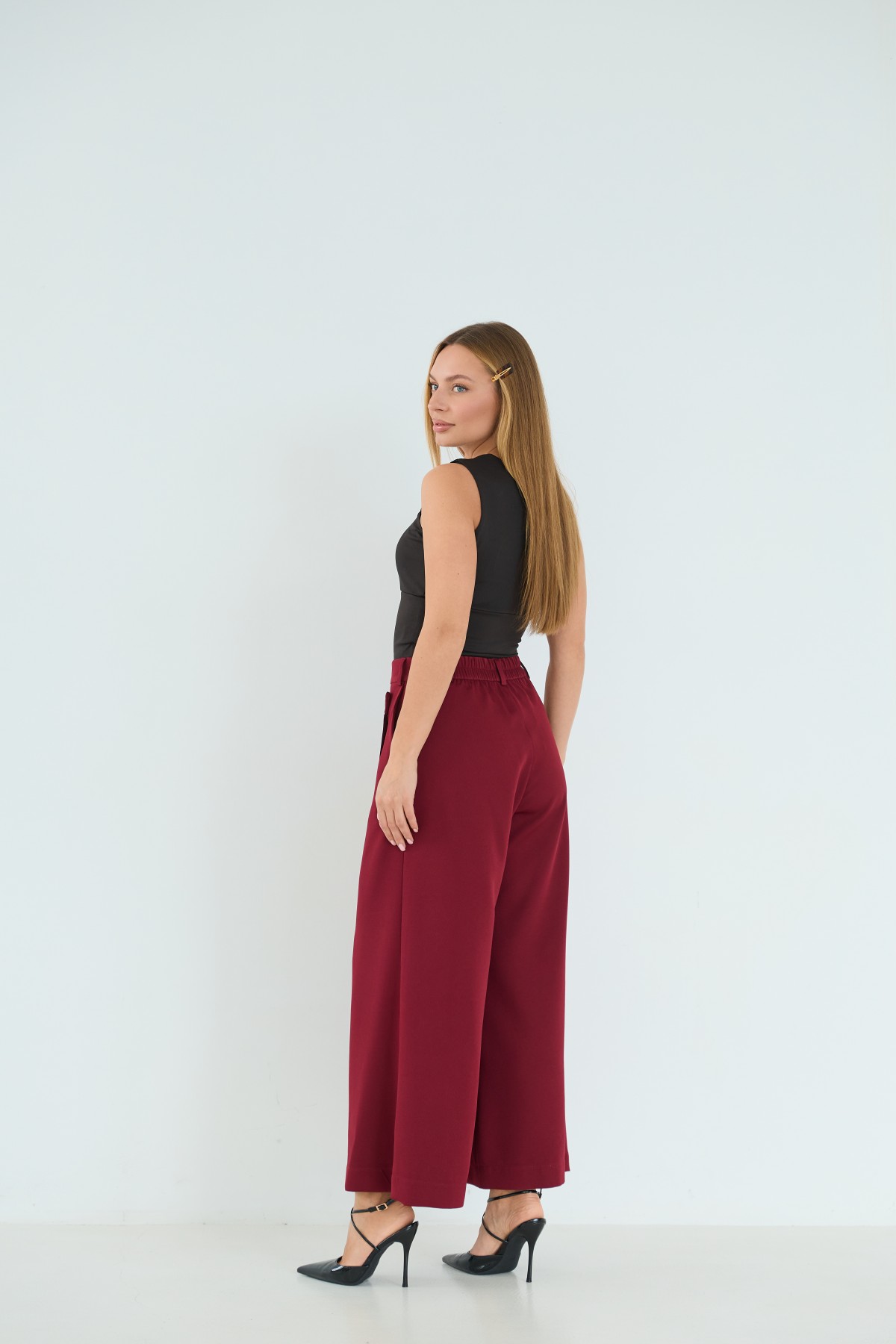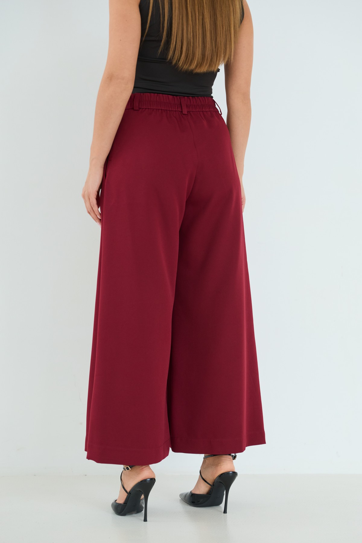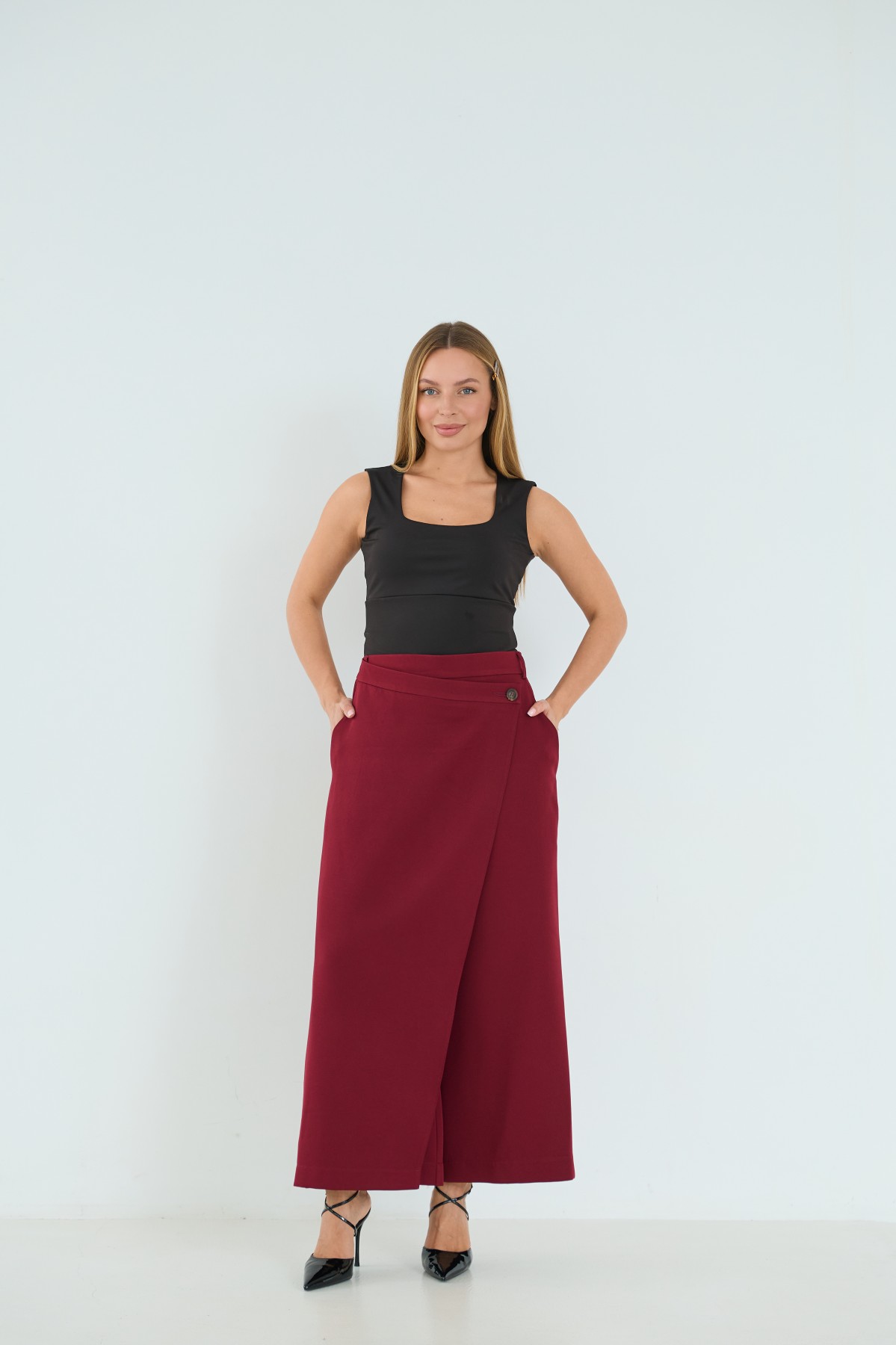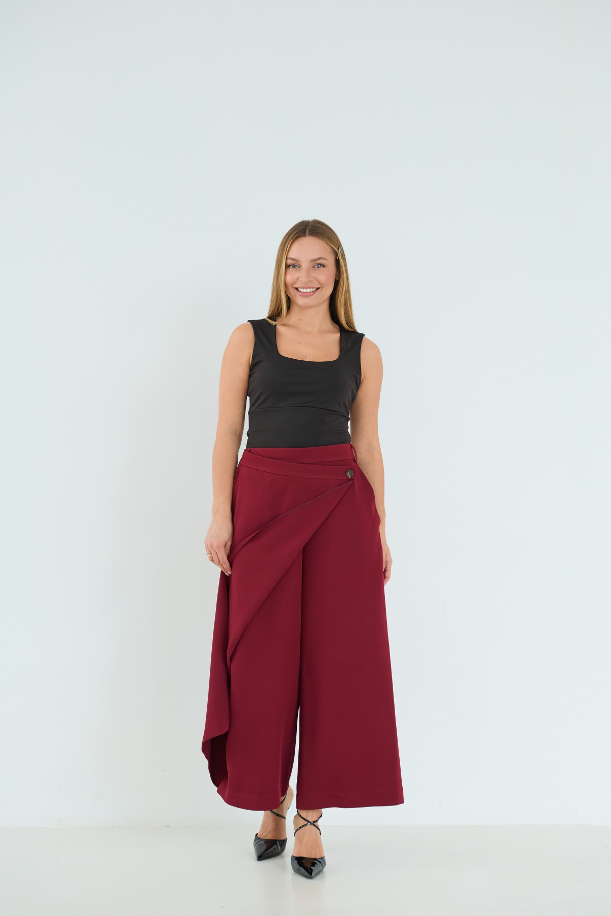 Брюки-спідниця широкого крою з костюмної тканини креп - з імітацією спідниці "на запах" по переду. Довжина брюк вище щиколоток. Маэмо кишені зручно розташовані. На брюках пояс по спинці на резинці - для зручності підбору розміру в талії. По переду спідниця закріплена гудзиком по діагоналі. Може використовуватись як ділові брюки-спідниця під будь які комбінації верху.