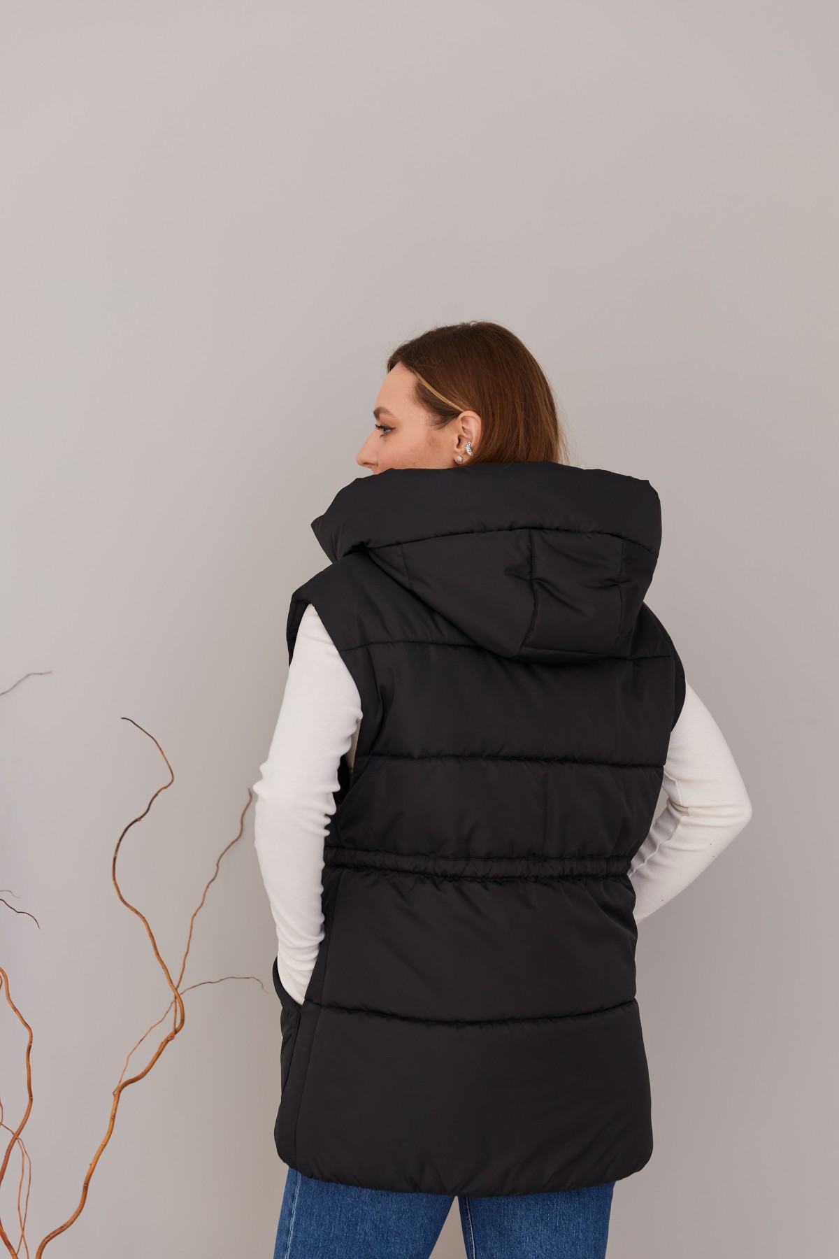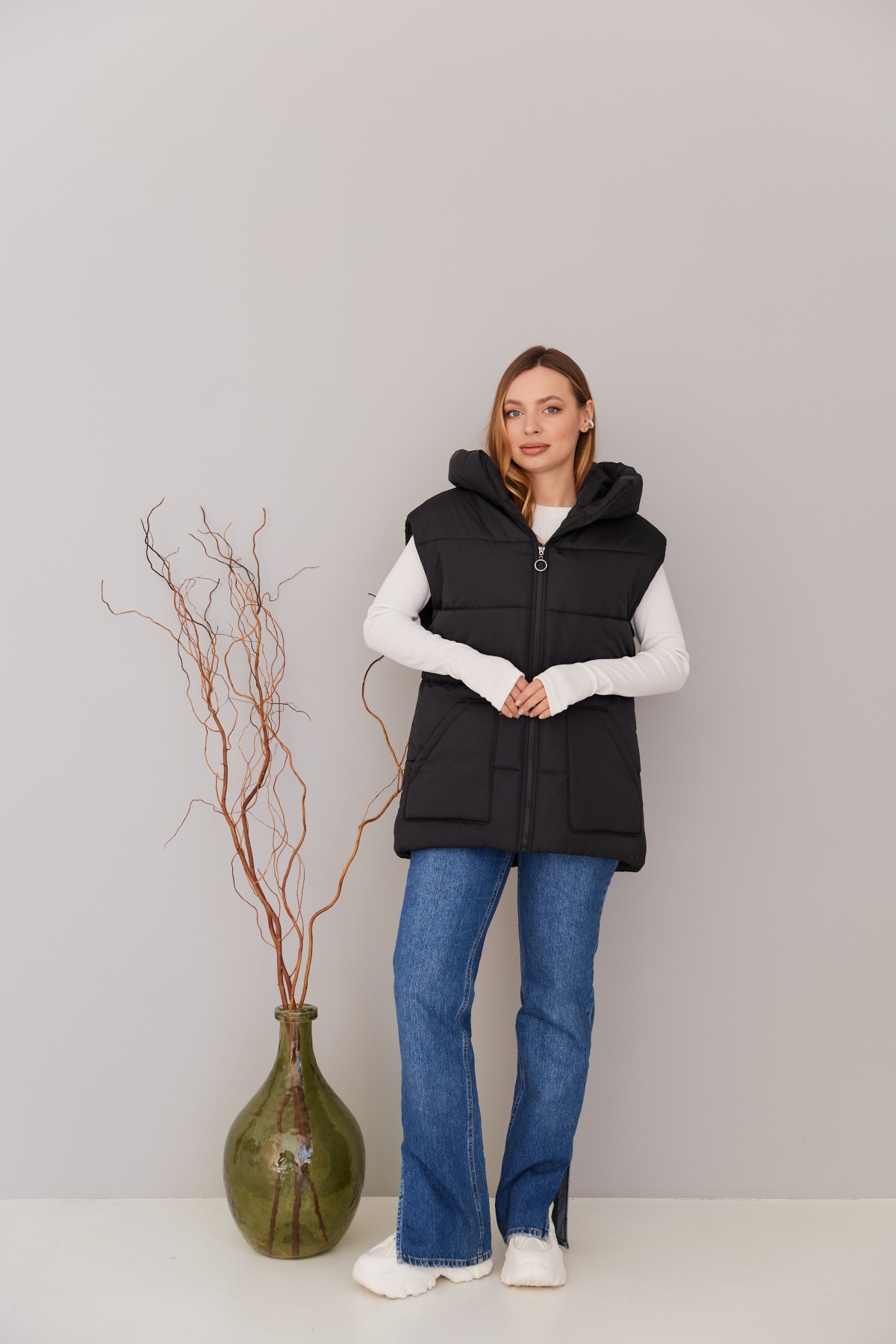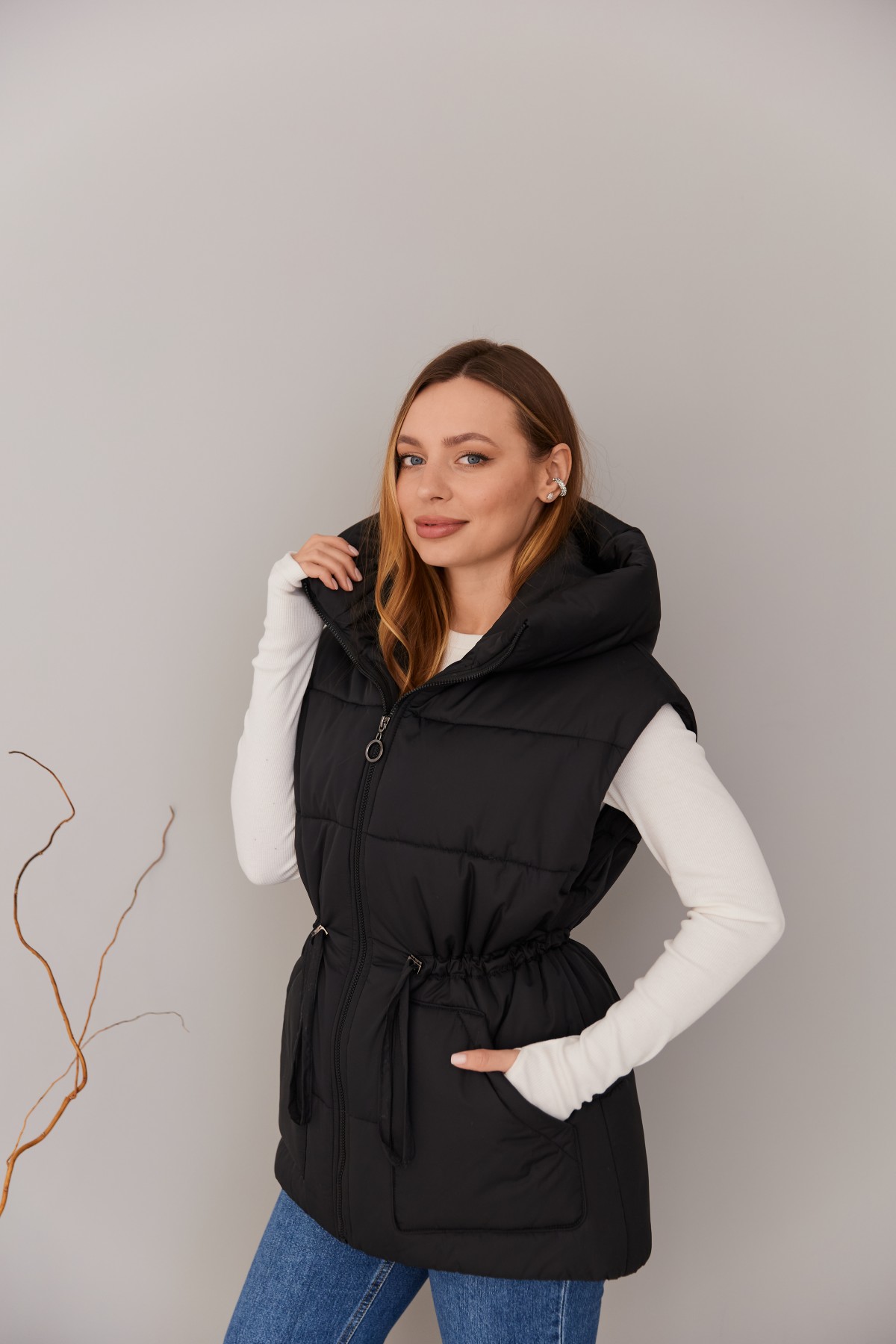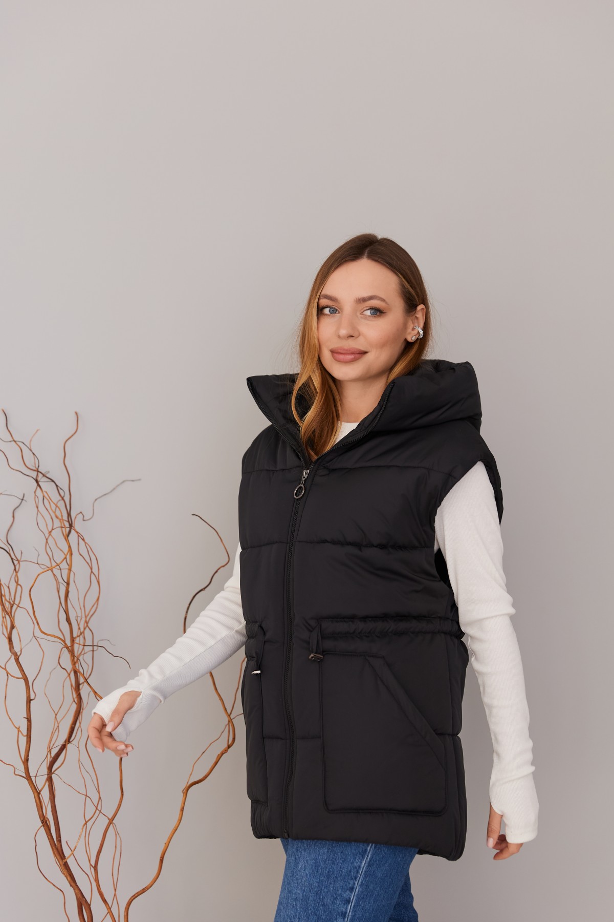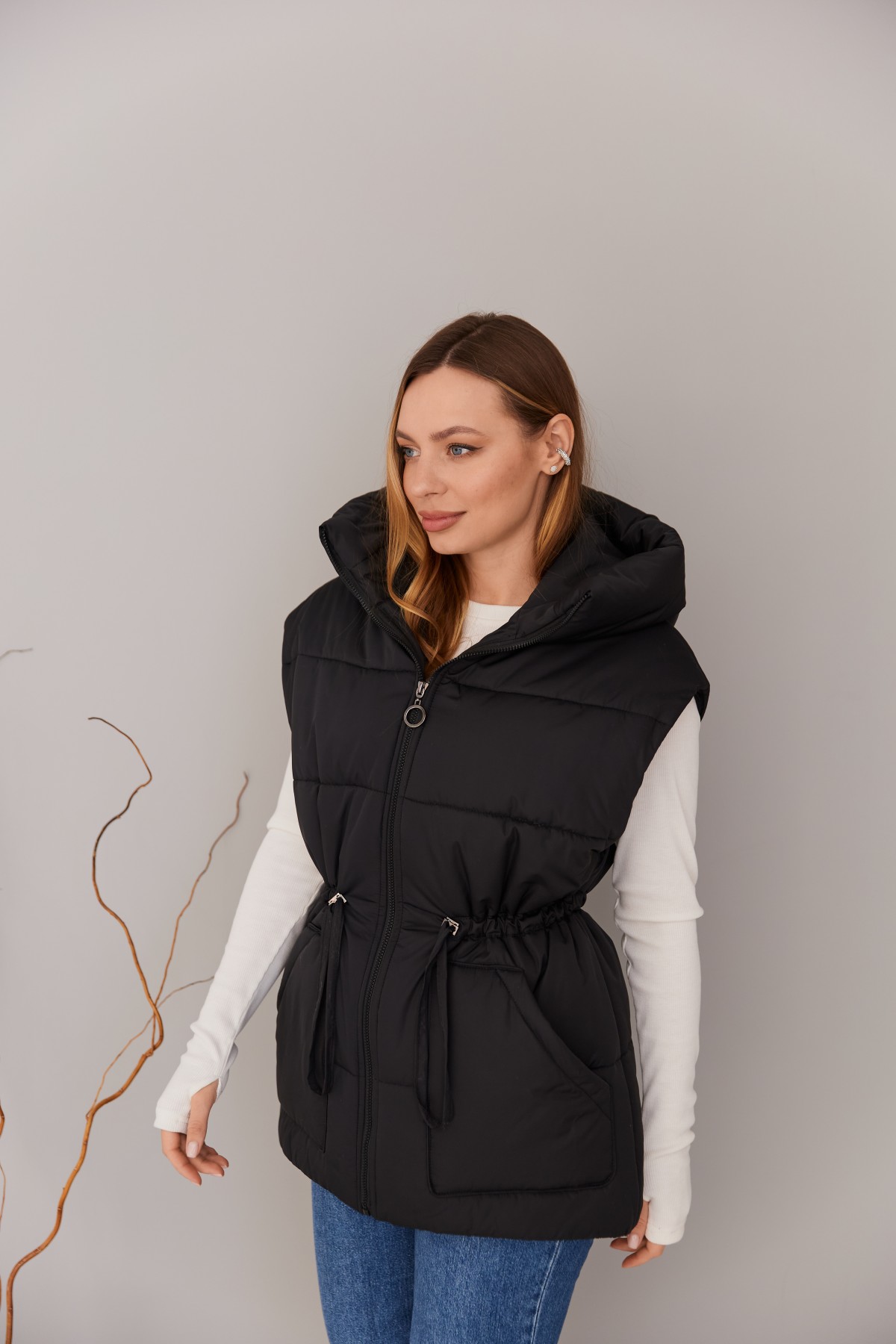 Стильний жилет вільного крою, лінія плеча спущена. Довжина жилета до середини стегна. Блискавка в центрі переду. Кишеня накладна фігурна.Капюшон із обтачкою по краю. Куліса по лінії талії фіксується тонким пояском із фіксатором. Жилети ще один тренд майбутнього сезону! Такі прямі, помірного обсягу, можна носити у повсякденному житті та на прогулянці, поверх сорочок та спортивних костюмів. Особливо добре поєднуватиметься цей жилет з нашими спортивними костюмами.