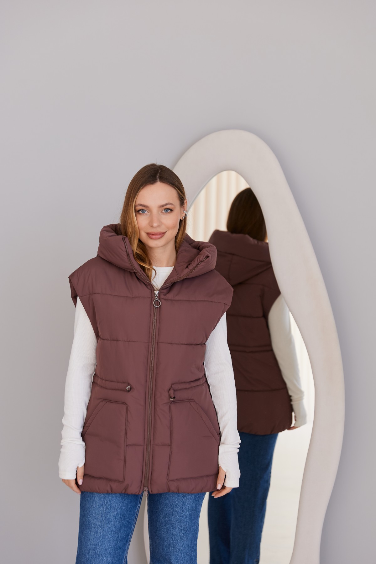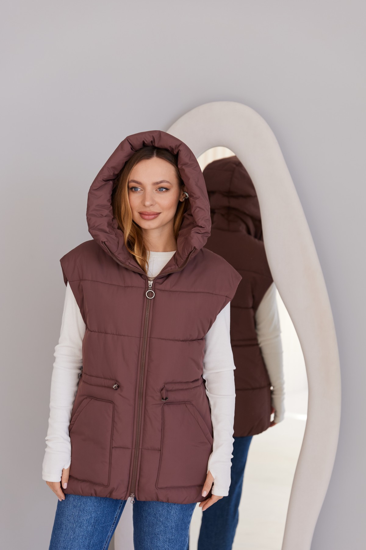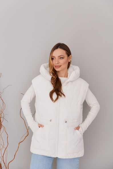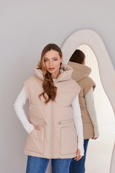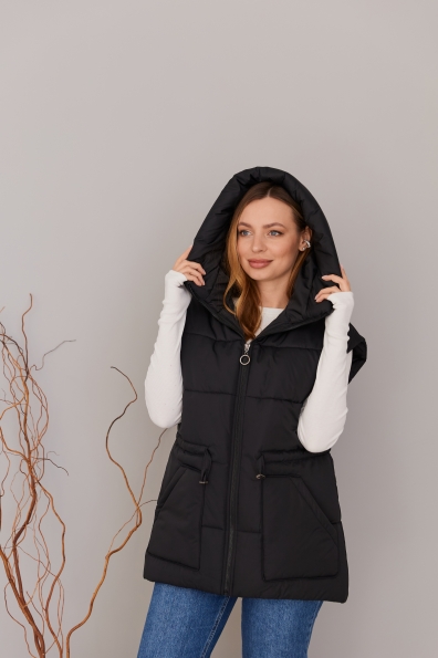 Стильний жилет вільного крою, лінія плеча спущена. Довжина жилета до середини стегна. Блискавка в центрі переду. Кишеня накладна фігурна.Капюшон із обтачкою по краю. Куліса по лінії талії фіксується тонким пояском із фіксатором. Жилети ще один тренд майбутнього сезону! Такі прямі, помірного обсягу, можна носити у повсякденному житті та на прогулянці, поверх сорочок та спортивних костюмів. Особливо добре поєднуватиметься цей жилет з нашими спортивними костюмами.