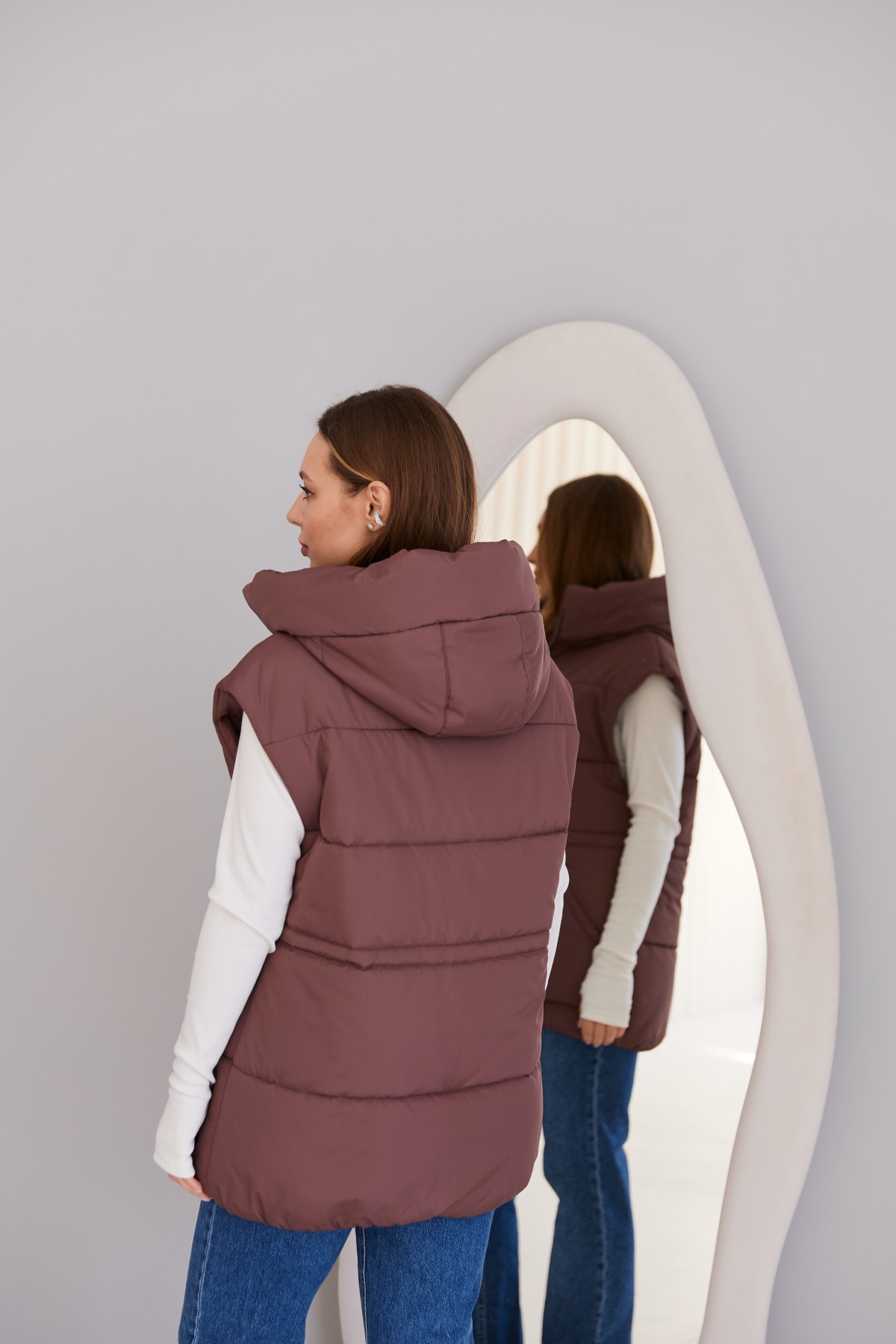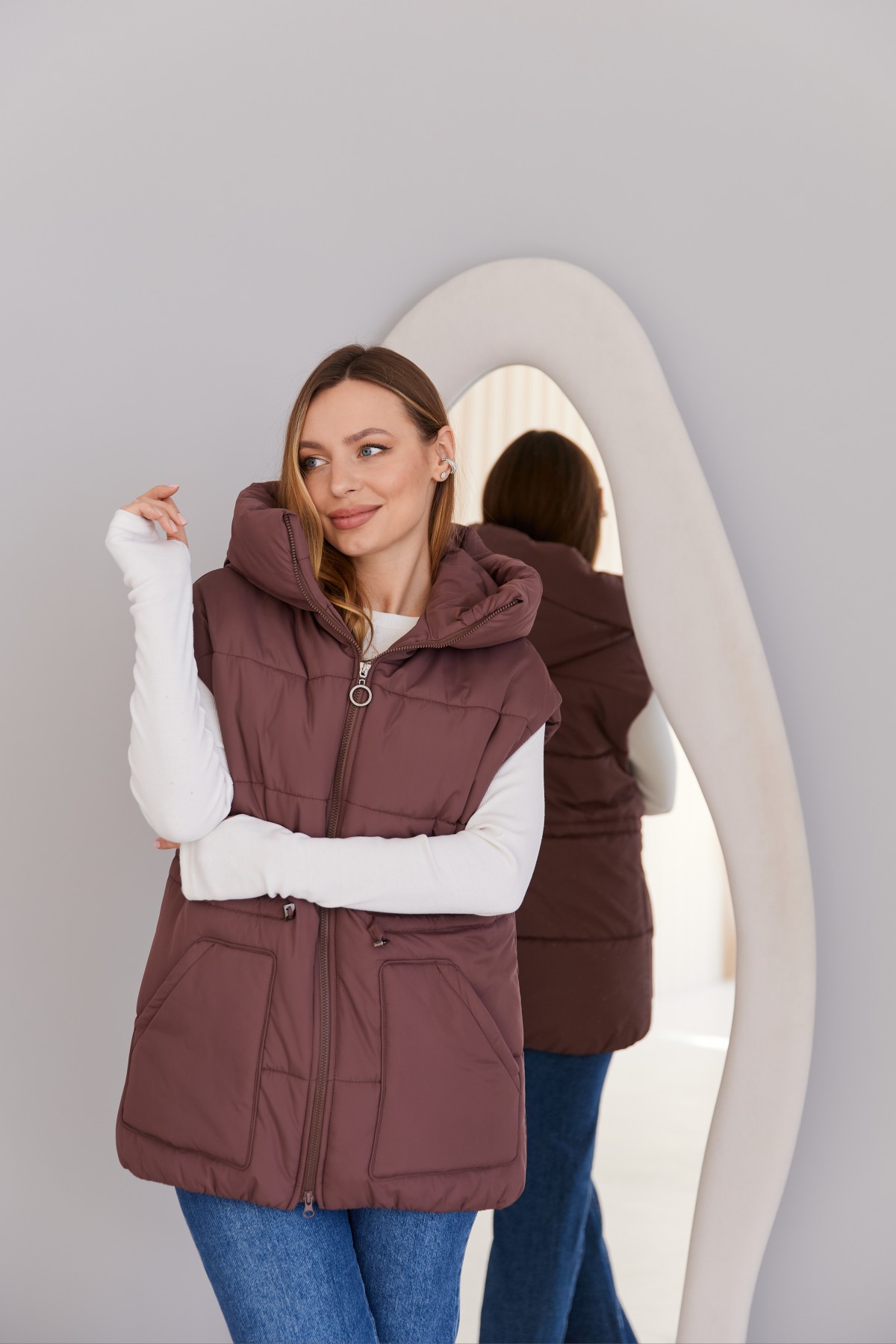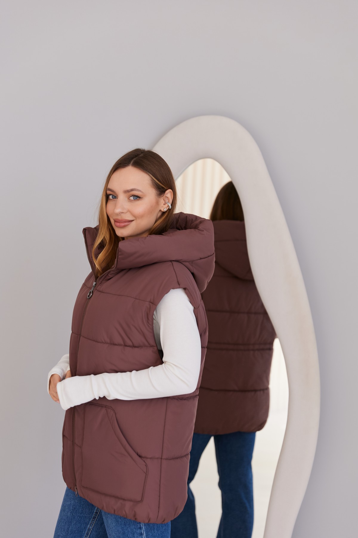Стильний жилет вільного крою, лінія плеча спущена. Довжина жилета до середини стегна. Блискавка в центрі переду. Кишеня накладна фігурна.Капюшон із обтачкою по краю. Куліса по лінії талії фіксується тонким пояском із фіксатором. Жилети ще один тренд майбутнього сезону! Такі прямі, помірного обсягу, можна носити у повсякденному житті та на прогулянці, поверх сорочок та спортивних костюмів. Особливо добре поєднуватиметься цей жилет з нашими спортивними костюмами.