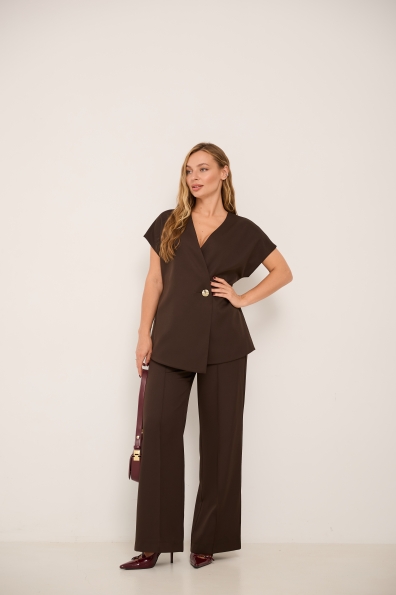 Брюки "легкий клеш" классического кроя с застроченной стрелкой по центру переднего полотнища.Довжина жилету до середини стегон, вільного сілуету, спущене плече імітує короткий рукав та маємо універсальну довжину штанів призначену для носіння під підбори, так і під взуття на низьких підборах.На штанах кишені зручно розташовані у підрізному бочці.На жилетці маємо тоненький пасок з основної тканини, та на брюках пояс на резинці.Може використовуватись як діловий костюм, та нарядний костюм на вихід.