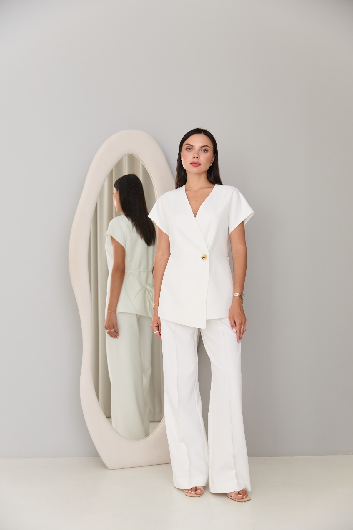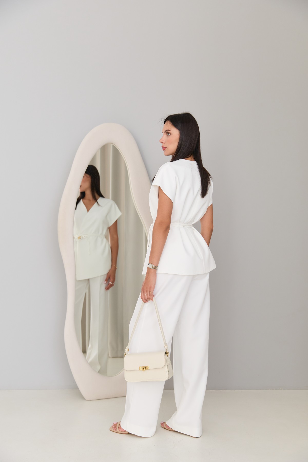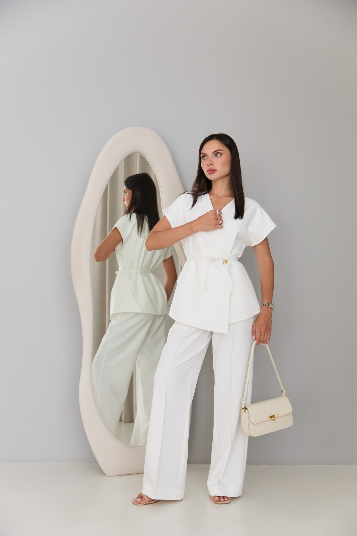 Брюки "легкий клеш" классического кроя с застроченной стрелкой по центру переднего полотнища.Довжина жилету до середини стегон, вільного сілуету, спущене плече імітує короткий рукав та маємо універсальну довжину штанів призначену для носіння під підбори, так і під взуття на низьких підборах.На штанах кишені зручно розташовані у підрізному бочці.На жилетці маємо тоненький пасок з основної тканини, та на брюках пояс на резинці.Може використовуватись як діловий костюм, та нарядний костюм на вихід.