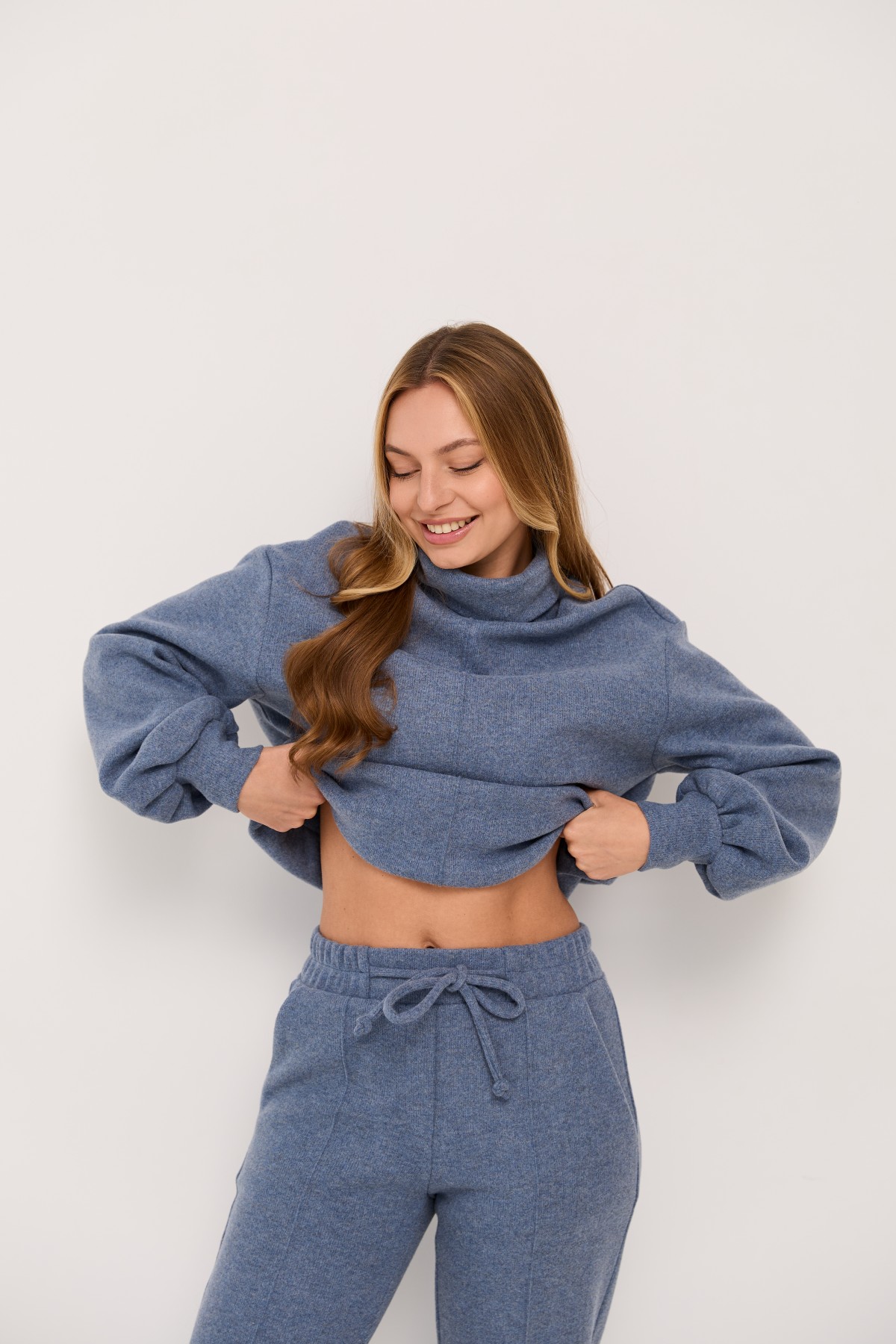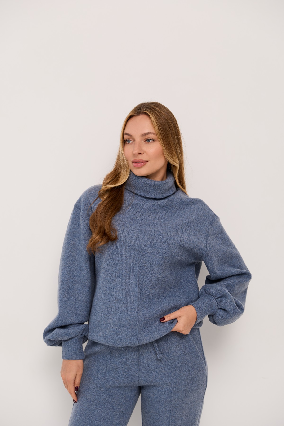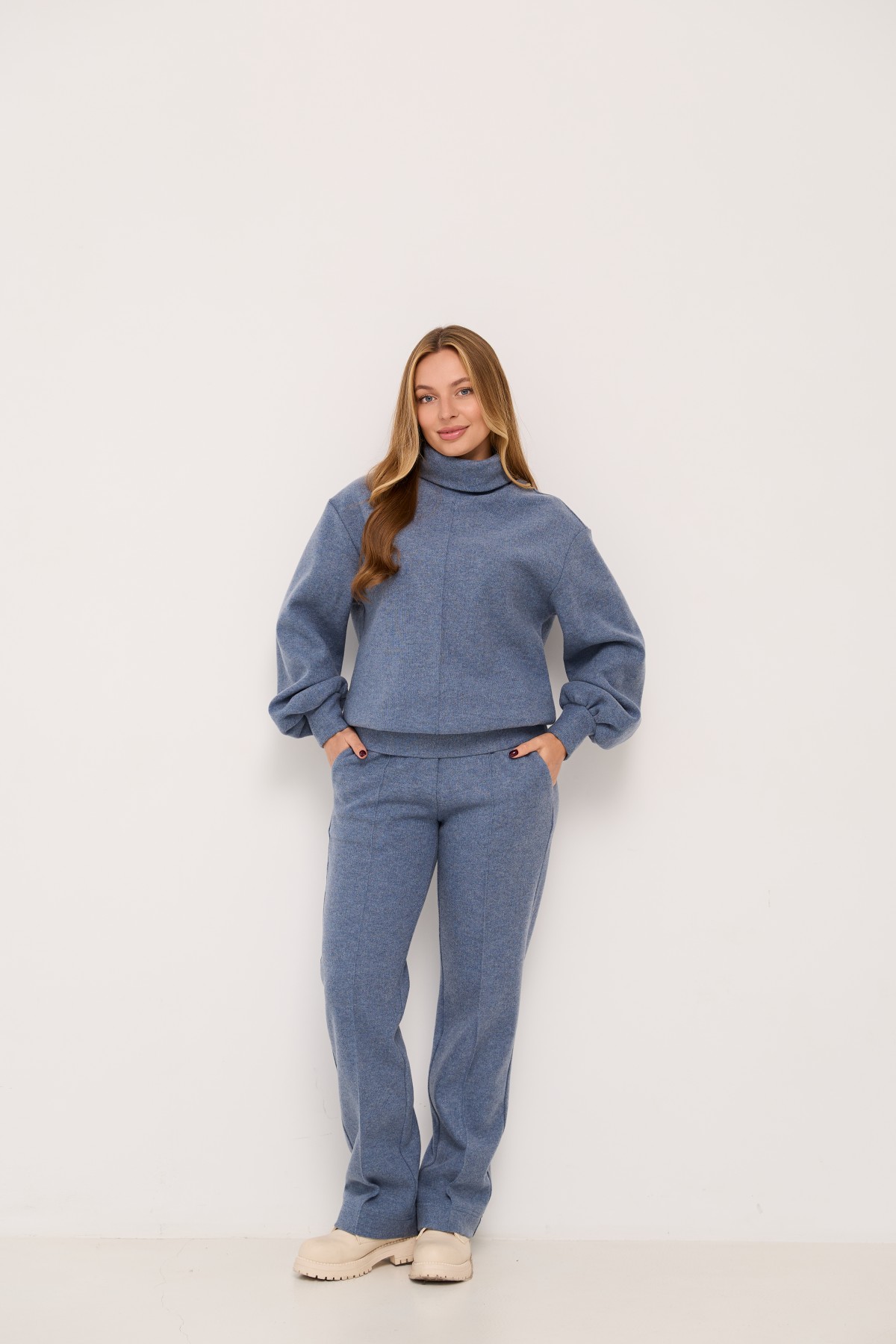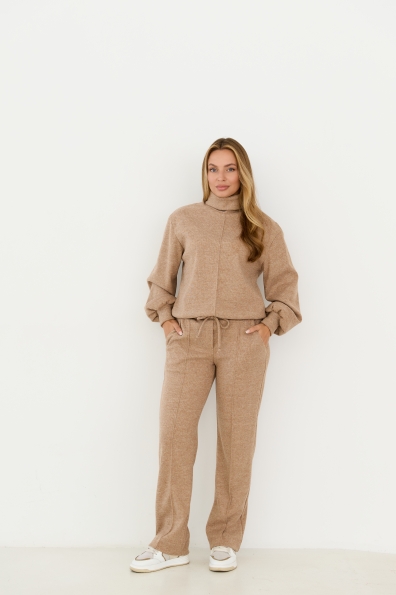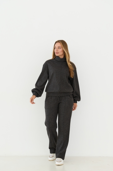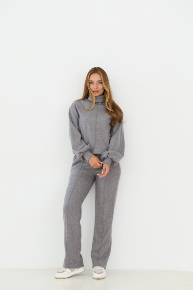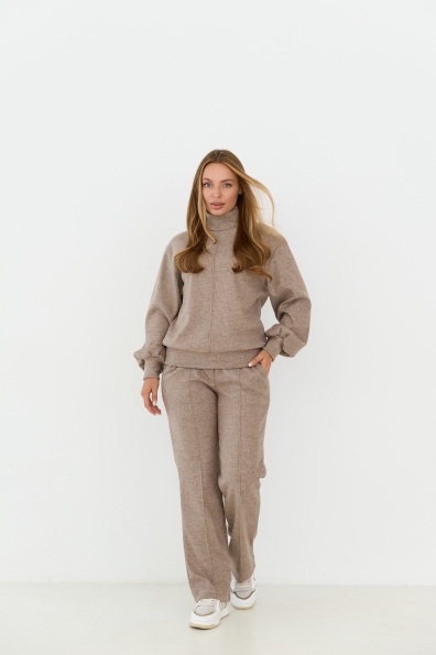 Костюм виконаний у стилі спорт-шик, світшот прямого силуету штани класичного крою. Світшот довжиною до стегна, штани до щиколотки. У штанах пояс на резинці. Одношовний, довжиною до запястя. На штанах кишені зручно розташовані у бічному шві. Костюм чудово поєднує в собі зручність та елегантність, його можна носити під різні варіанти взуття на низьких підборах. Доповнивши образ взуттям на високих підборах, можна відвідати урочистий захід або поїхати на романтичне побачення.