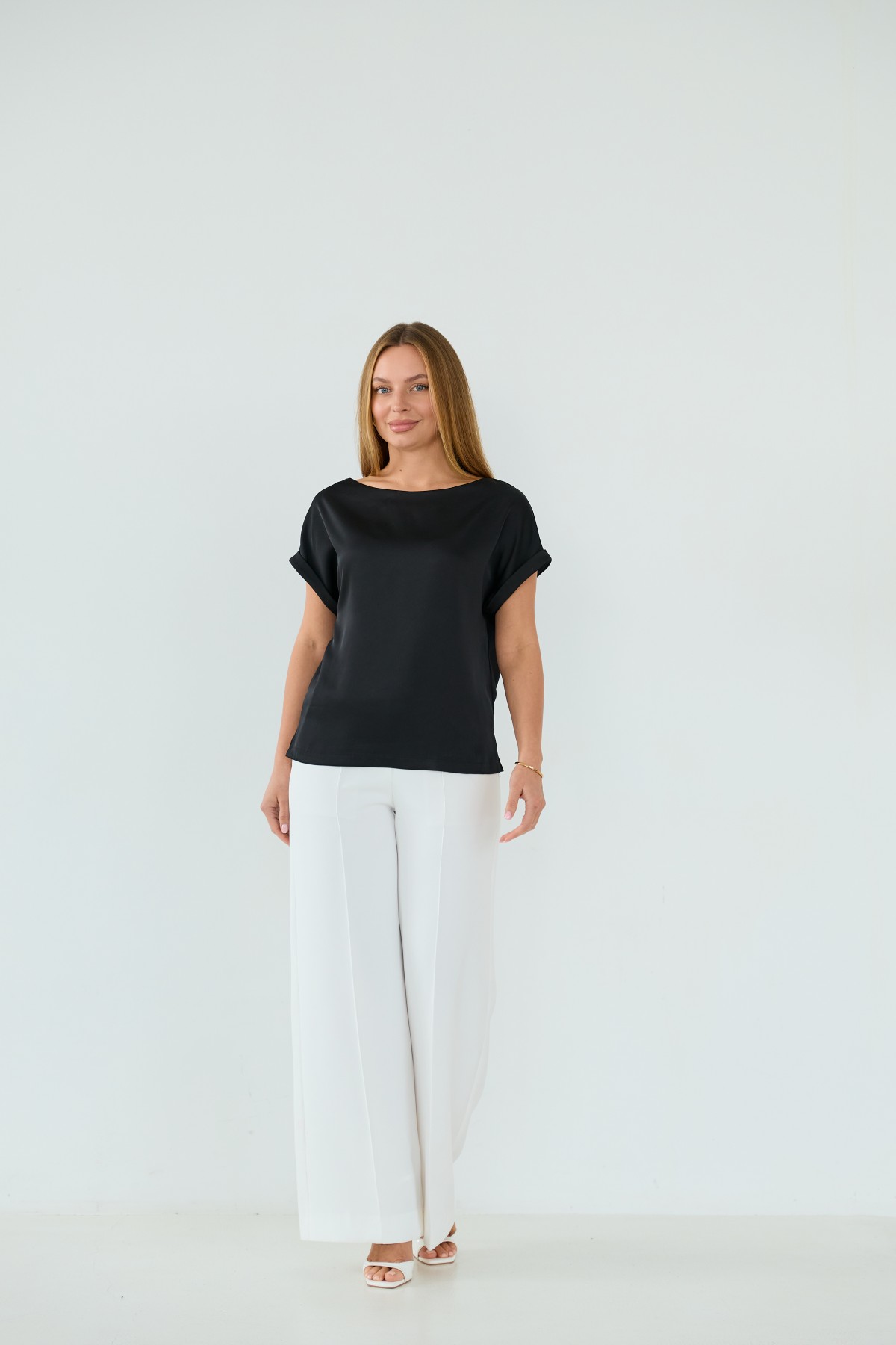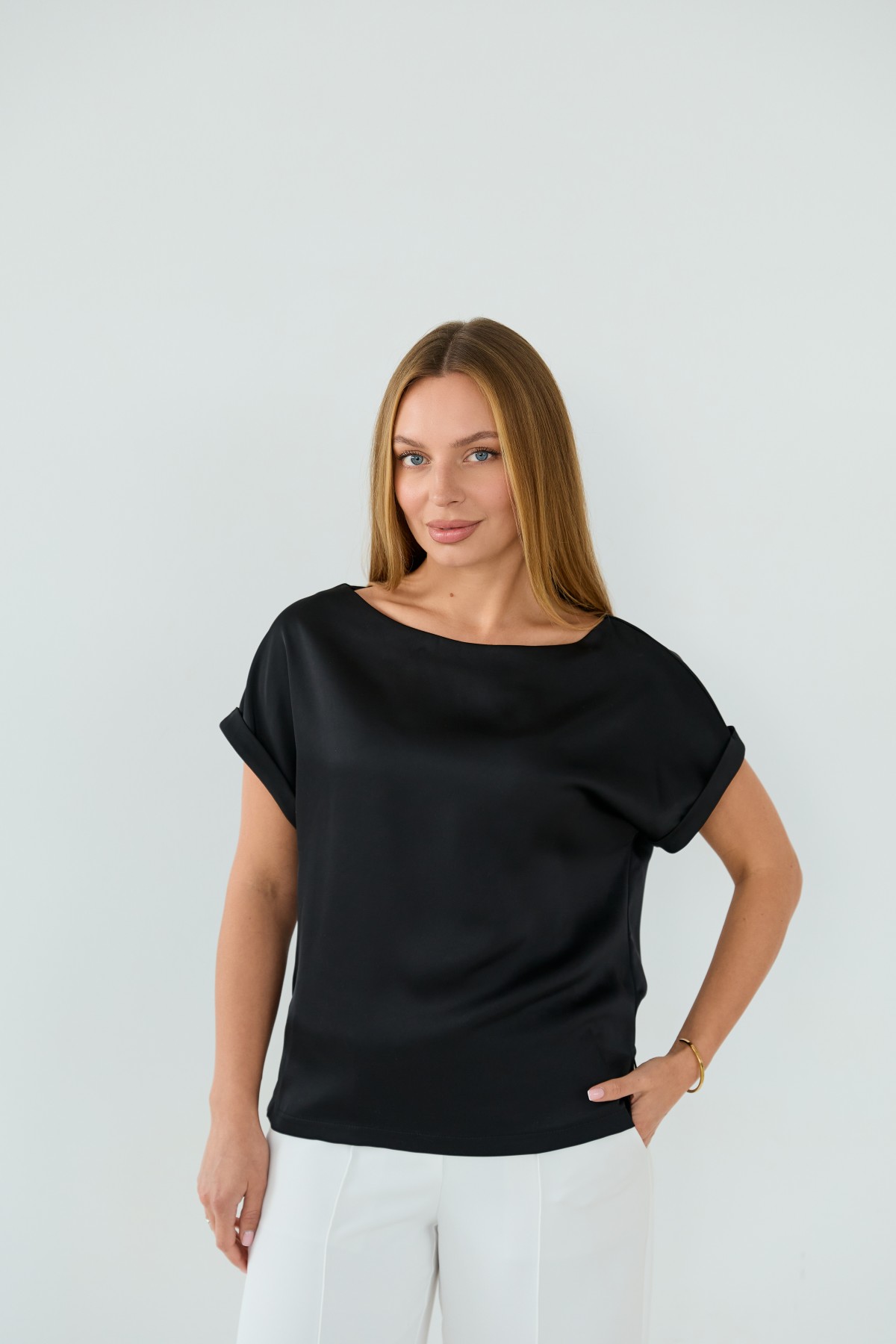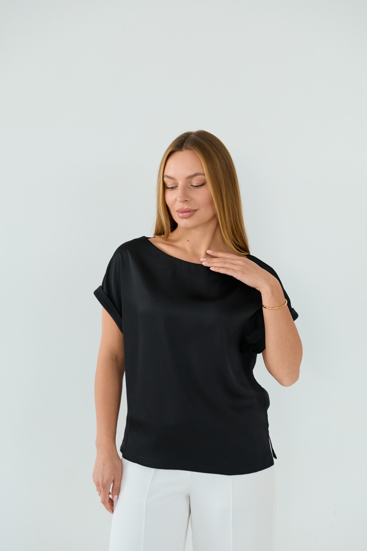 Свободна легка шелкова футболка з коротким рукавом, по боках є розрізи, довжиною до бедра. Класична практична футболка - блуза з атласного шелку дабл, проста, але у той же час таку річ можна одягати під різні варіанти брюк, спідниць, жакетів чи жилеток.