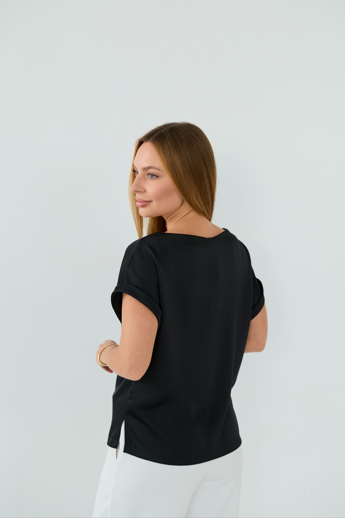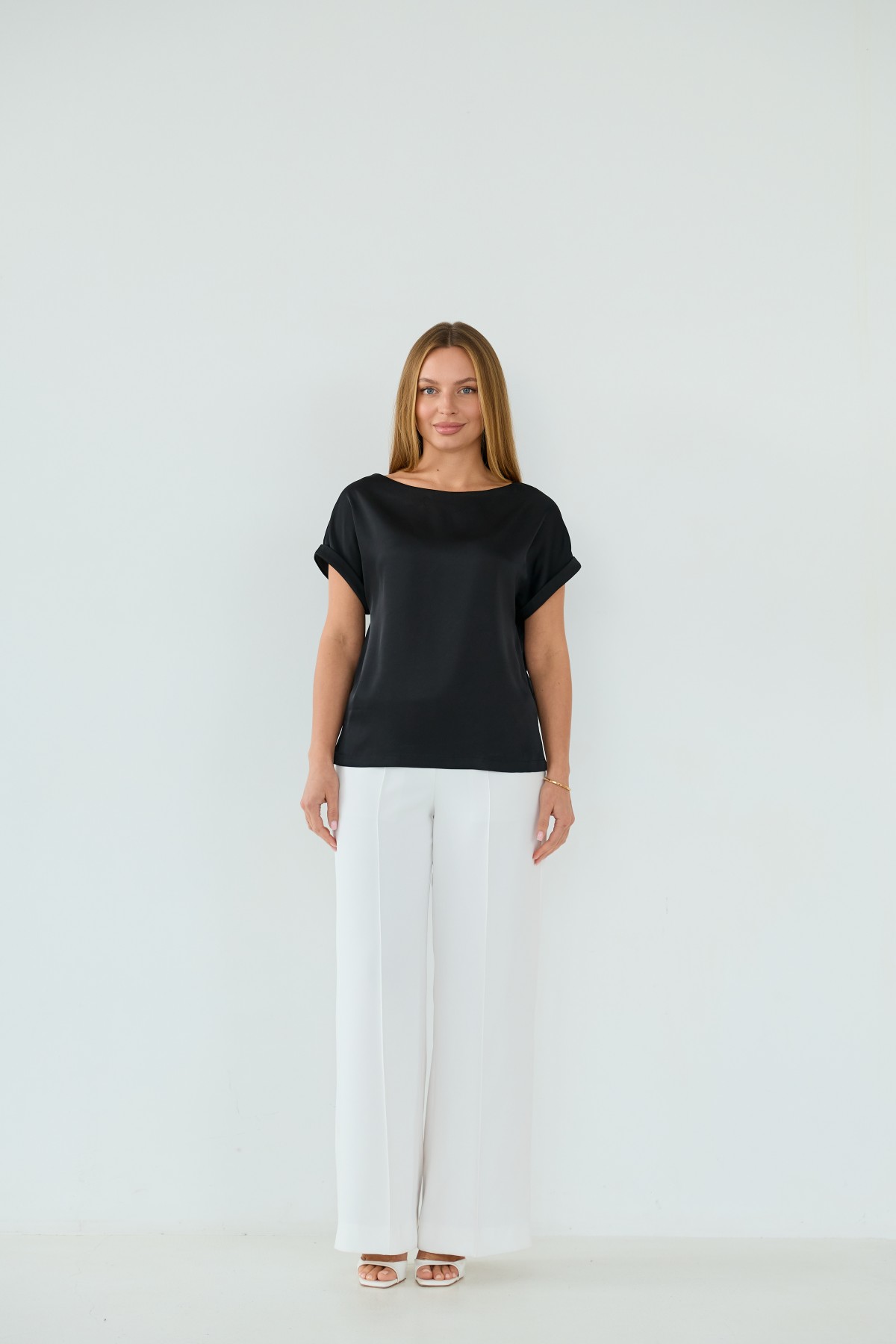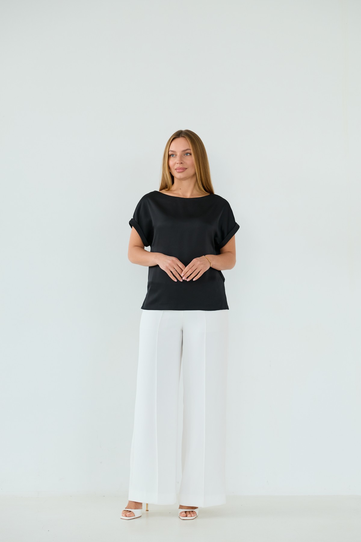 Свободна легка шелкова футболка з коротким рукавом, по боках є розрізи, довжиною до бедра. Класична практична футболка - блуза з атласного шелку дабл, проста, але у той же час таку річ можна одягати під різні варіанти брюк, спідниць, жакетів чи жилеток.