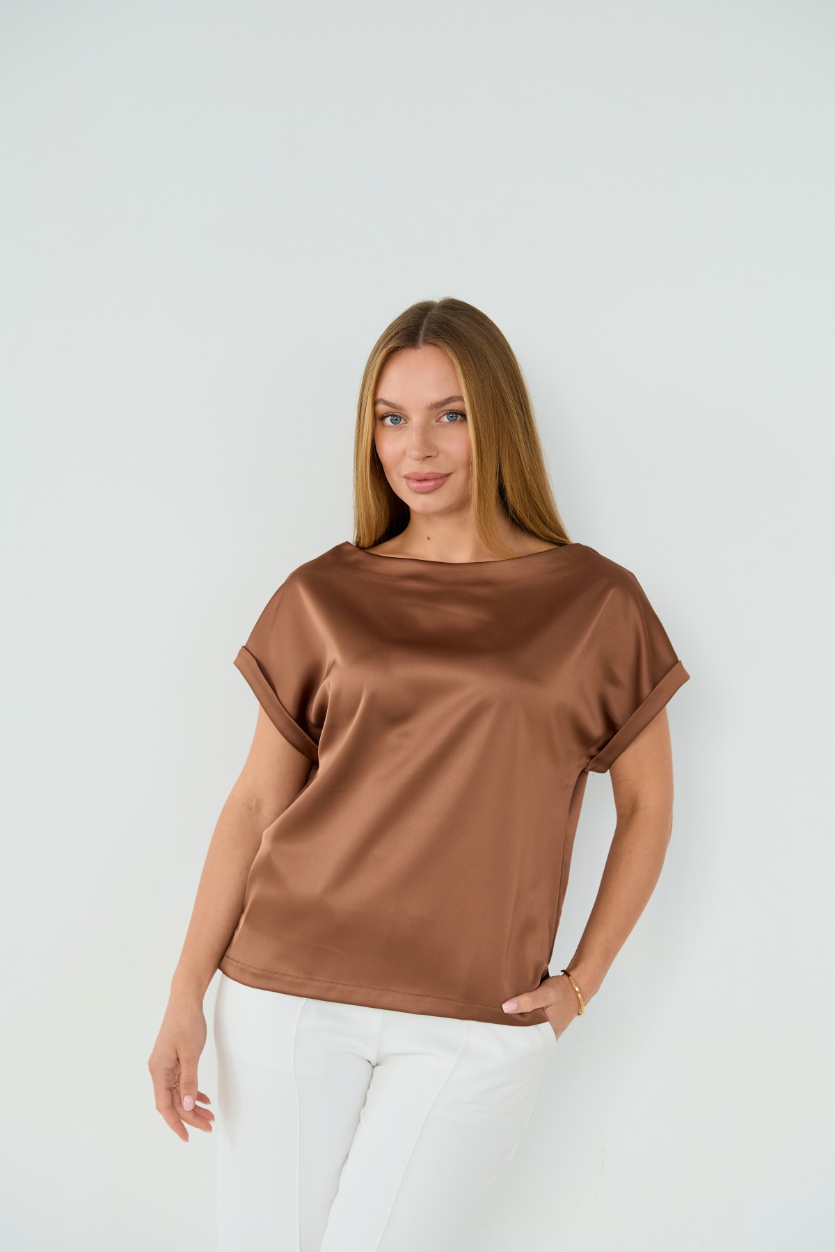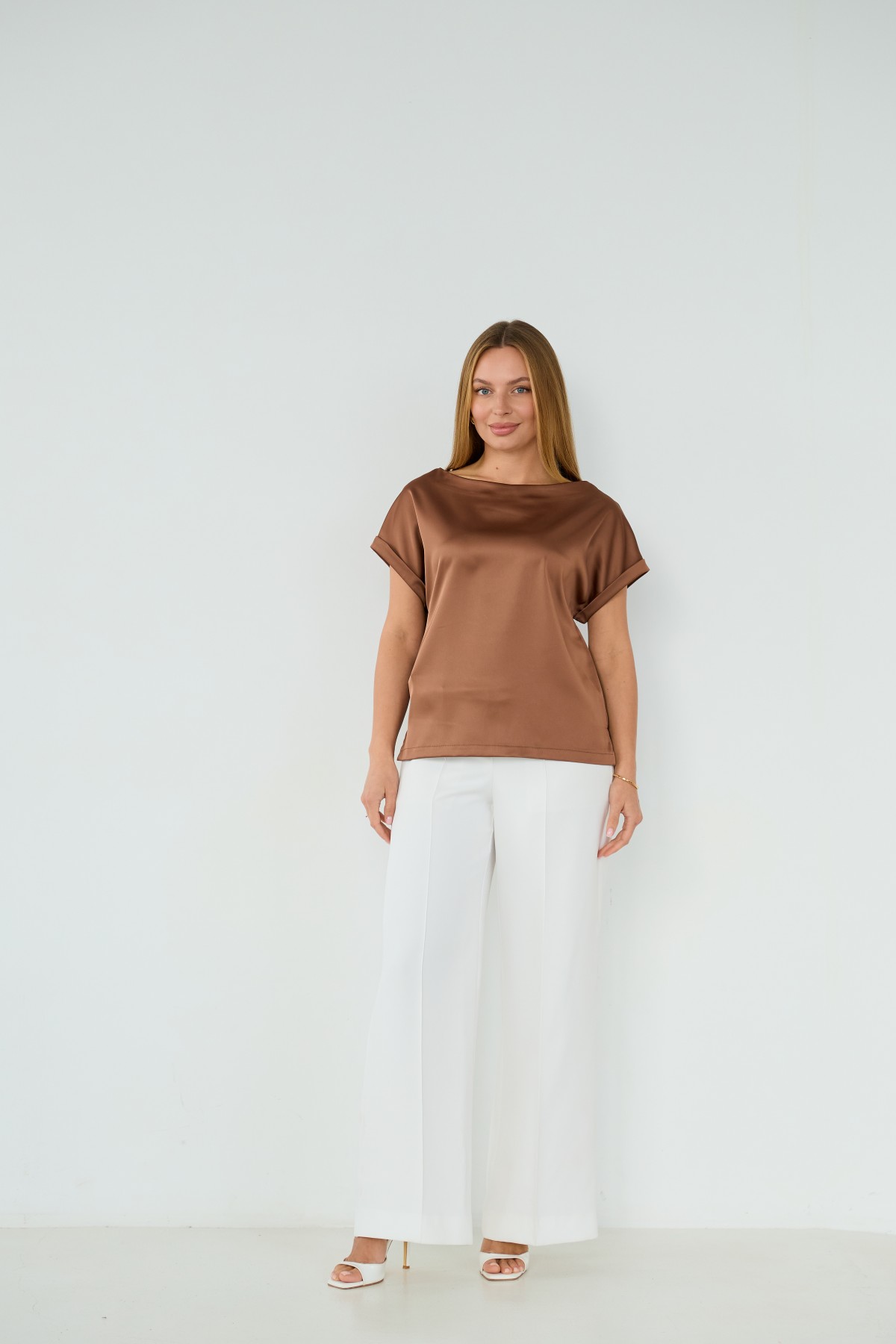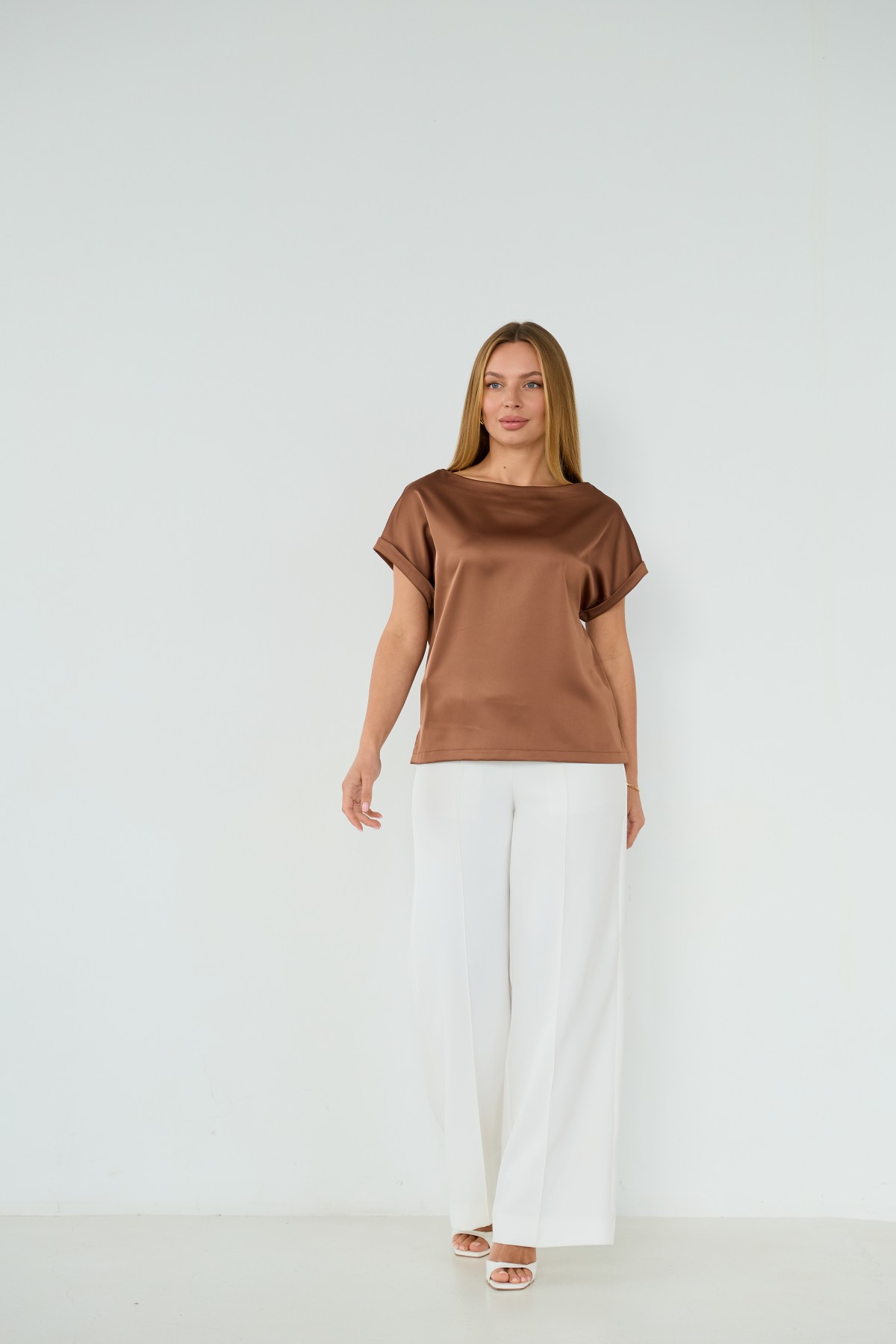 Свободна легка шелкова футболка з коротким рукавом, по боках є розрізи, довжиною до бедра. Класична практична футболка - блуза з атласного шелку дабл, проста, але у той же час таку річ можна одягати під різні варіанти брюк, спідниць, жакетів чи жилеток.