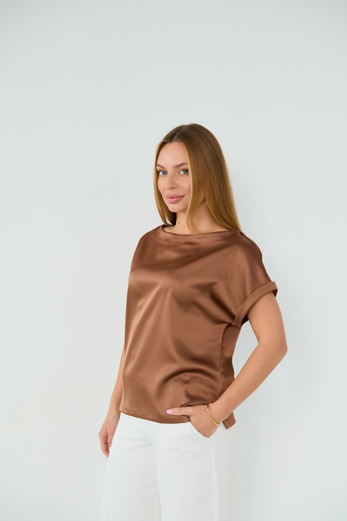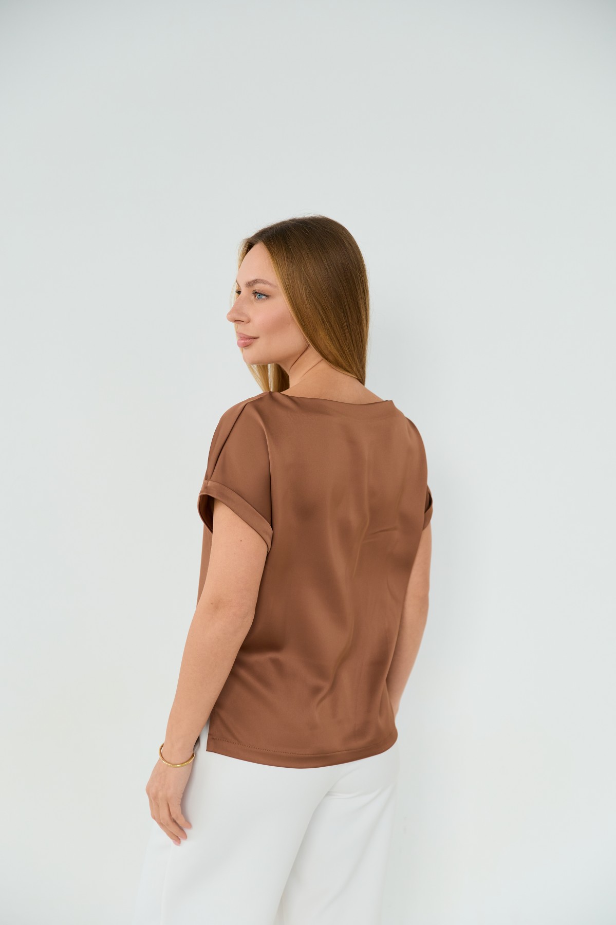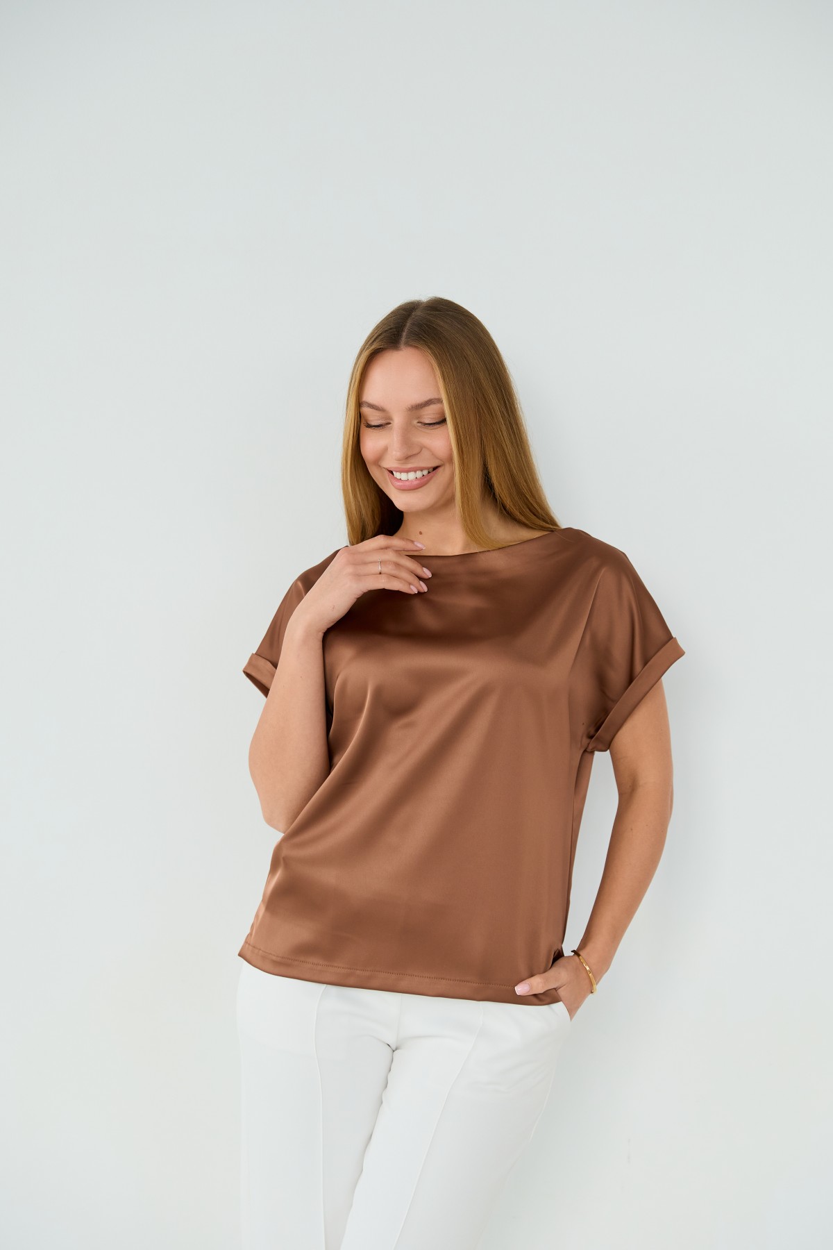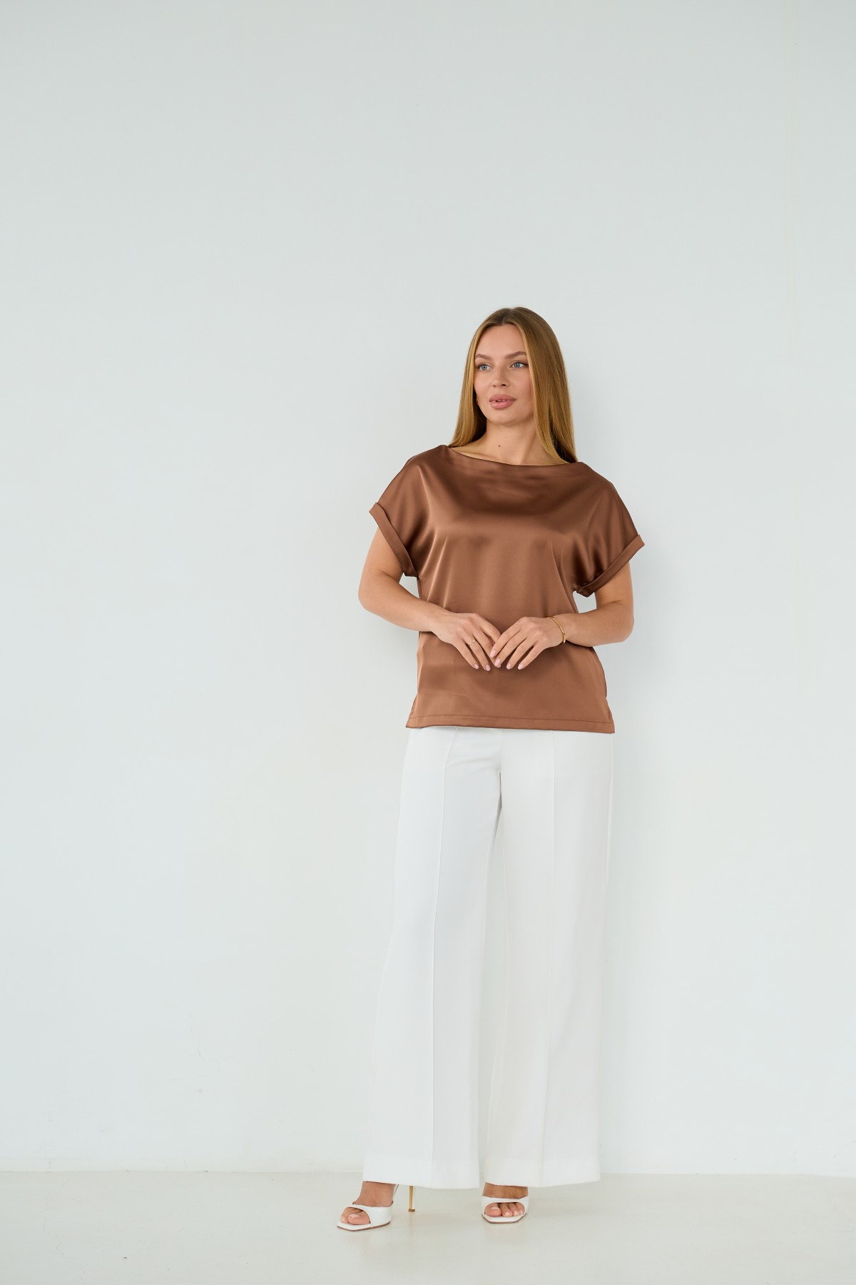 Свободна легка шелкова футболка з коротким рукавом, по боках є розрізи, довжиною до бедра. Класична практична футболка - блуза з атласного шелку дабл, проста, але у той же час таку річ можна одягати під різні варіанти брюк, спідниць, жакетів чи жилеток.