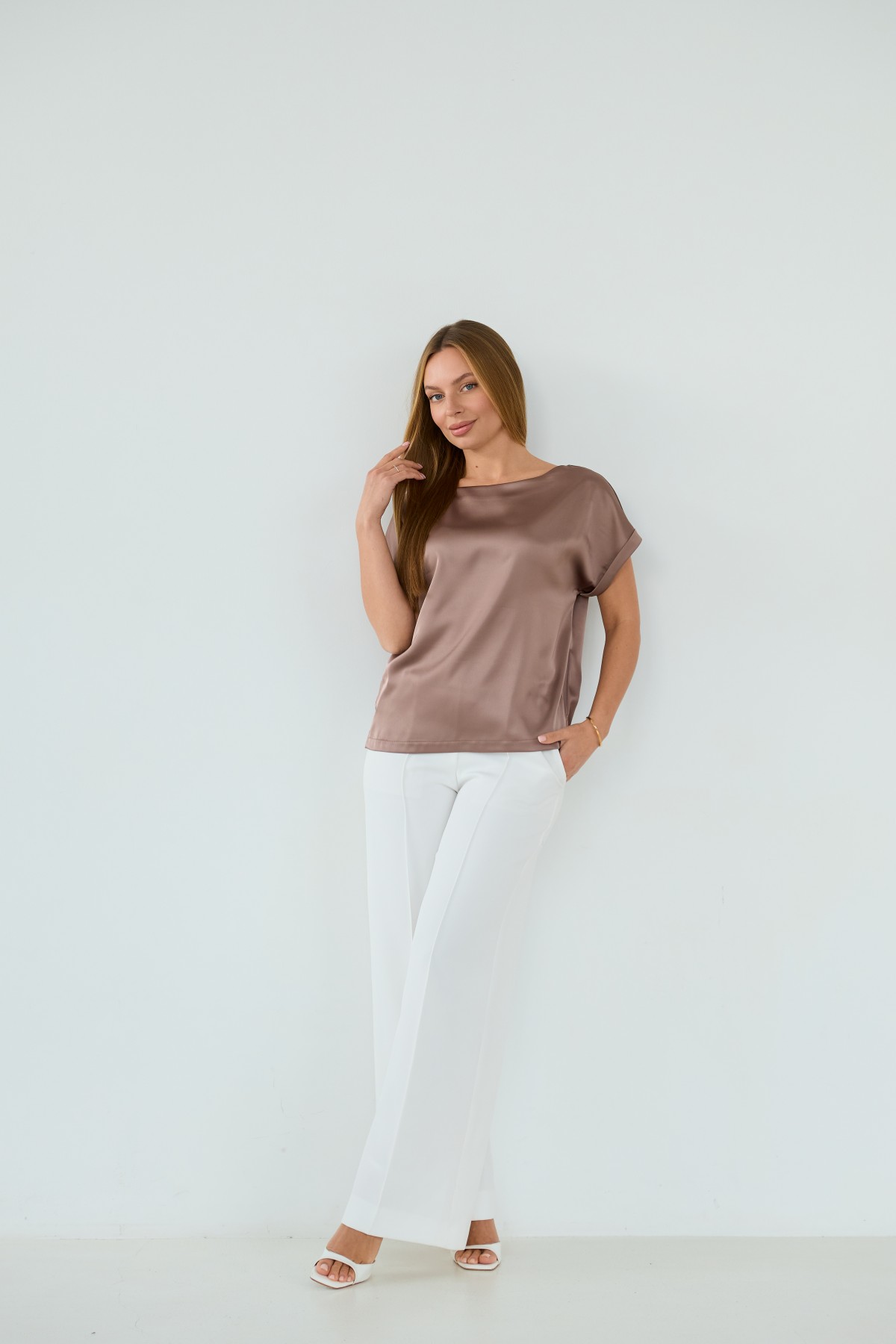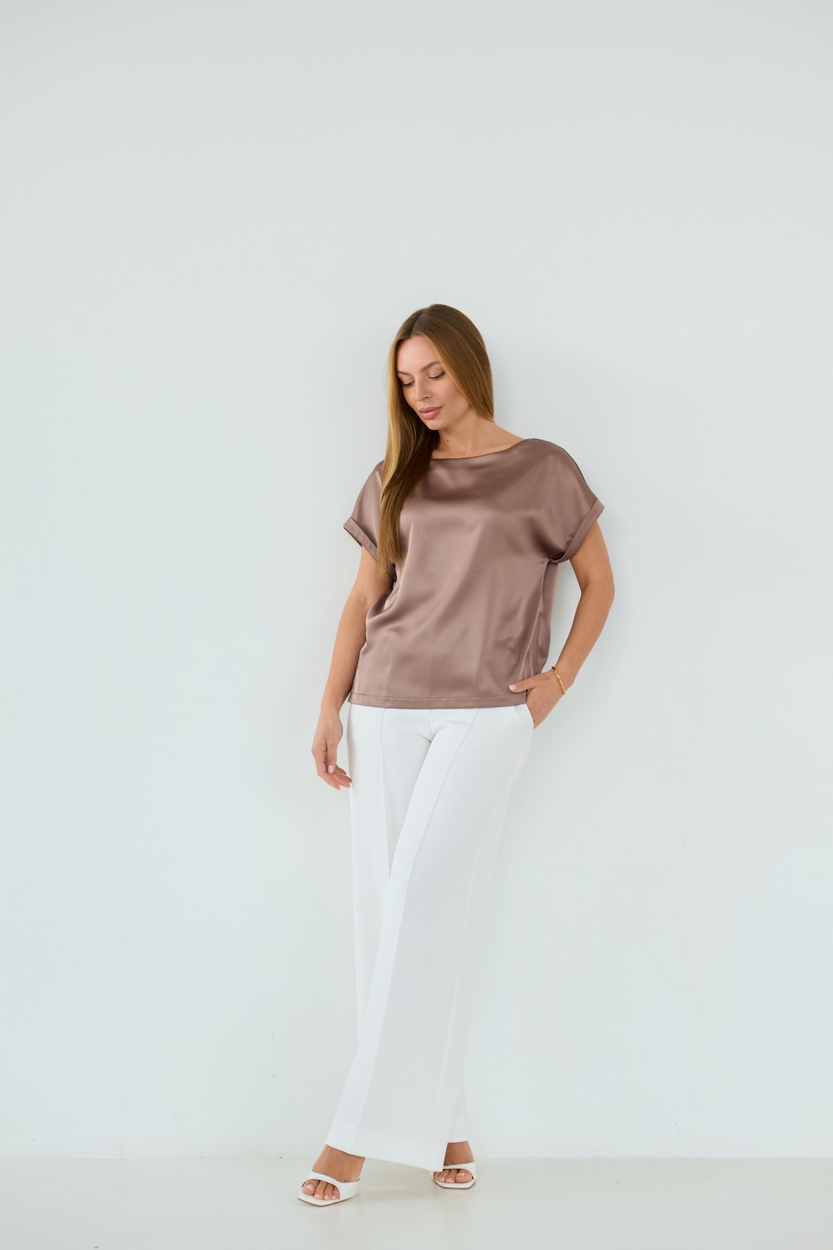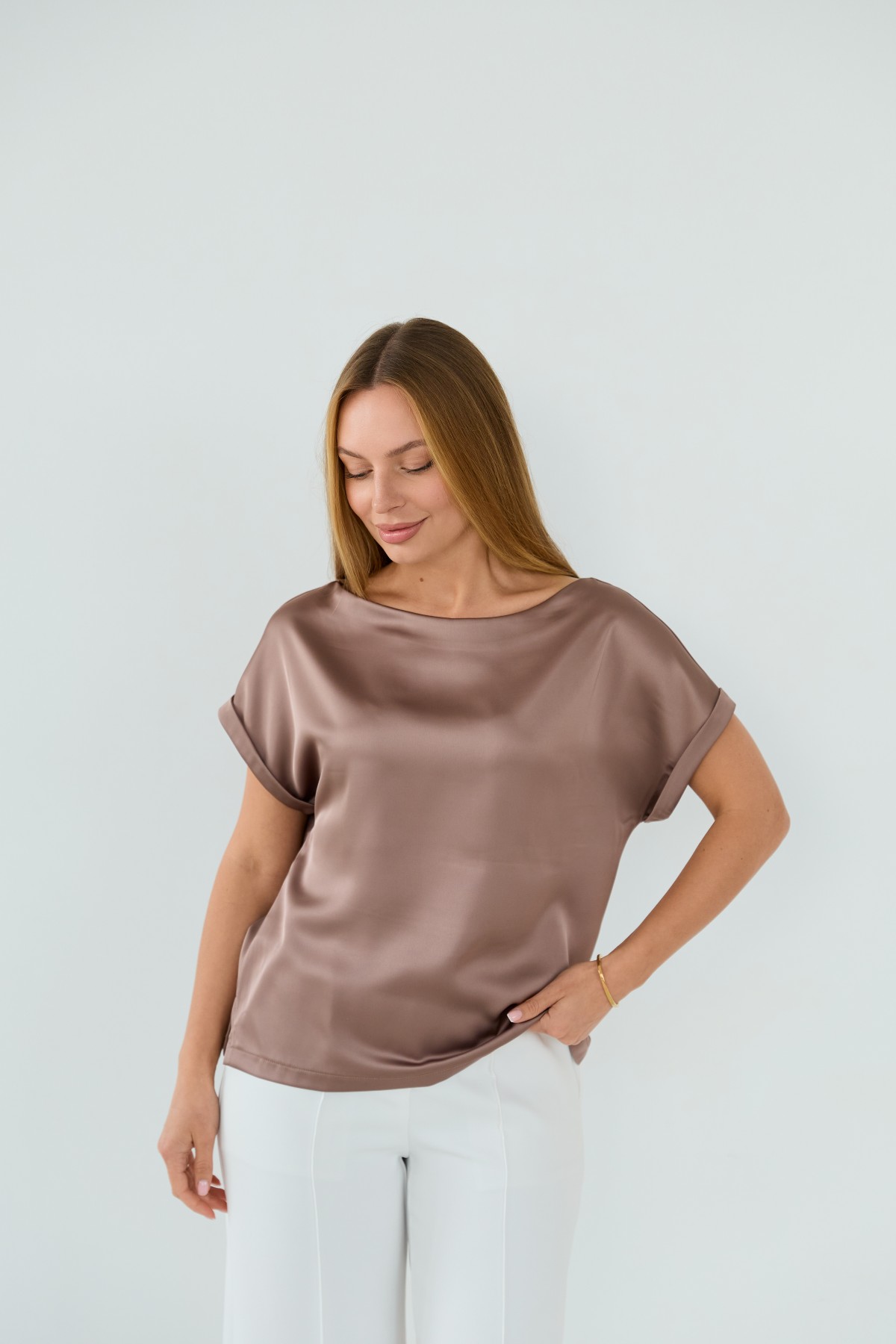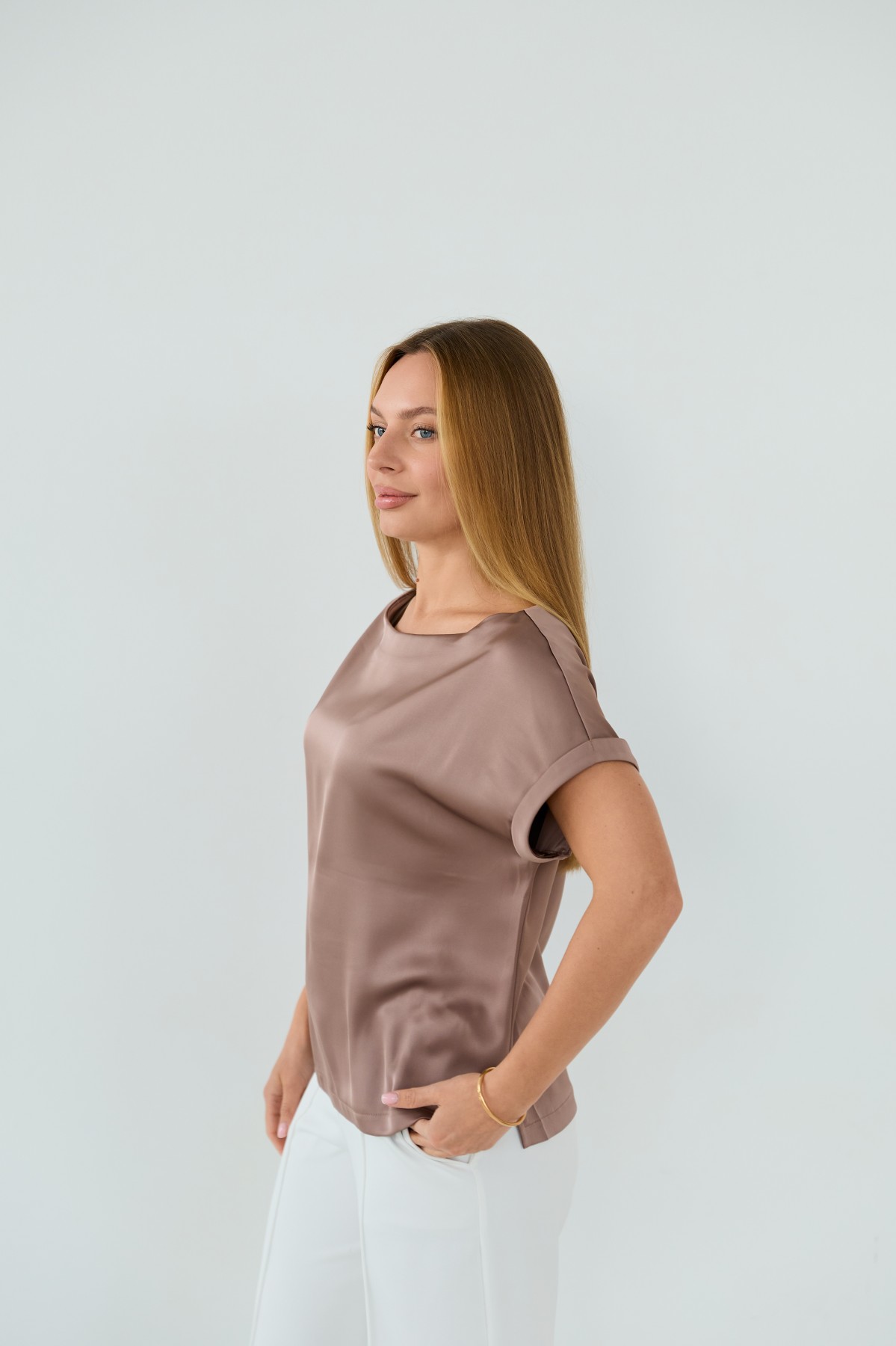 Свободна легка шелкова футболка з коротким рукавом, по боках є розрізи, довжиною до бедра. Класична практична футболка - блуза з атласного шелку дабл, проста, але у той же час таку річ можна одягати під різні варіанти брюк, спідниць, жакетів чи жилеток.