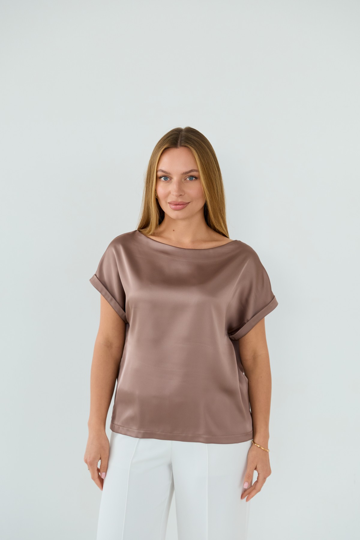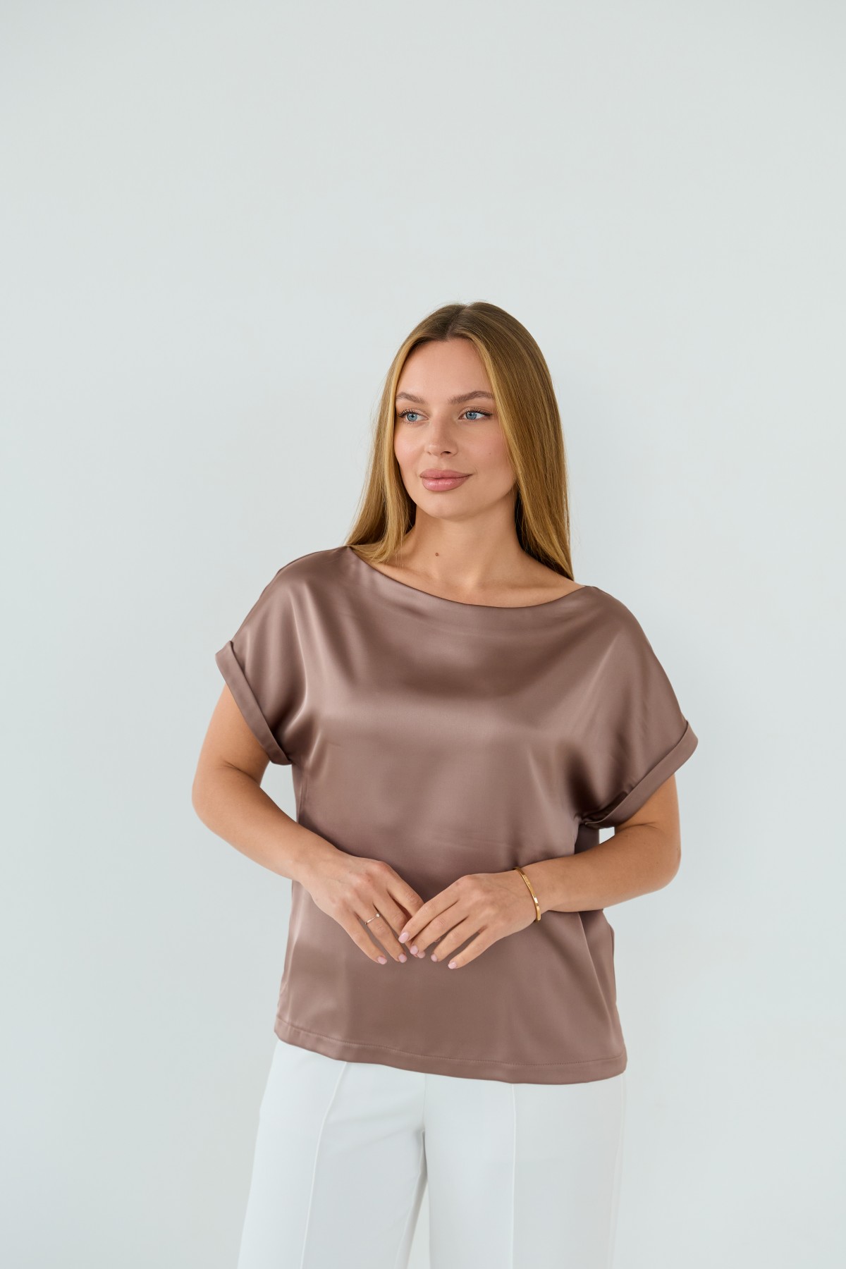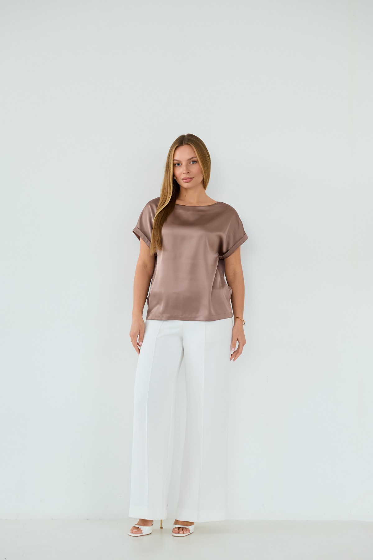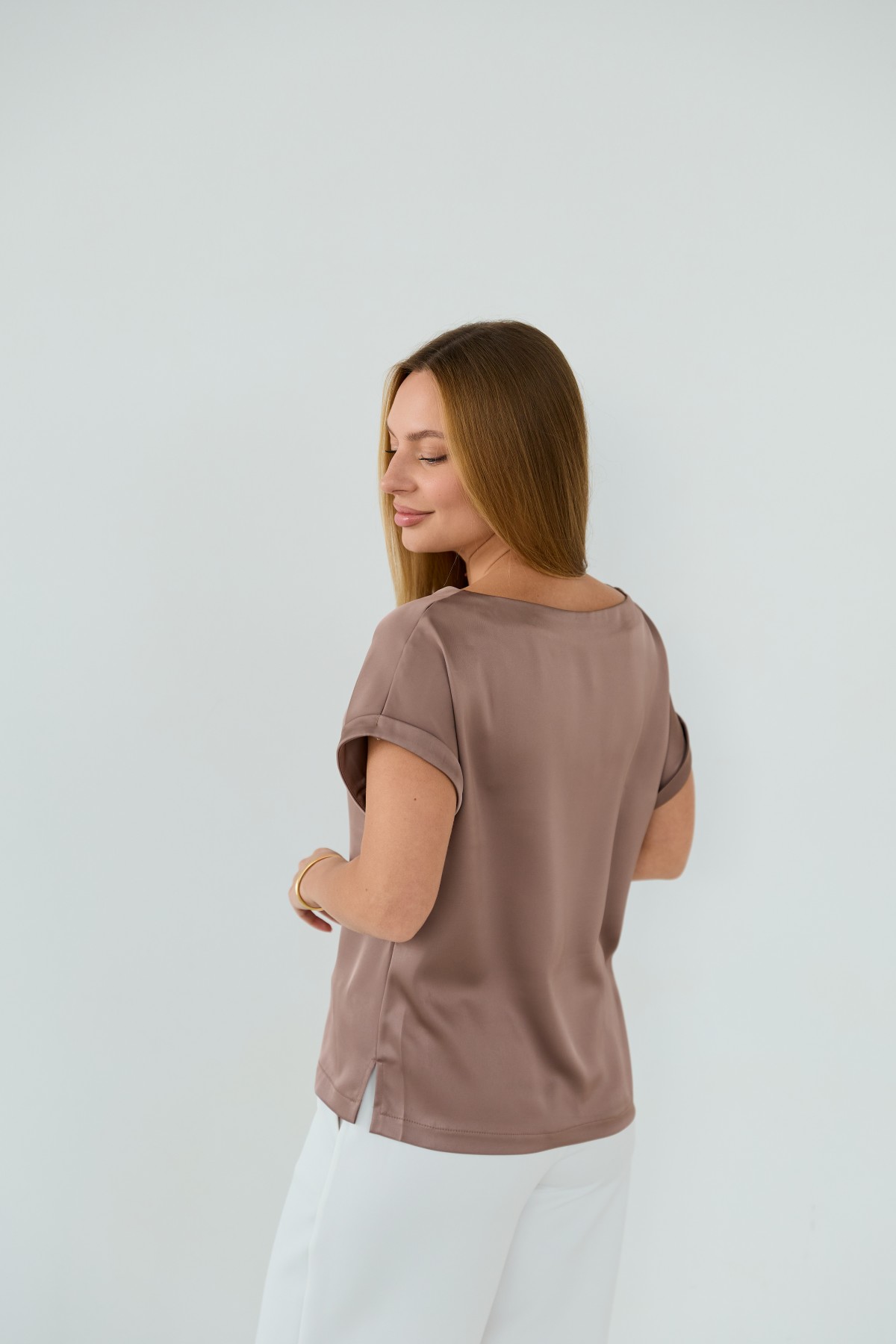 Свободна легка шелкова футболка з коротким рукавом, по боках є розрізи, довжиною до бедра. Класична практична футболка - блуза з атласного шелку дабл, проста, але у той же час таку річ можна одягати під різні варіанти брюк, спідниць, жакетів чи жилеток.