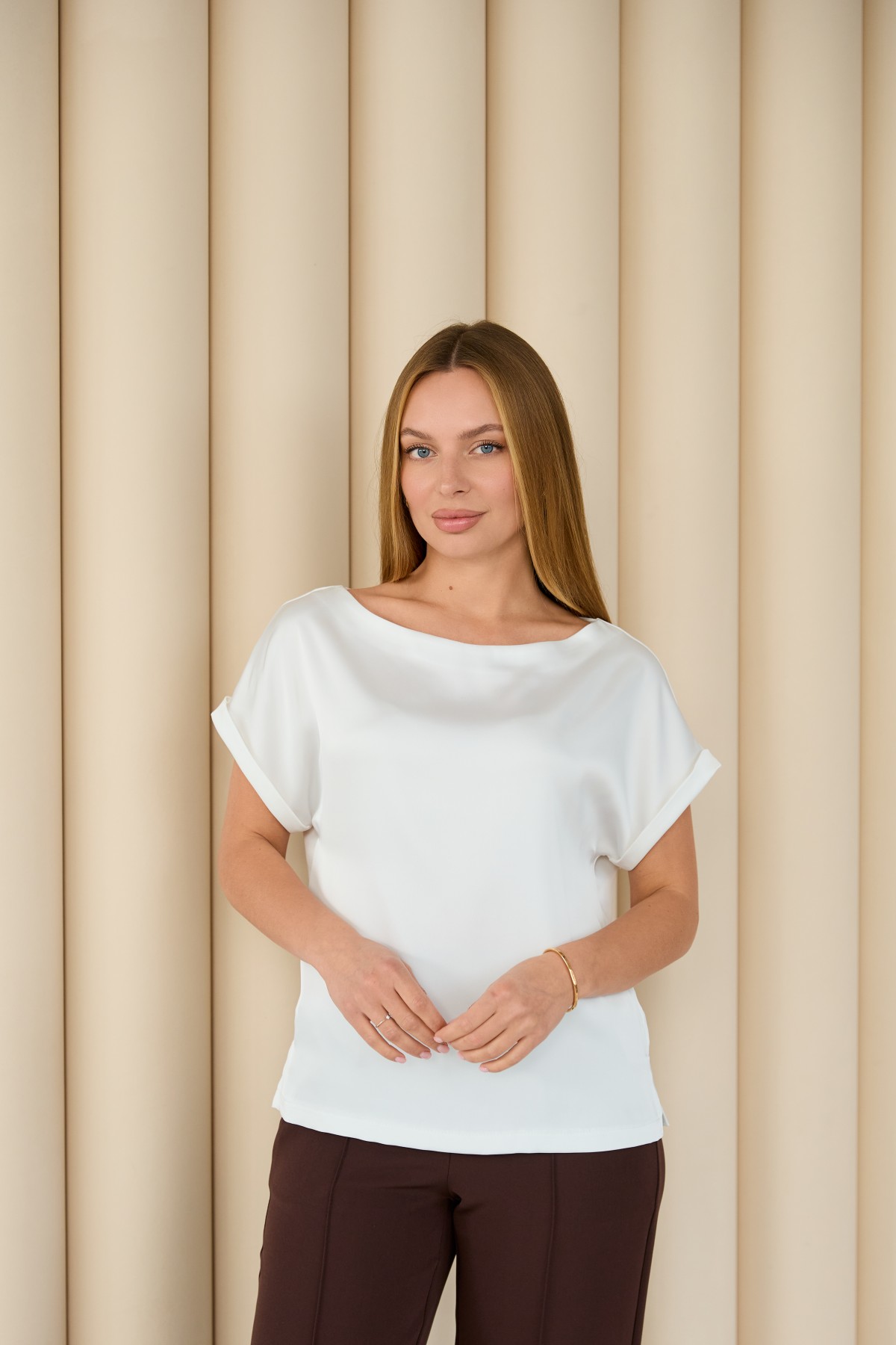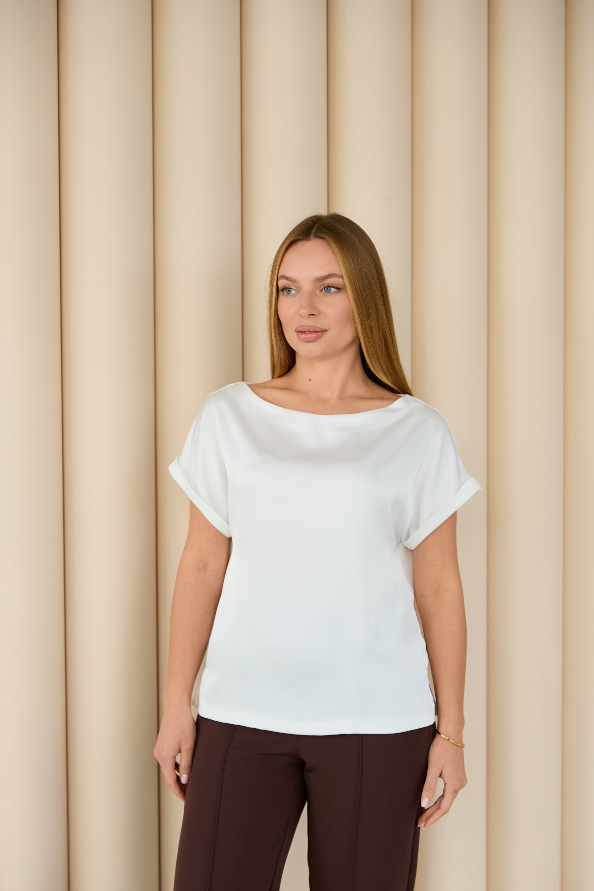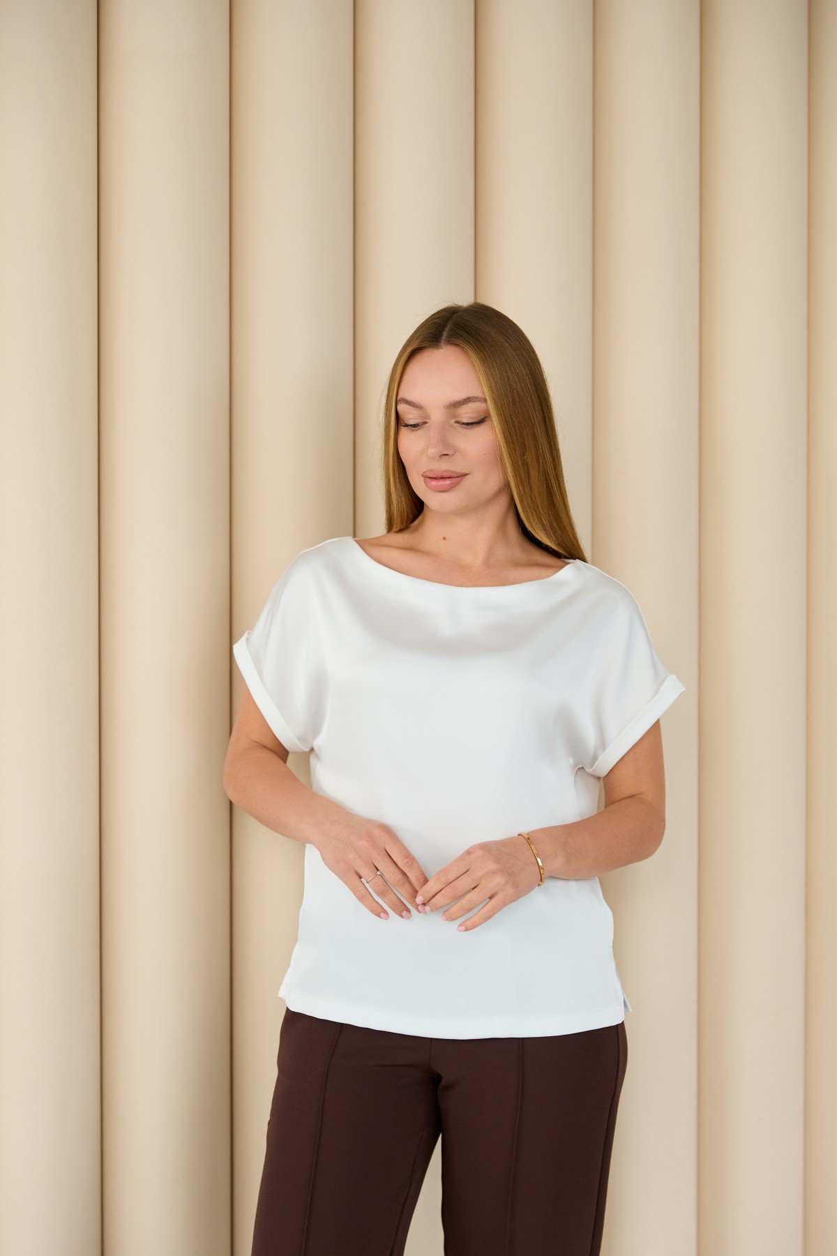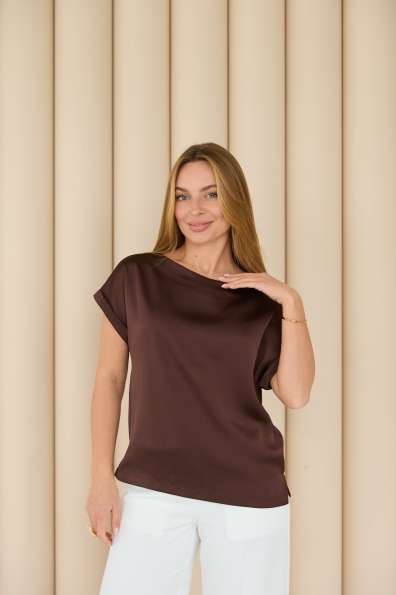 Свободна легка шелкова футболка з коротким рукавом, по боках є розрізи, довжиною до бедра. Класична практична футболка - блуза з атласного шелку дабл, проста, але у той же час таку річ можна одягати під різні варіанти брюк, спідниць, жакетів чи жилеток.