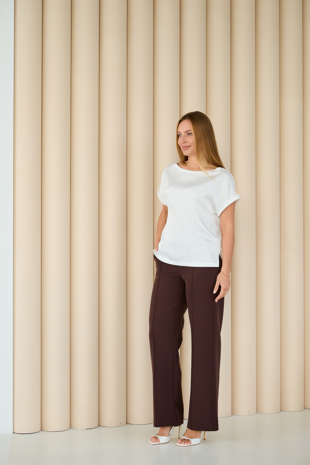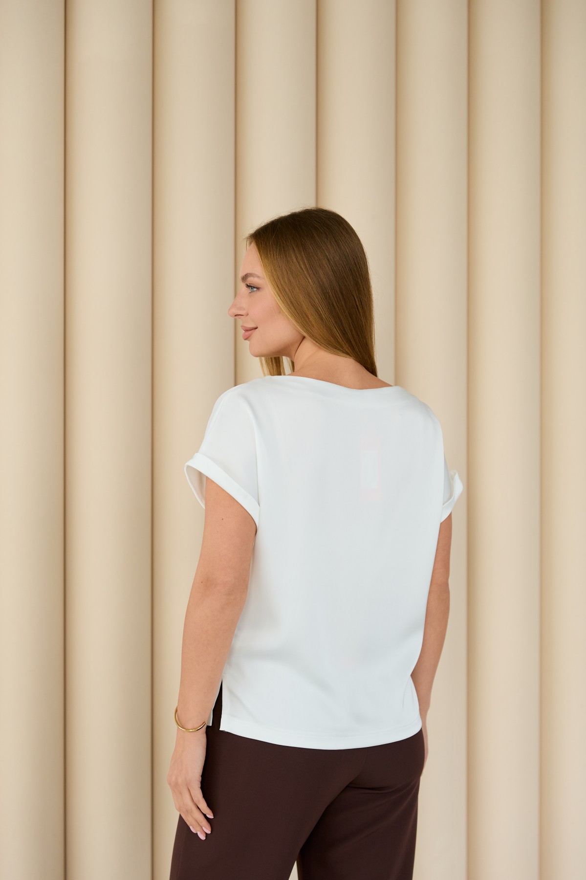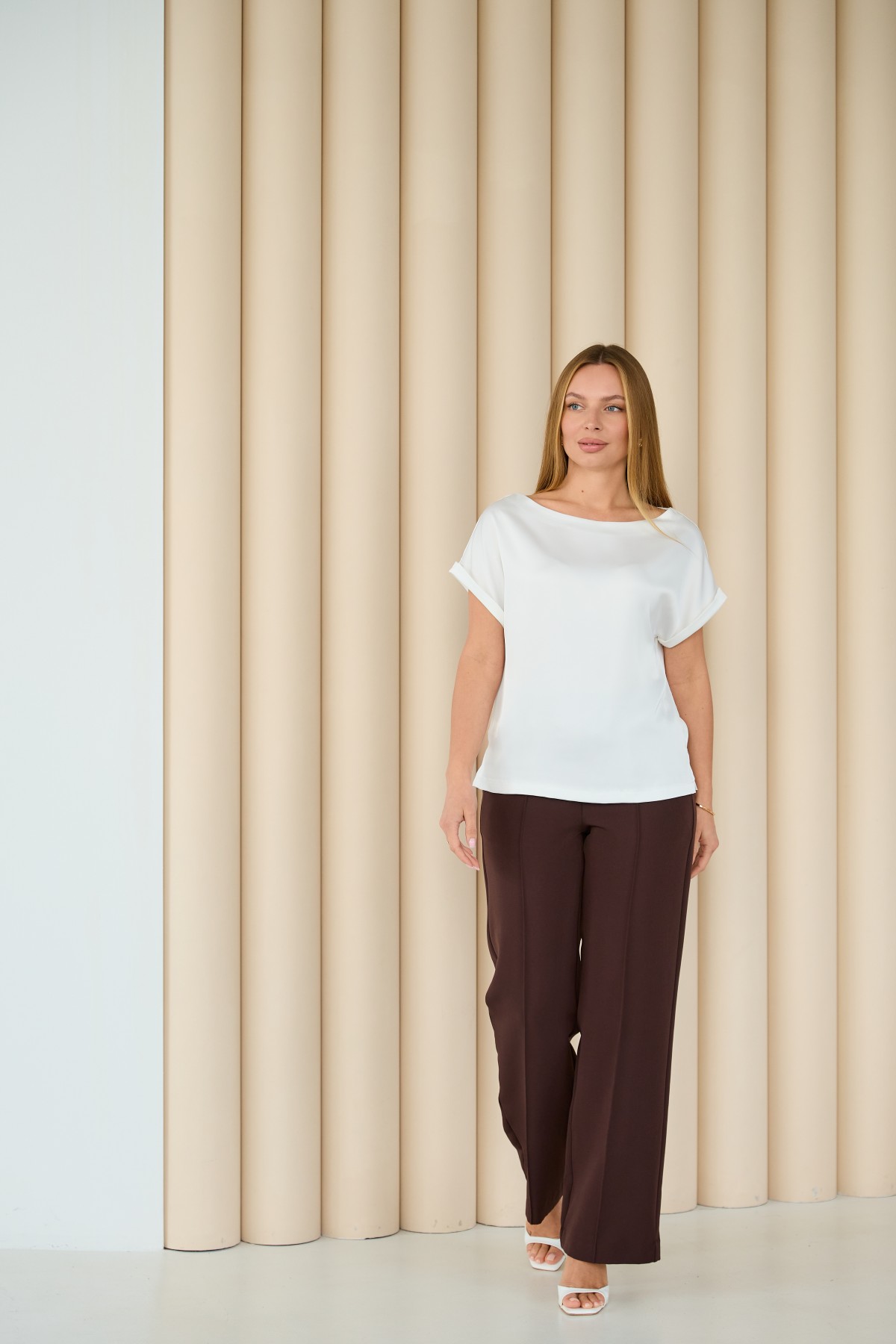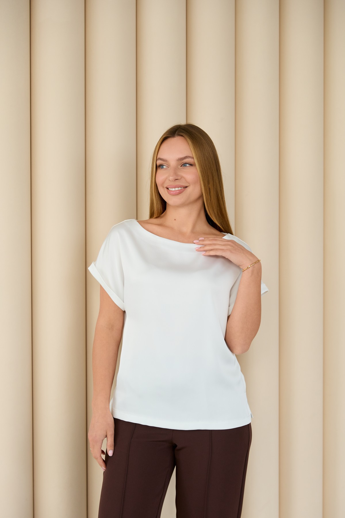 Свободна легка шелкова футболка з коротким рукавом, по боках є розрізи, довжиною до бедра. Класична практична футболка - блуза з атласного шелку дабл, проста, але у той же час таку річ можна одягати під різні варіанти брюк, спідниць, жакетів чи жилеток.